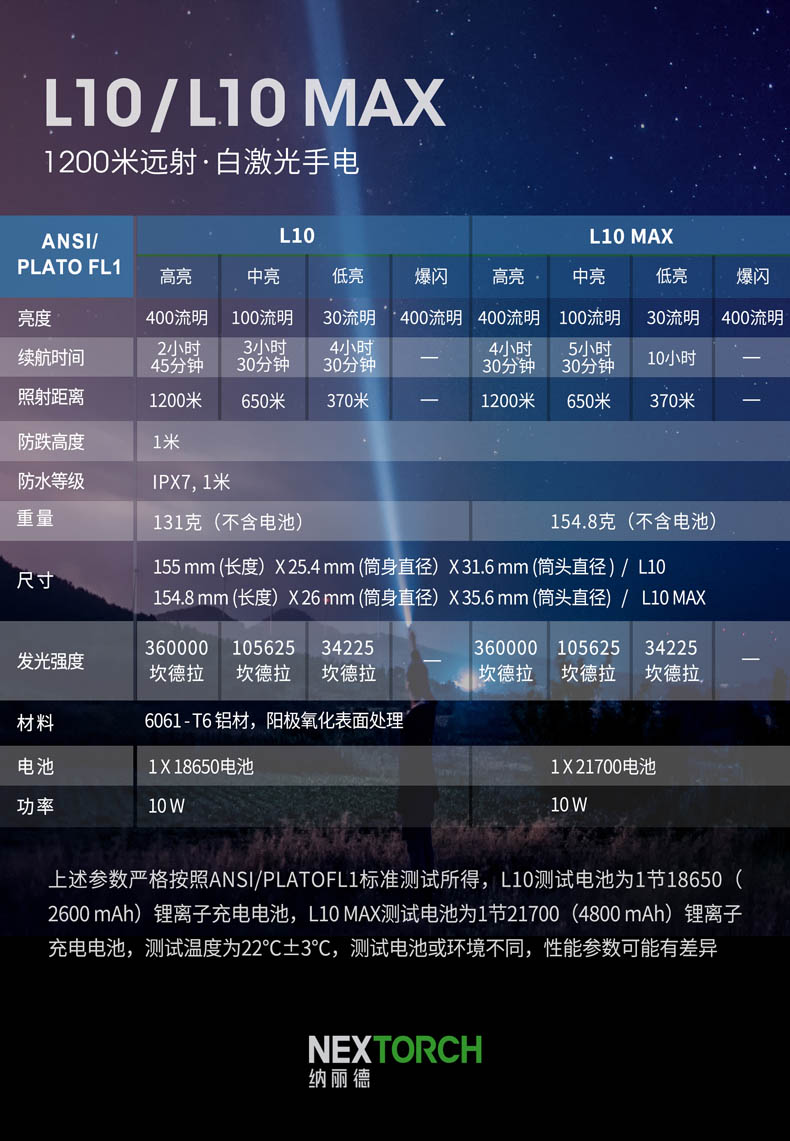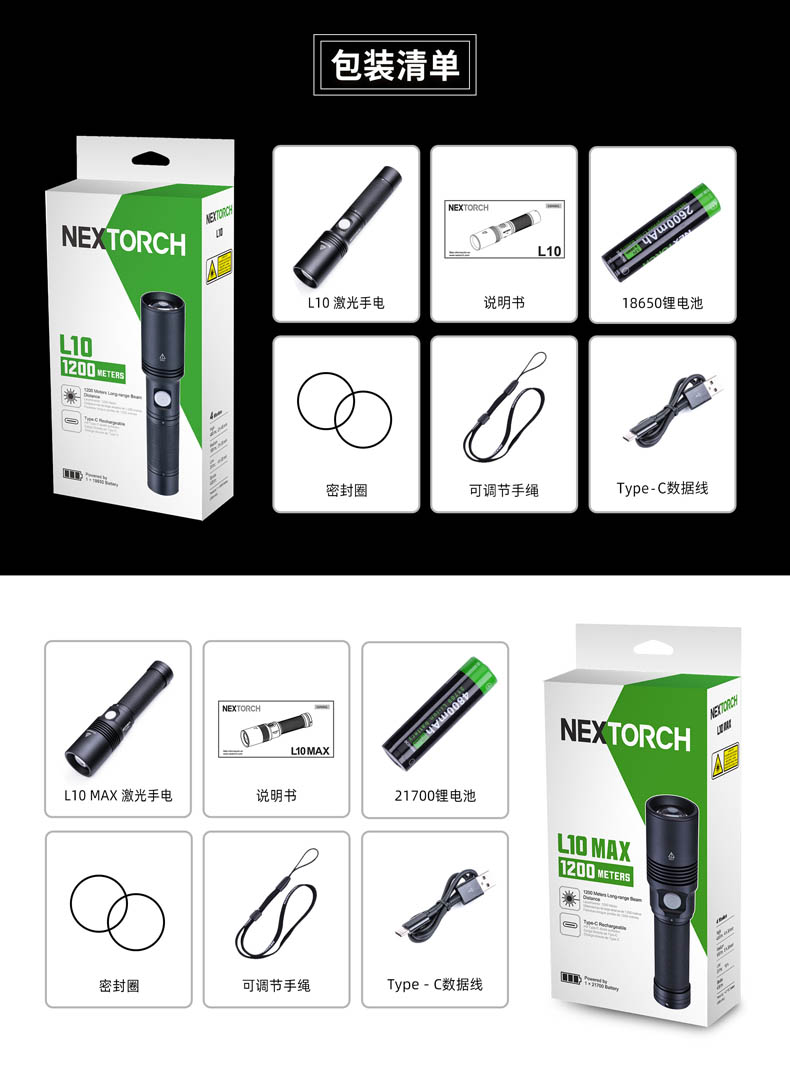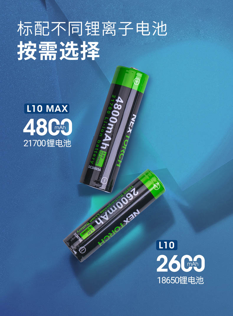 • • 电池:L10/1节18650锂离子电池 / L10 MAX/1节21700锂离子电池