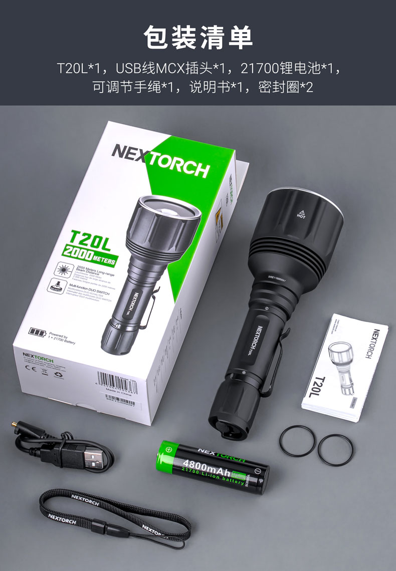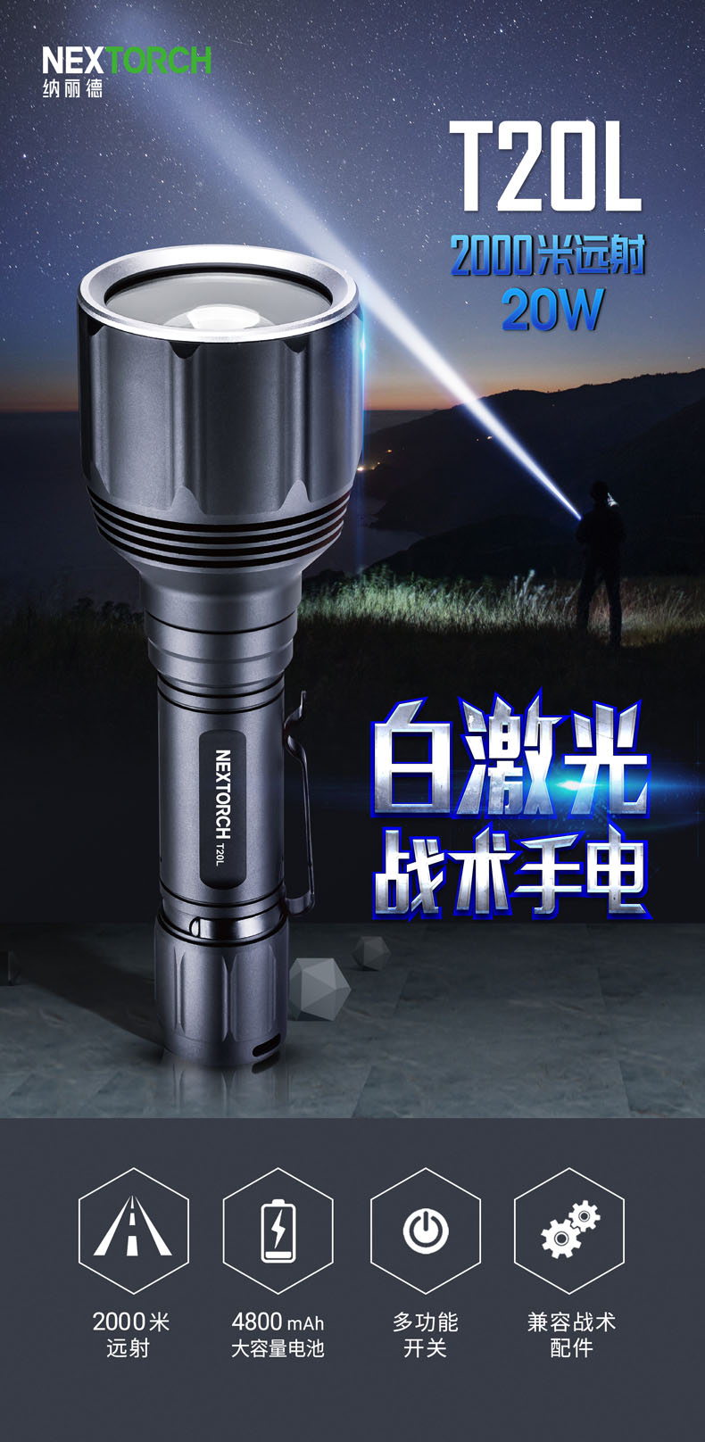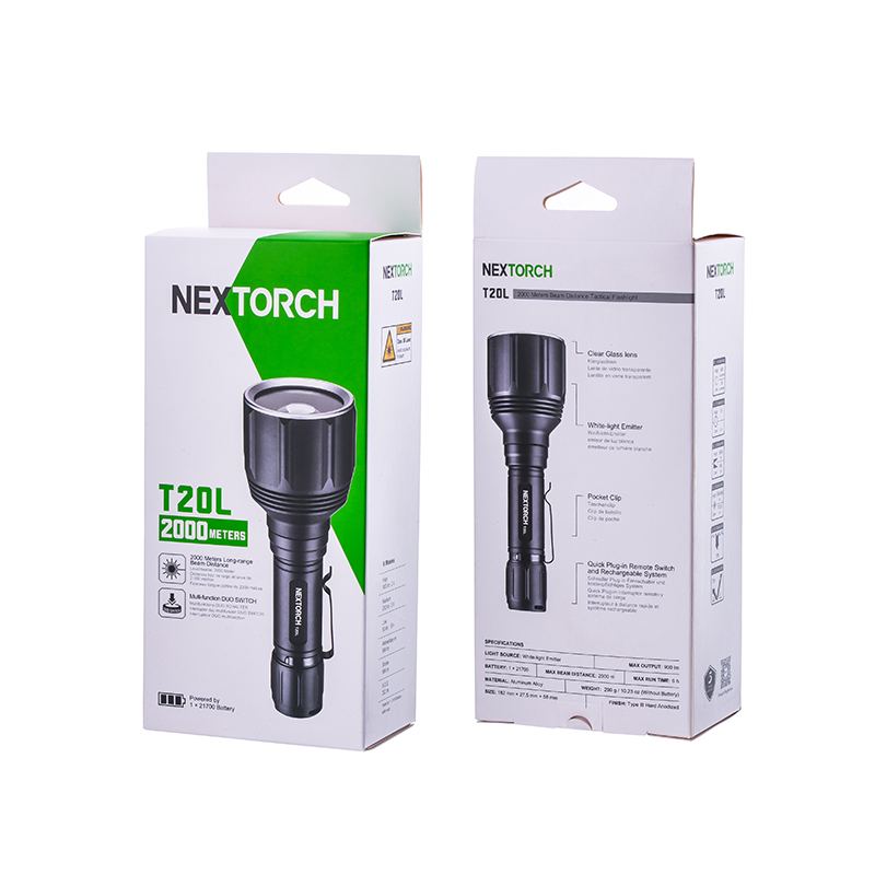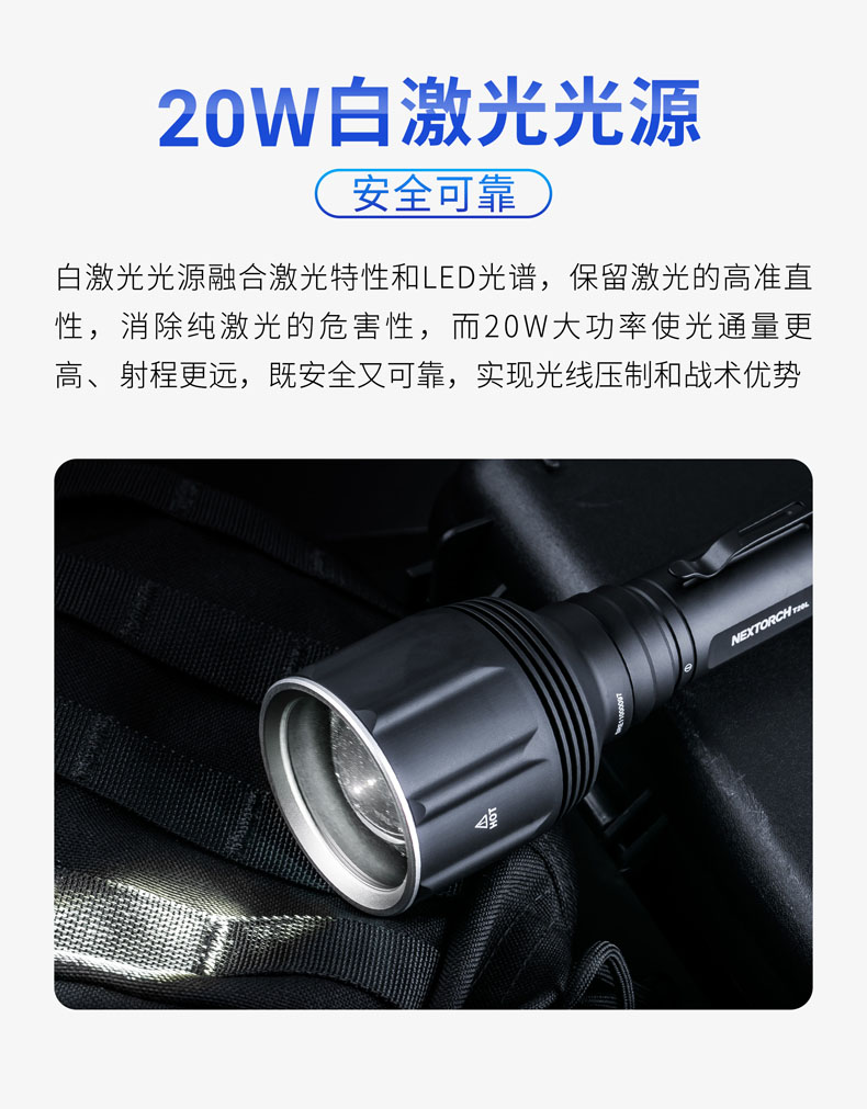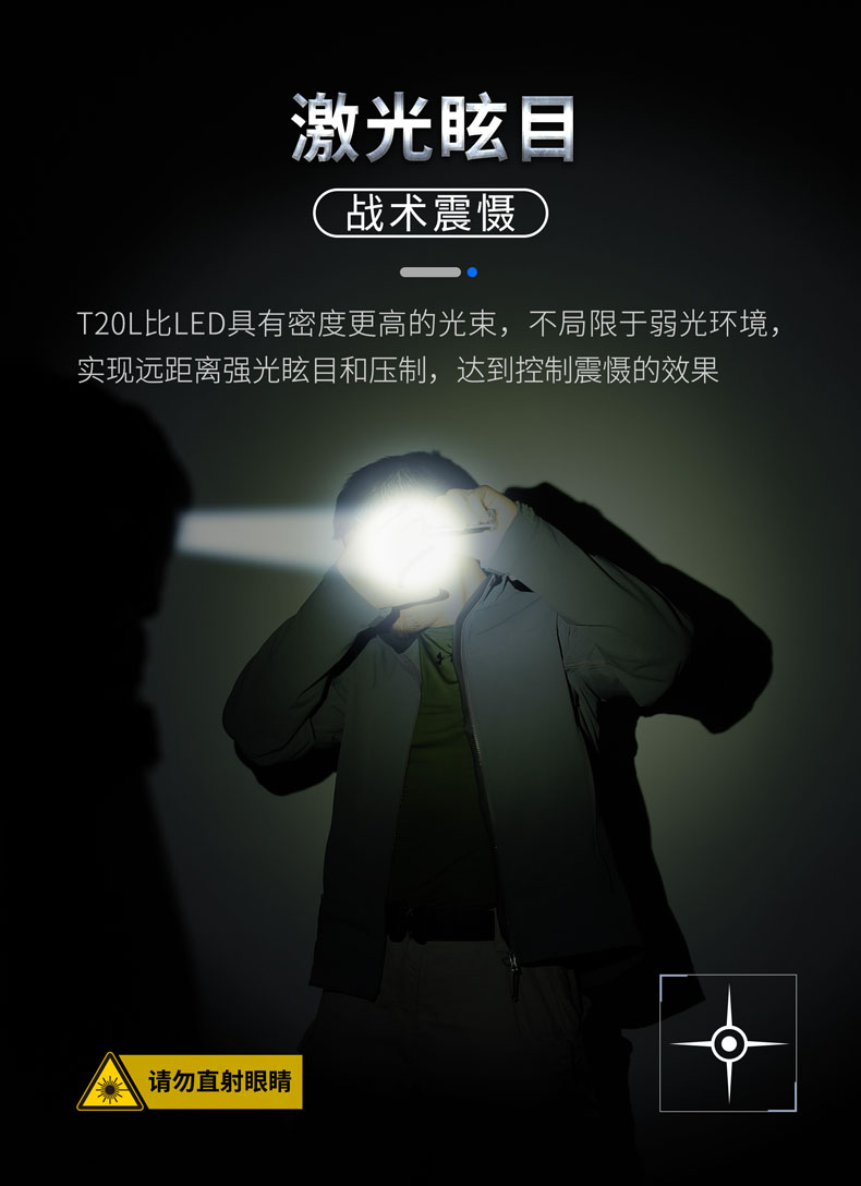 T20L是一款20W的白激光战术手电,可达2000米远射和900流明高亮,在黑暗中不受视野限制。T20L以高密度光束、高准直性达到超强指向性、激光炫目和干扰破坏设备成像,实现精准追踪和战术震慑,可以应用于战术、巡逻执勤、救援搜索等场景。多功能战术开关轻松切换6种模式,USB直充设计,鼠尾开关、USB接口二合一,让手电的使用更得心应手。
