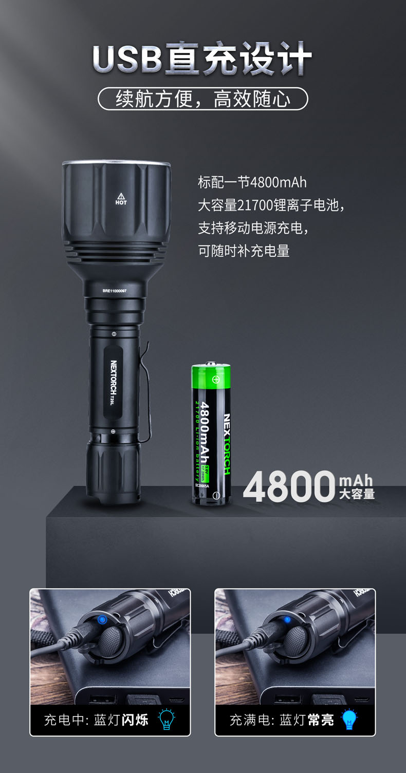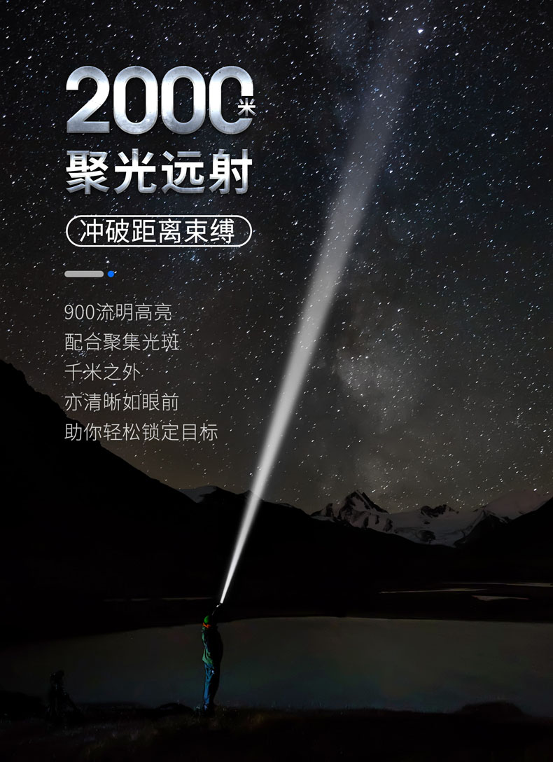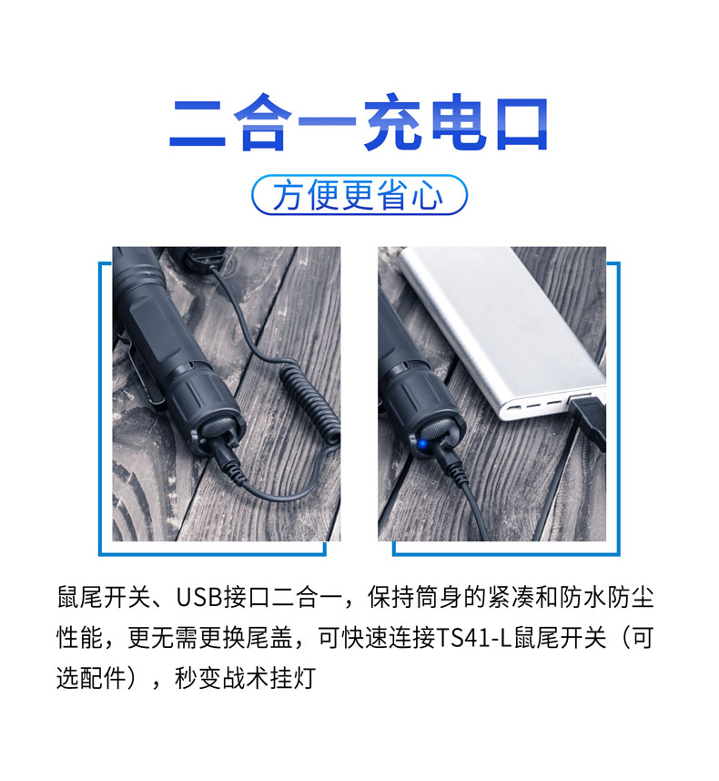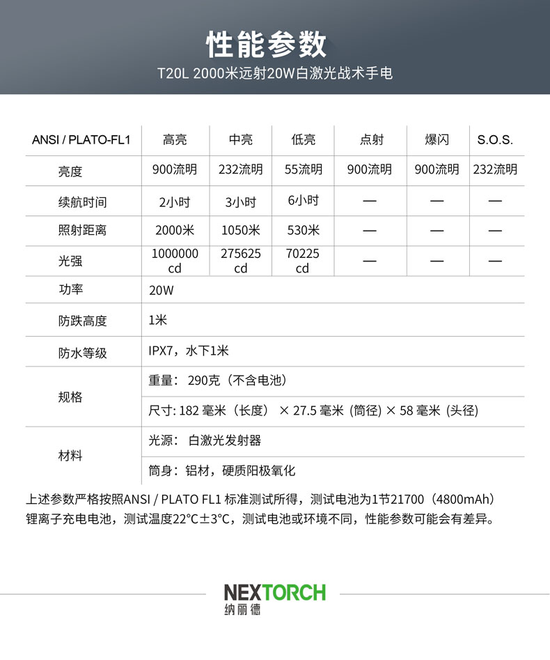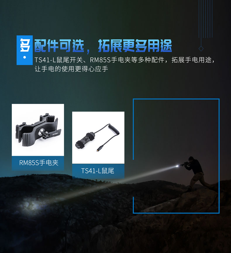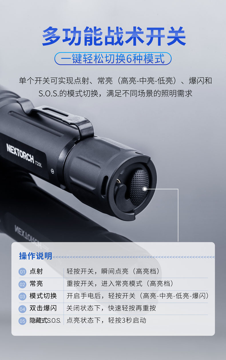T20L是一款20W的白激光战术手电,可达2000米远射和900流明高亮,在黑暗中不受视野限制。T20L以高密度光束、高准直性达到超强指向性、激光炫目和干扰破坏设备成像,实现精准追踪和战术震慑,可以应用于战术、巡逻执勤、救援搜索等场景。多功能战术开关轻松切换6种模式,USB直充设计,鼠尾开关、USB接口二合一,让手电的使用更得心应手。