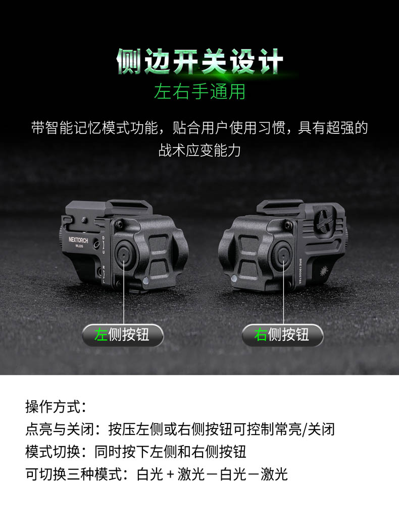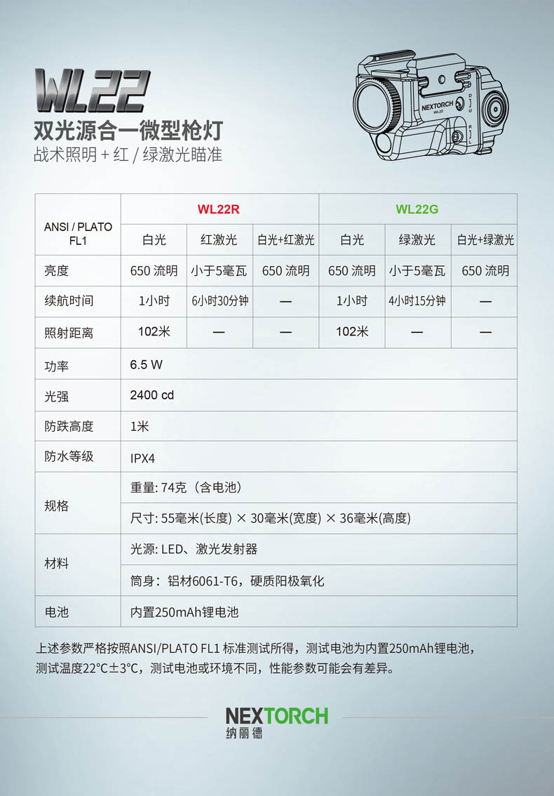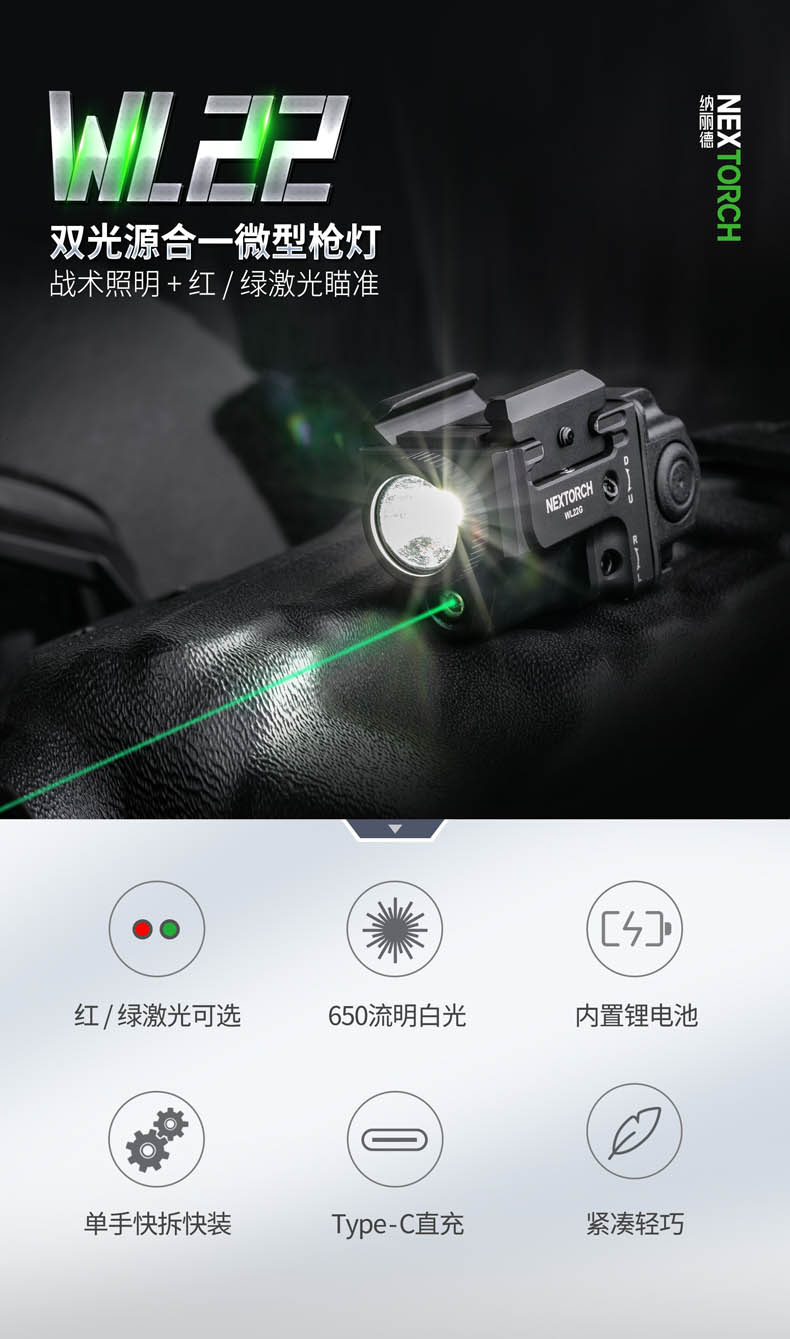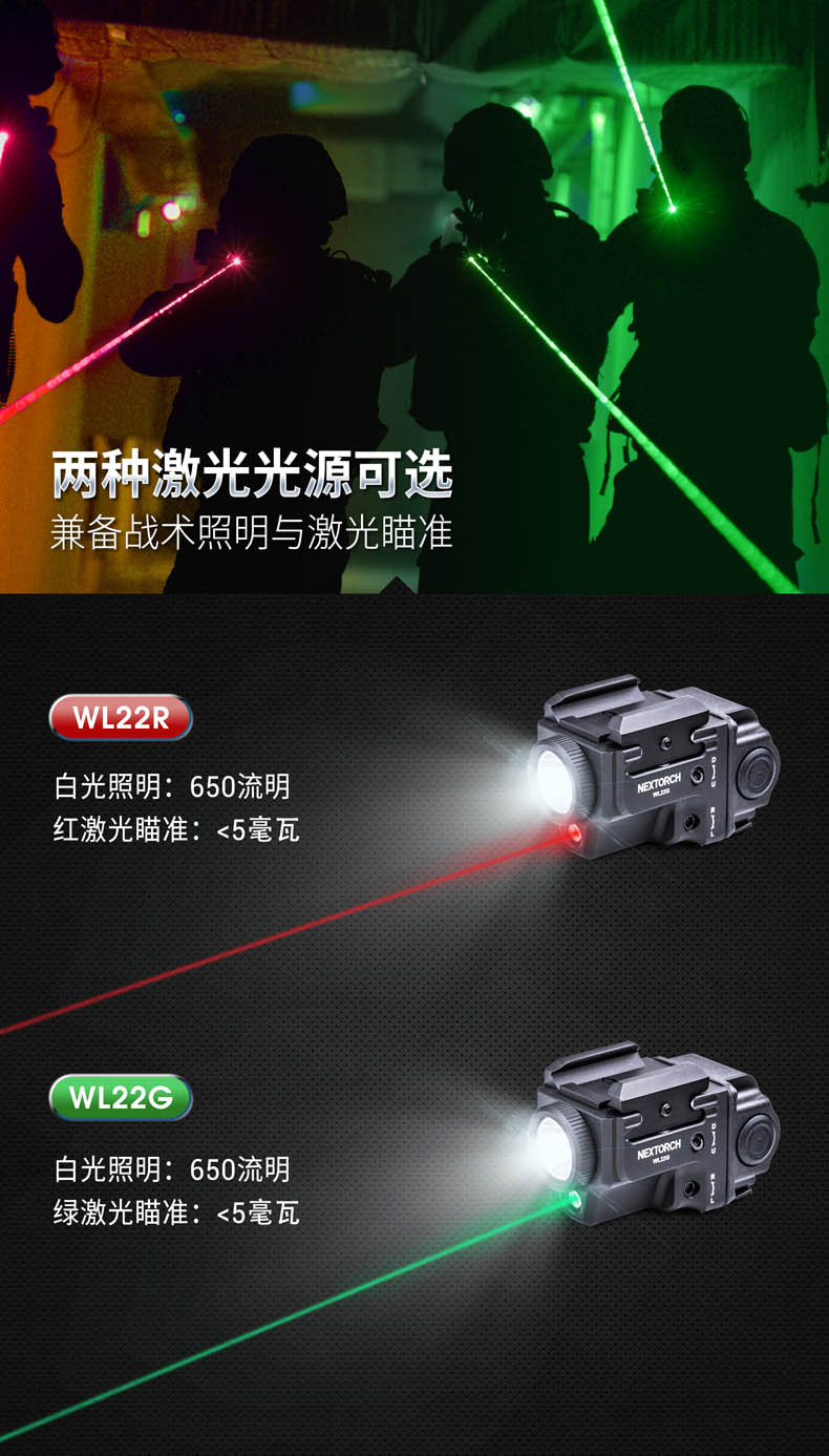 纳丽德WL22双光源合一枪灯,整合照明识别和激光瞄准功能,更能够辅助射击或震慑潜在的攻击威胁。提供WL22G白光照明+绿激光瞄准、WL22R白光照明+红激光瞄准,可根据不同任务需求适当搭配,成为暗弱光执法下的有效助力。适配紧凑型和全尺寸枪型,及适配大部分带灯仓的枪套。