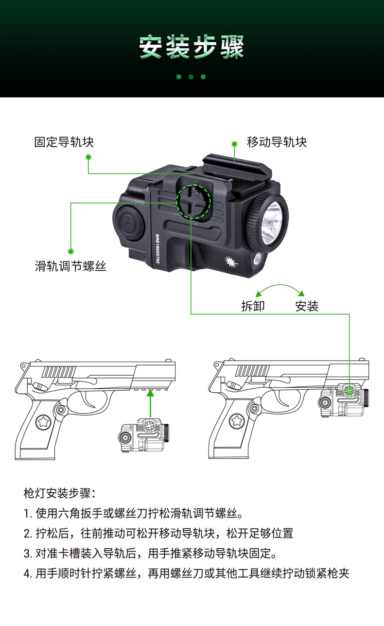 • • 亮度:白光照明650流明/红激光<5毫瓦/白光+红激光650流明/绿激光<5毫瓦/白光+绿激光650流明