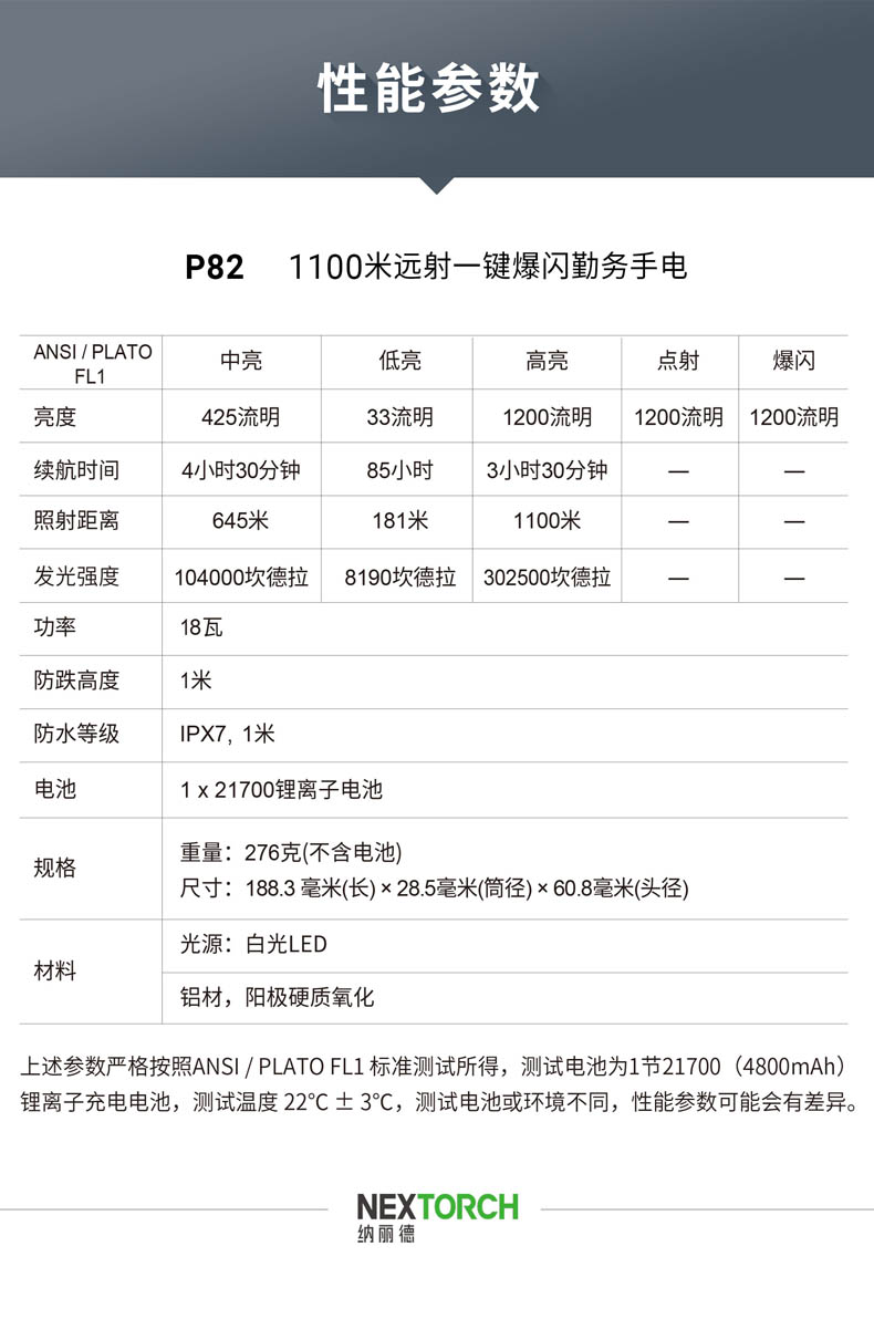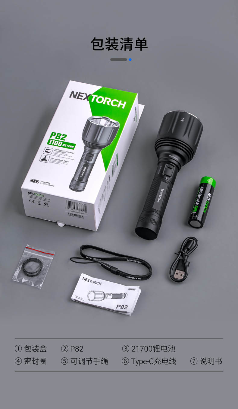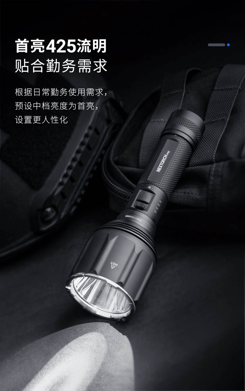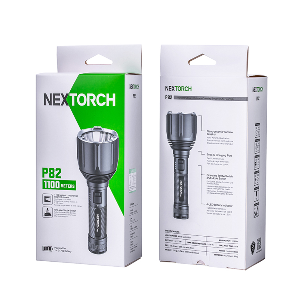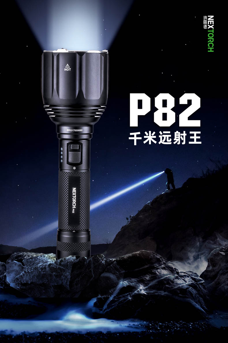 P82是一款搜索、勤务手电,采用光密度比市场高40%以上的高光密度LED和圆形发光芯片,实现超远射的同时,光斑效果也更好,目视更舒适。1200流明高亮和1100米远射,在黑夜里看得更广更远,适用于执法、救援、巡逻、户外探险、搜索定位等场景;设置中亮425流明作为首亮,更贴合勤务的使用习惯;采用双侧按开关,融合一键爆闪和模式切换,操作简单;陶瓷珠攻击头和一键爆闪相配合,达到攻防兼备的效果;21700锂电池、Type-C直充、电量显示等缓解电量焦虑。