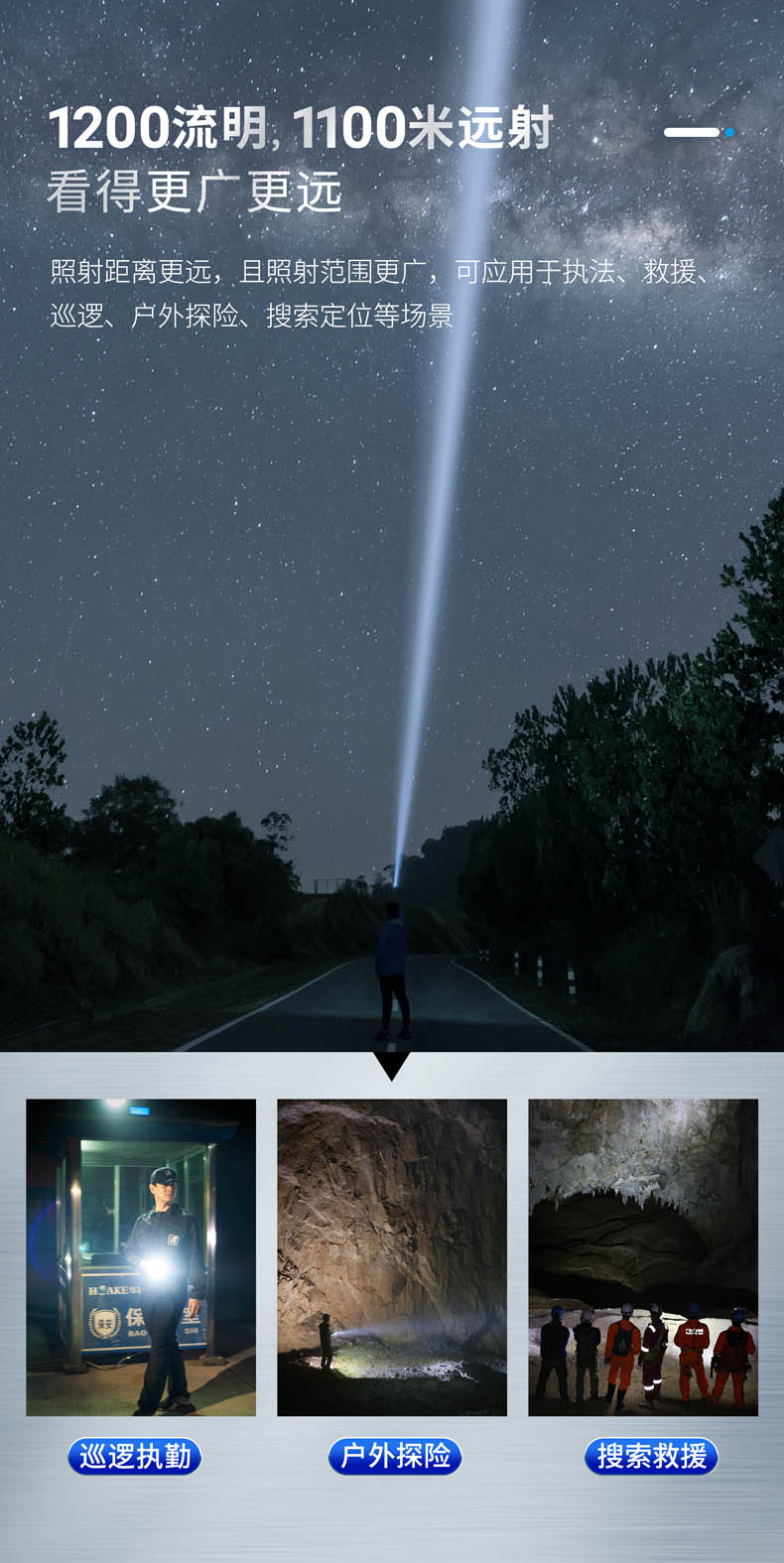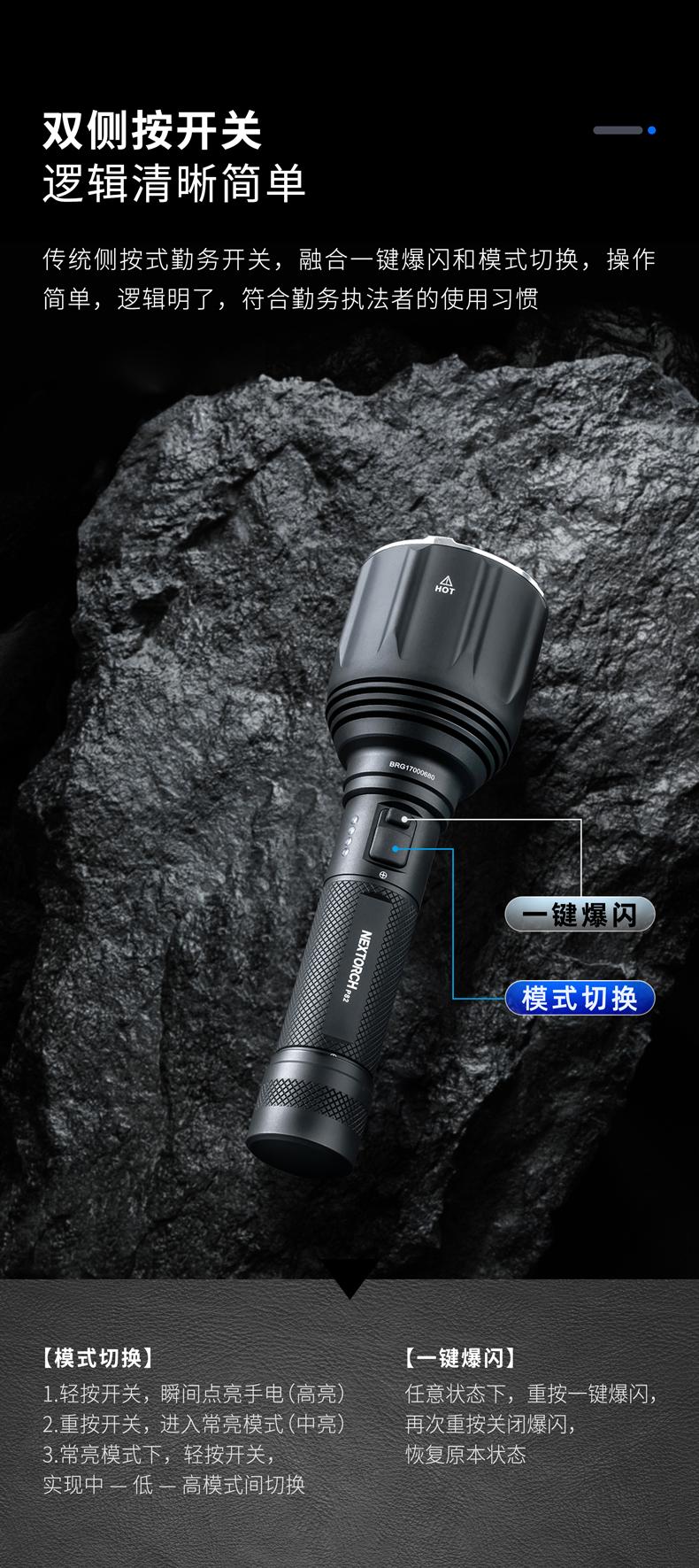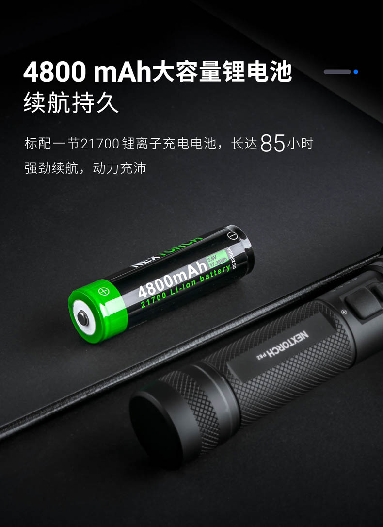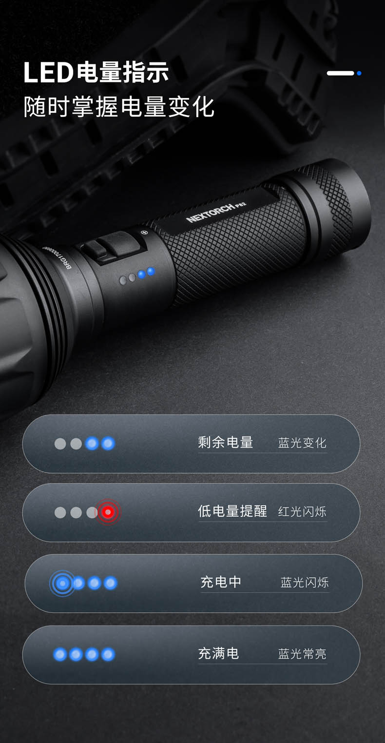 P82是一款搜索、勤务手电,采用光密度比市场高40%以上的高光密度LED和圆形发光芯片,实现超远射的同时,光斑效果也更好,目视更舒适。1200流明高亮和1100米远射,在黑夜里看得更广更远,适用于执法、救援、巡逻、户外探险、搜索定位等场景;设置中亮425流明作为首亮,更贴合勤务的使用习惯;采用双侧按开关,融合一键爆闪和模式切换,操作简单;陶瓷珠攻击头和一键爆闪相配合,达到攻防兼备的效果;21700锂电池、Type-C直充、电量显示等缓解电量焦虑。