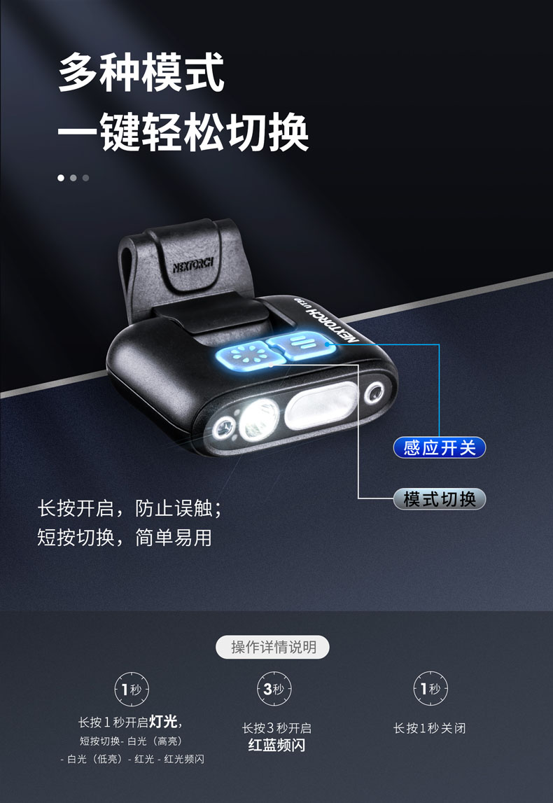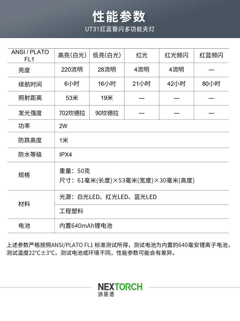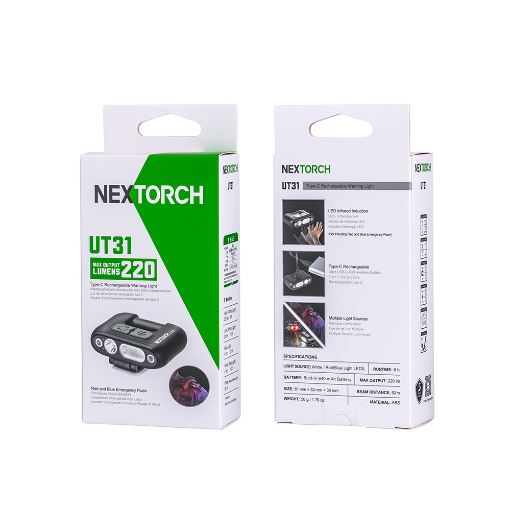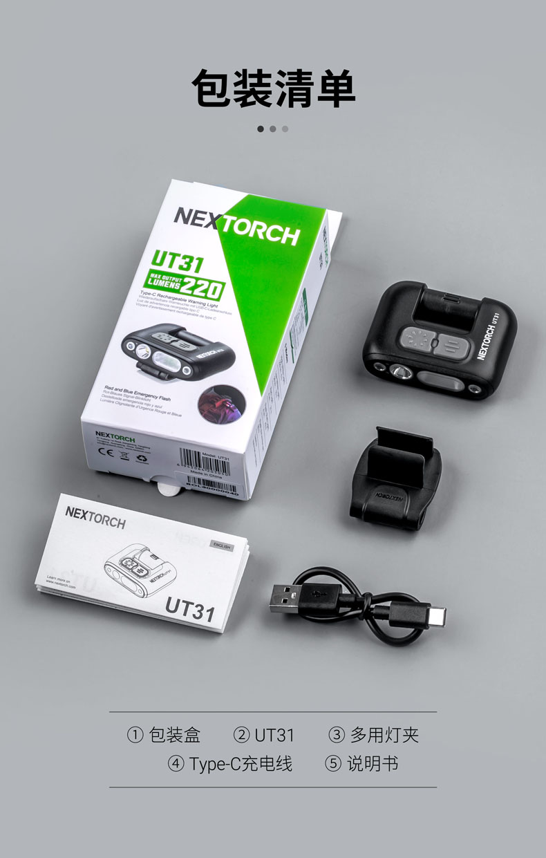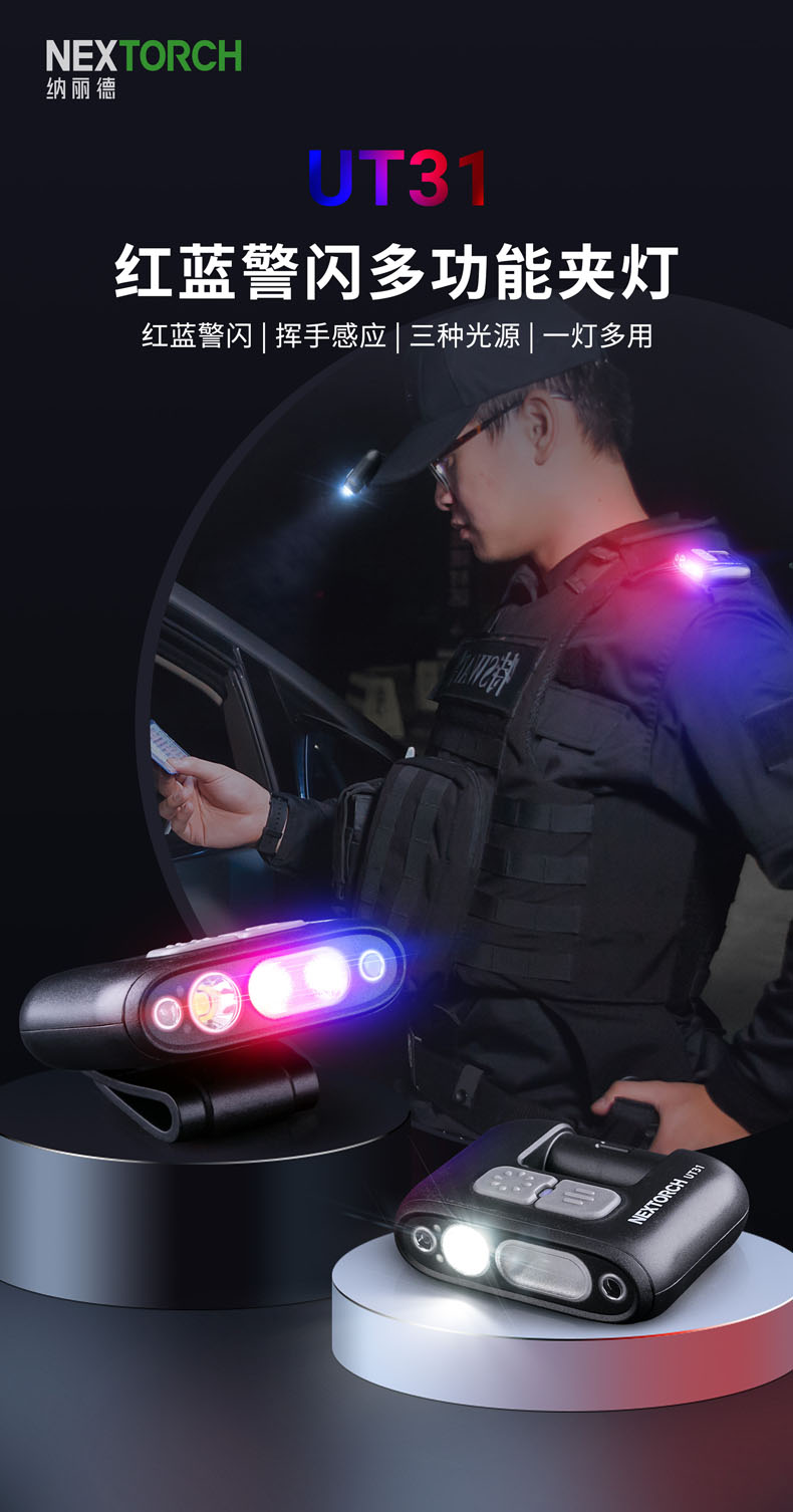 UT31是一款红蓝警闪+白光照明双模式的多功能夹灯,进一步满足了勤务的用光需求。沿袭UT30的挥手感应功能,控制白光的开启与关闭,释放双手;标配可拆式抱夹实现一灯多用,Type-C直充设计让续航更高效便利;集白光照明、红灯警示、红蓝警闪于一体,一个小巧的UT31便能满足交通指挥、执勤巡逻、夜间照明、应急警示等各种场合的照明需求。