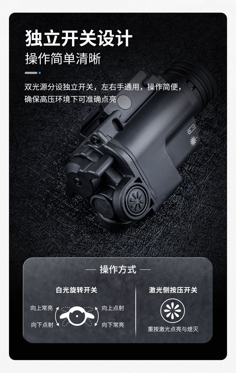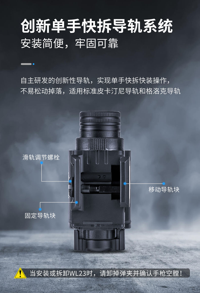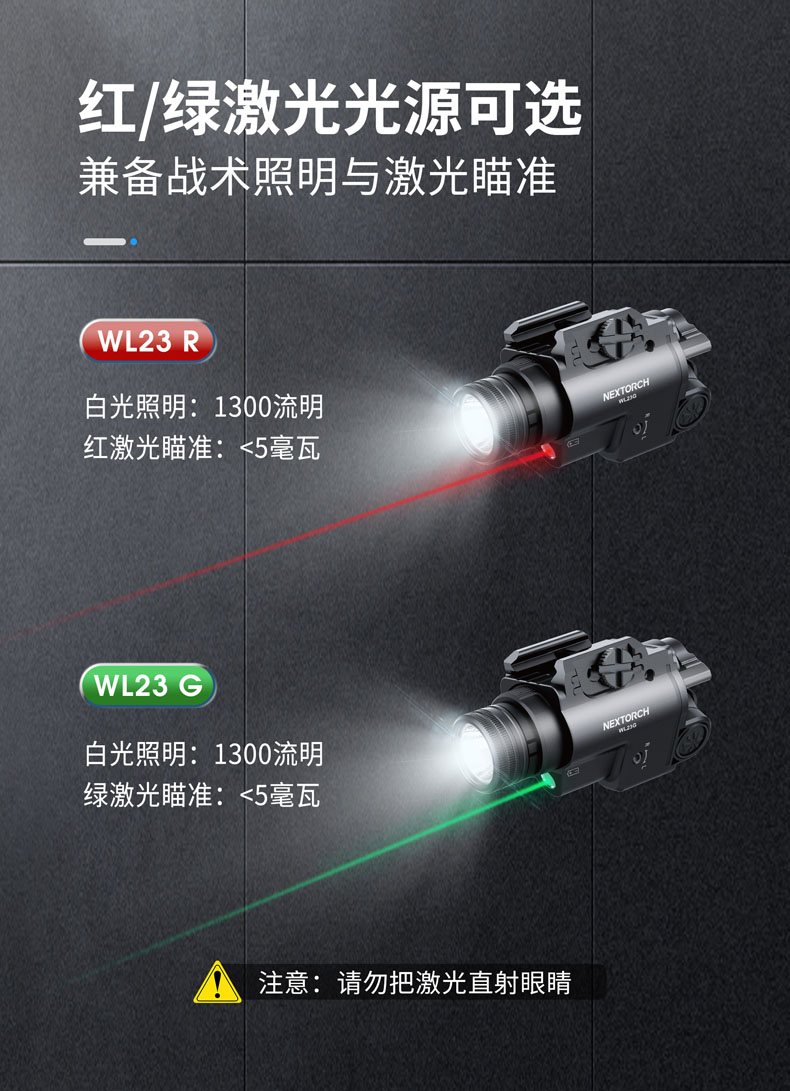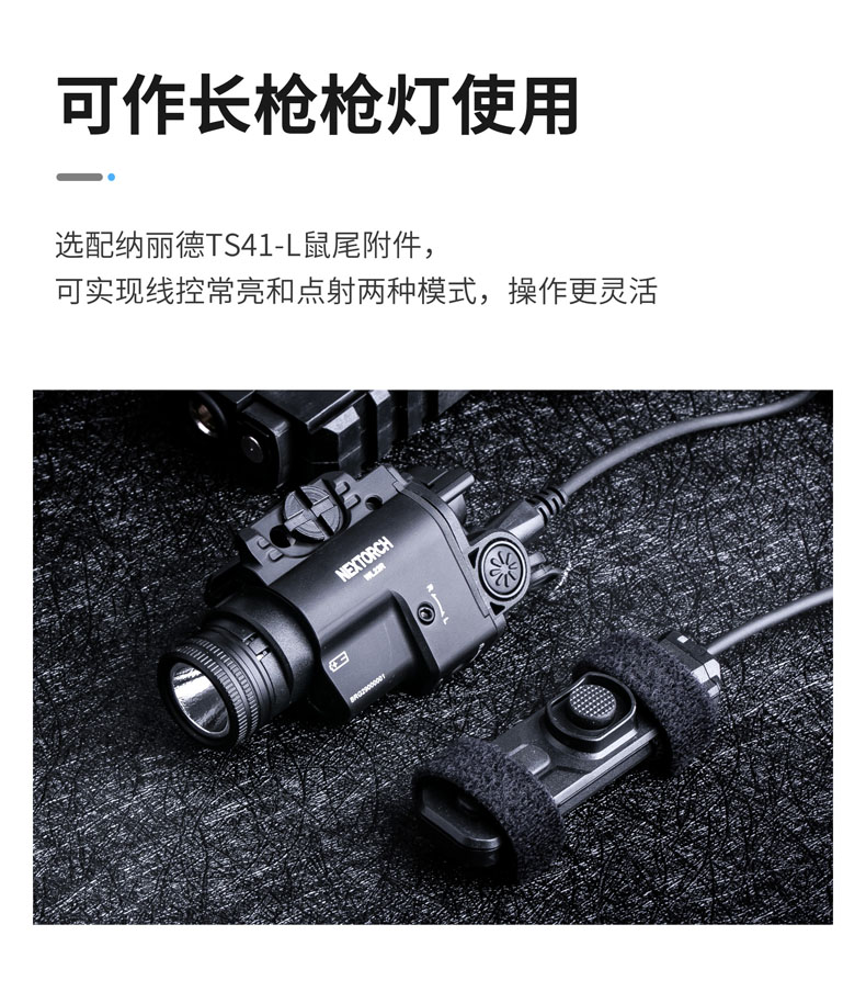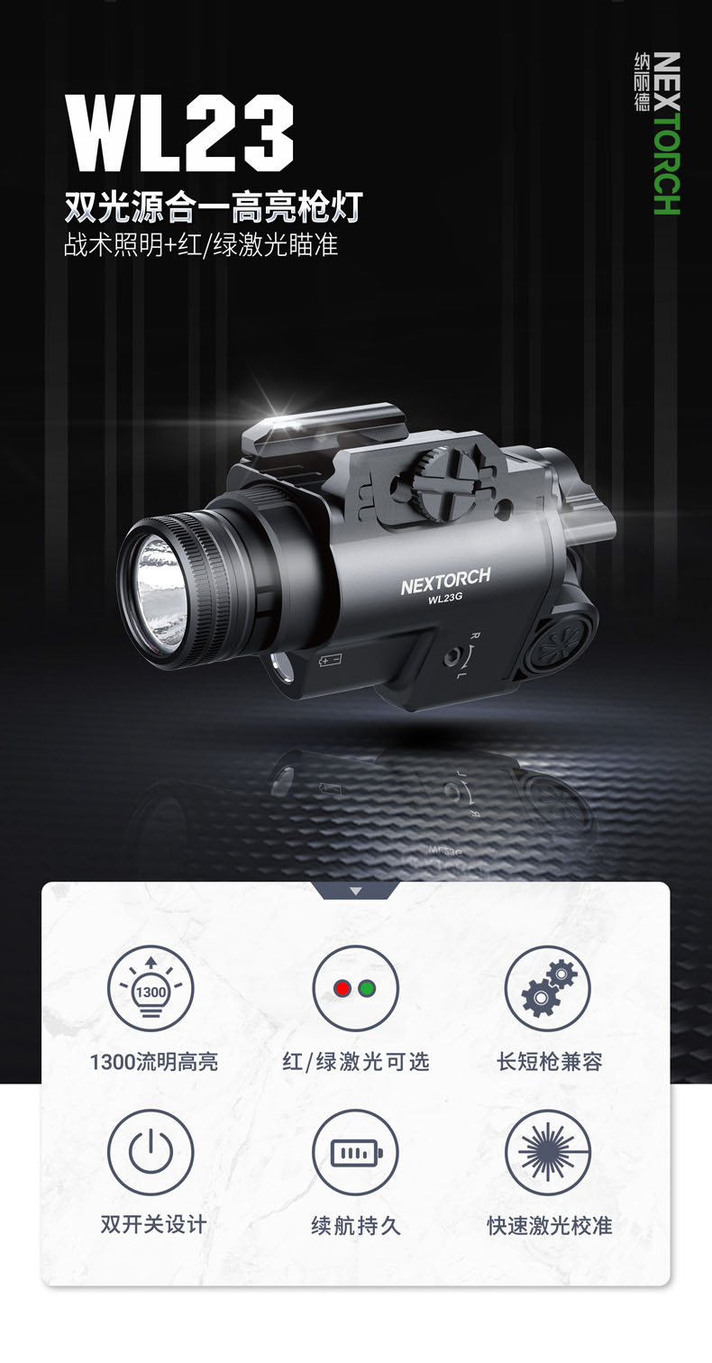 WL23双光源合一高亮枪灯,兼具战术照明与激光照准功能,性能强悍,1300流明高亮输出,180米精准远射,带来更亮更广的照明体验。提供WL23G白光照明+绿激光瞄准、WL23R白光照明+红激光瞄准,可根据不同任务需求适当搭配,成为暗弱光执法下的有效助力。可选配纳丽德TS41-L鼠尾配件,长短枪兼容,实现线控常亮和点射两种模式,操作更灵活。