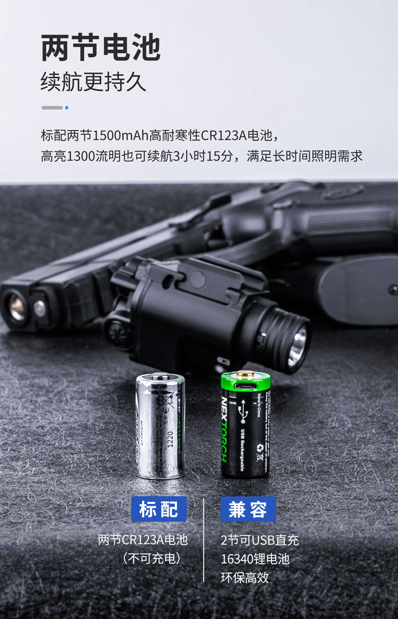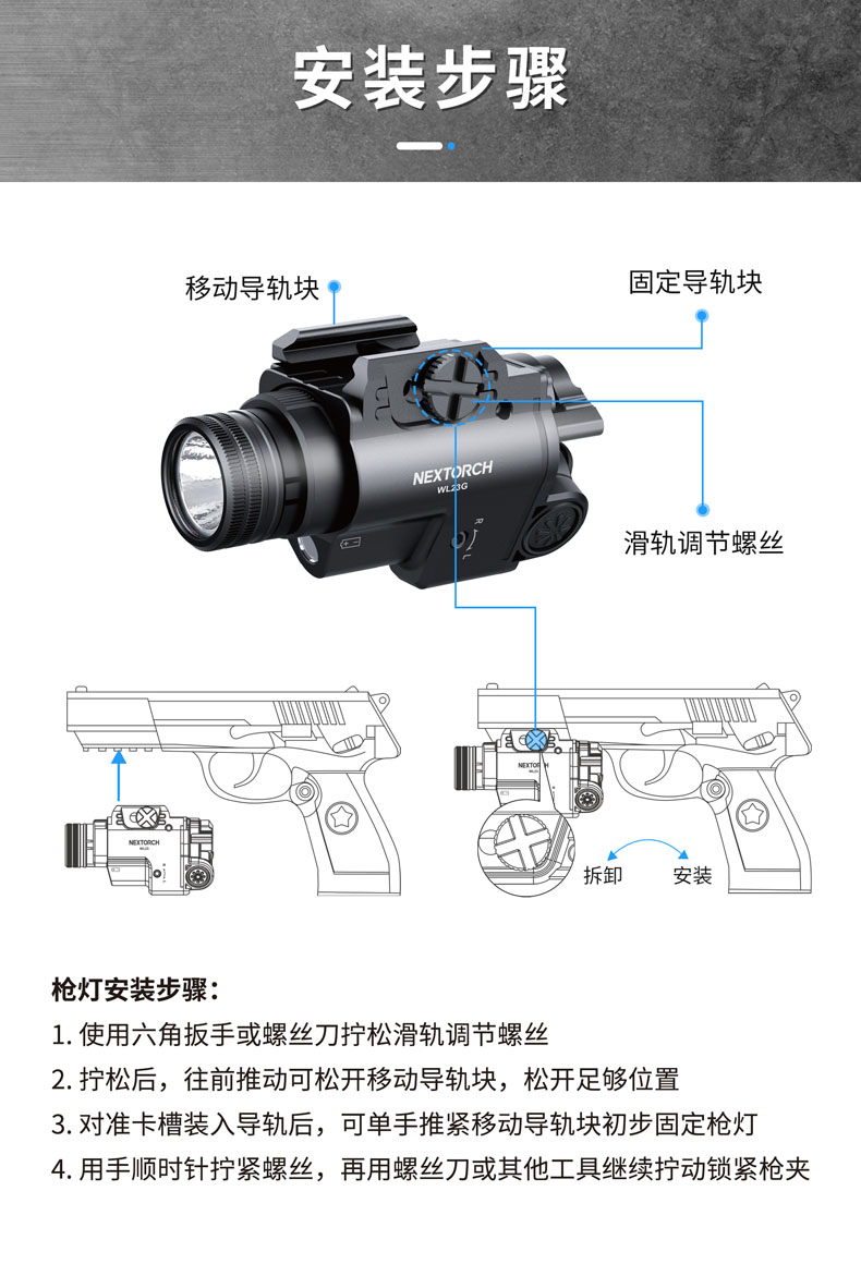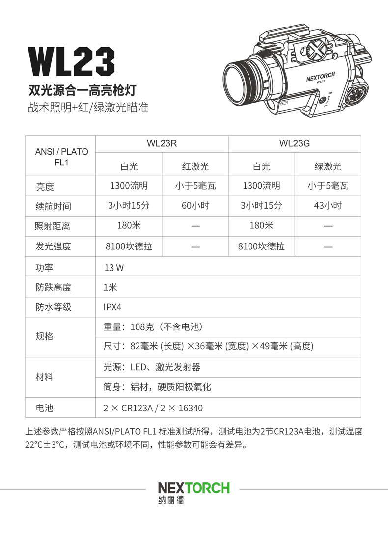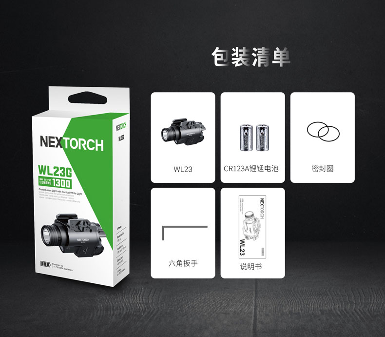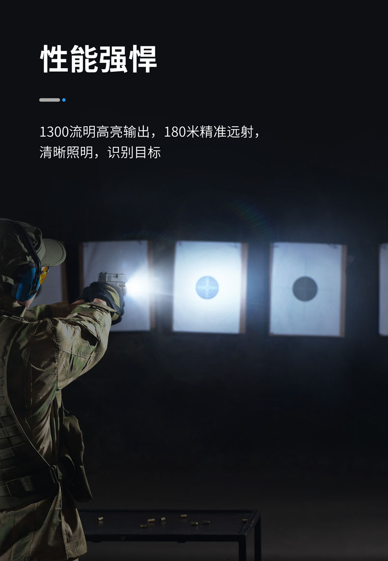 WL23双光源合一高亮枪灯,兼具战术照明与激光照准功能,性能强悍,1300流明高亮输出,180米精准远射,带来更亮更广的照明体验。提供WL23G白光照明+绿激光瞄准、WL23R白光照明+红激光瞄准,可根据不同任务需求适当搭配,成为暗弱光执法下的有效助力。可选配纳丽德TS41-L鼠尾配件,长短枪兼容,实现线控常亮和点射两种模式,操作更灵活。