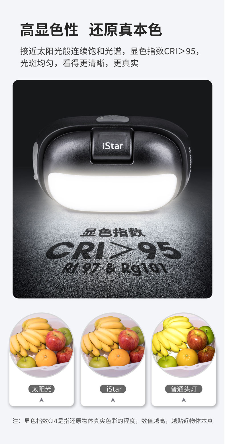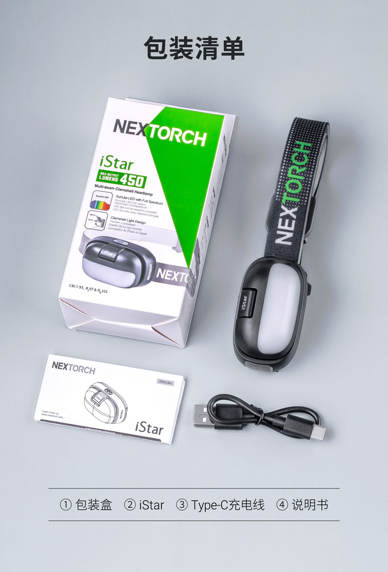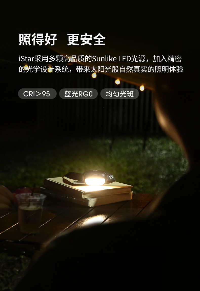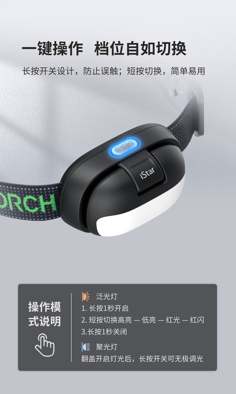 iStar,美学与科技的碰撞之作,不仅精致有格调,还照得好。4000K科学色温的均匀柔和泛光显色性高CRI>95,还原物体真本色,蓝光RG0无伤害,安全温和,呵护双眼。全新打造的翻盖开关,翻开超过90°点亮聚光,盖下即灭,亮度随翻盖角度变化,避免直射自己和他人的眼睛。无极调光为调节聚光亮度提供多一分保障,光线自然过渡,照明体验更舒适。内置锂电池、Type-C直充、电量显示、头灯带等细微之处也精心雕琢,只为给用户带来舒适愉快的使用体验。