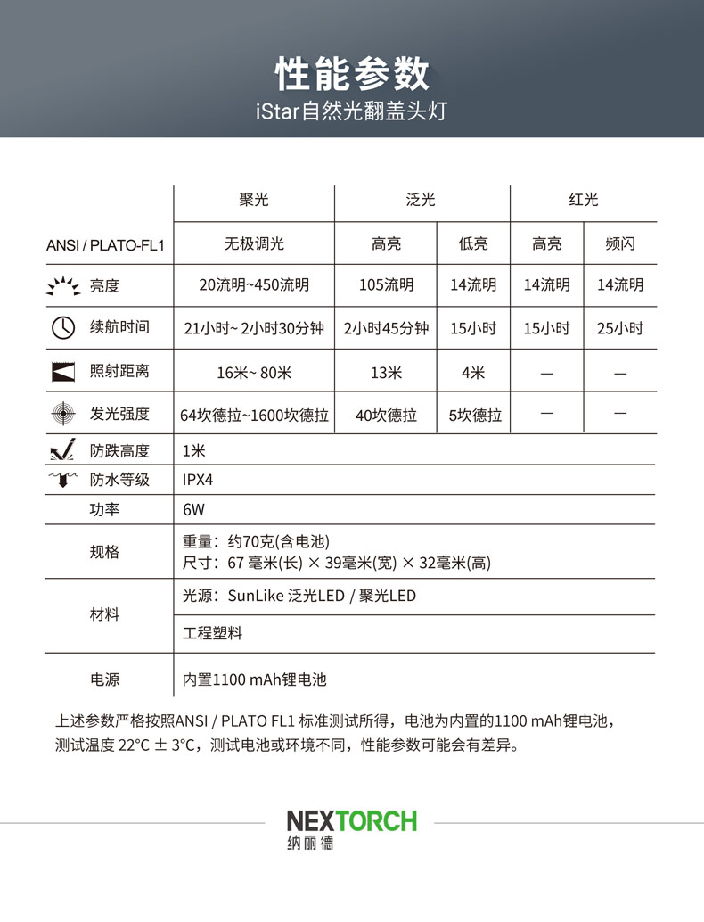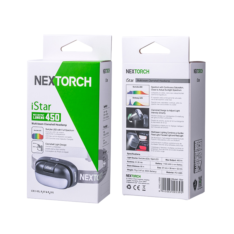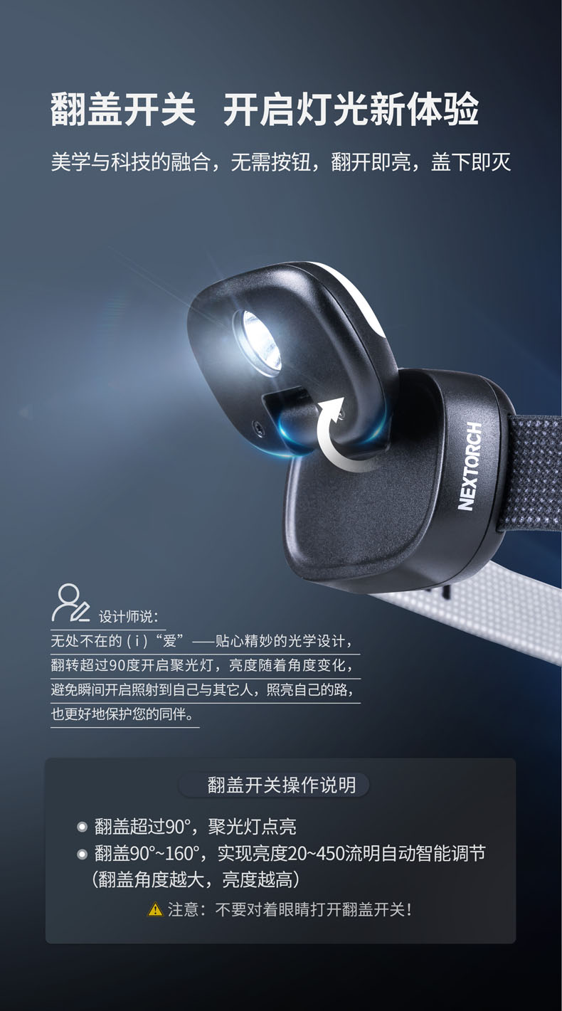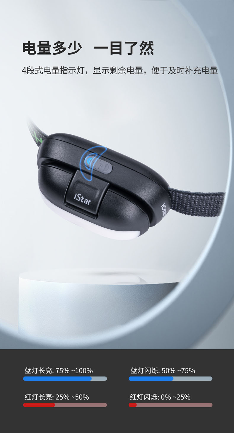 iStar,美学与科技的碰撞之作,不仅精致有格调,还照得好。4000K科学色温的均匀柔和泛光显色性高CRI>95,还原物体真本色,蓝光RG0无伤害,安全温和,呵护双眼。全新打造的翻盖开关,翻开超过90°点亮聚光,盖下即灭,亮度随翻盖角度变化,避免直射自己和他人的眼睛。无极调光为调节聚光亮度提供多一分保障,光线自然过渡,照明体验更舒适。内置锂电池、Type-C直充、电量显示、头灯带等细微之处也精心雕琢,只为给用户带来舒适愉快的使用体验。