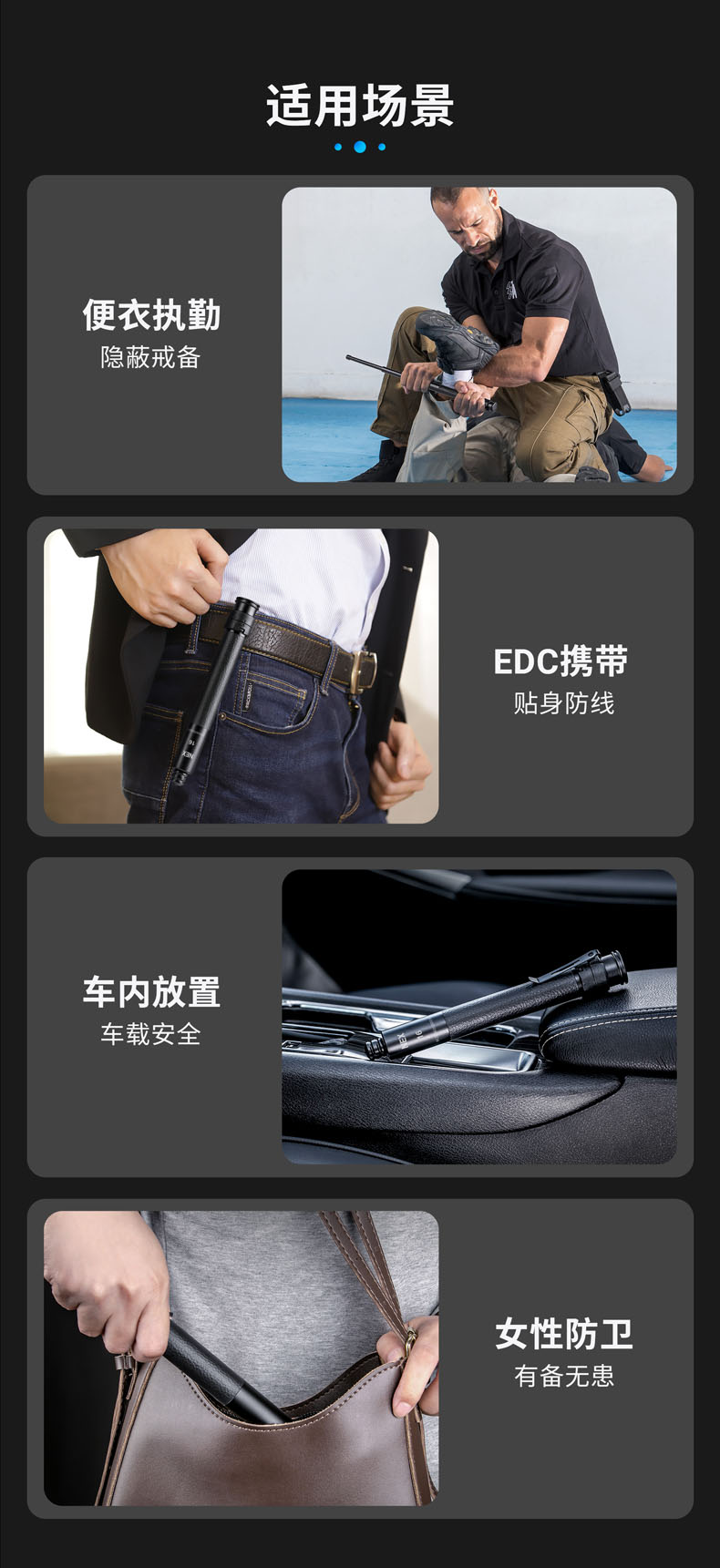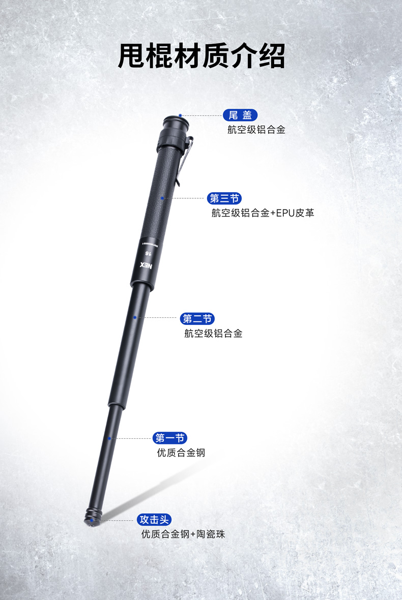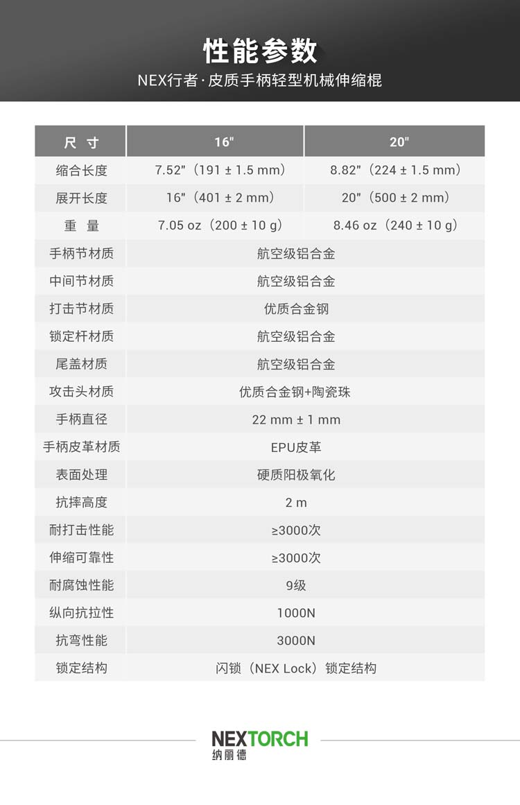 NEX行者 16"皮质手柄便携棍小巧强悍,隐蔽携行。自主研发的专利“闪锁”锁定结构,攻克机械甩棍跌落易解锁、易损坏的难题,实现了机械甩棍稳定性的创新性突破。2米跌落牢不可破,开合顺畅,操控感佳。手柄甄选优质EPU皮革,柔韧耐磨、握持舒适,减震防滑。尾部大面积按压式解锁省时省力,防误触设计,大力戳击不收棍。便携棍标配可拆卸抱夹,便于甩棍随身隐藏携行,随时出击。