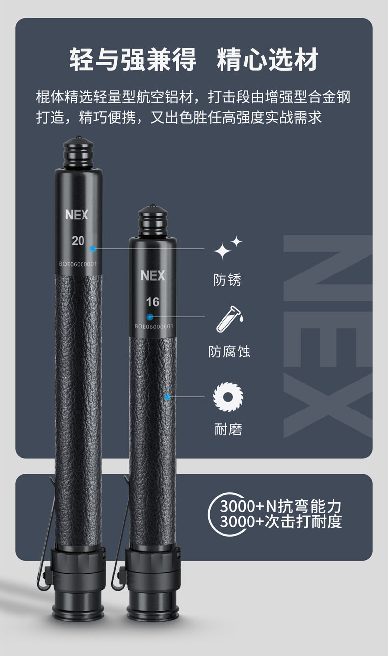 NEX行者20"皮质手柄便携棍小巧强悍,隐蔽携行。自主研发的专利“闪锁”锁定结构,攻克机械甩棍跌落易解锁、易损坏的难题,实现了机械甩棍稳定性的创新性突破。2米跌落牢不可破,开合顺畅,操控感佳。手柄甄选优质EPU皮革,柔韧耐磨、握持舒适,减震防滑。尾部大面积按压式解锁省时省力,防误触设计,大力戳击不收棍。便携棍标配可拆卸抱夹,便于甩棍随身隐藏携行,随时出击。