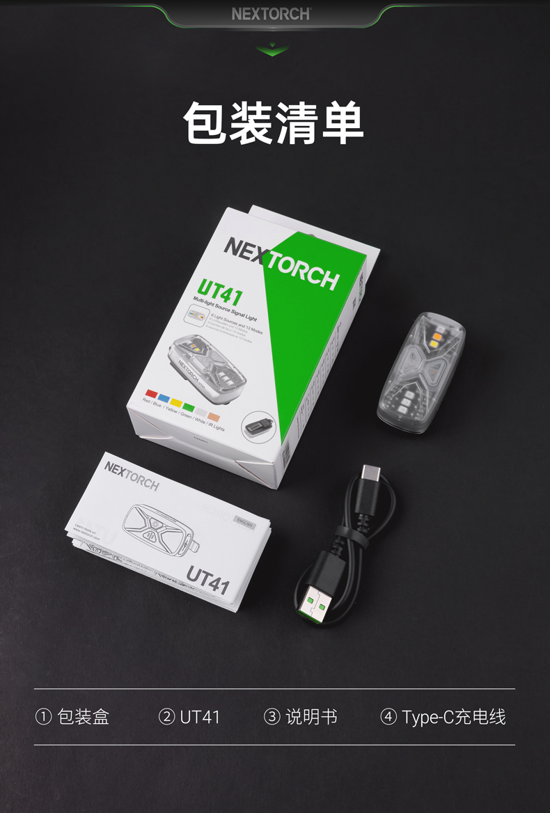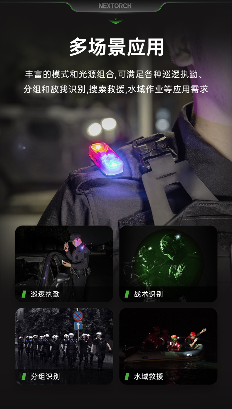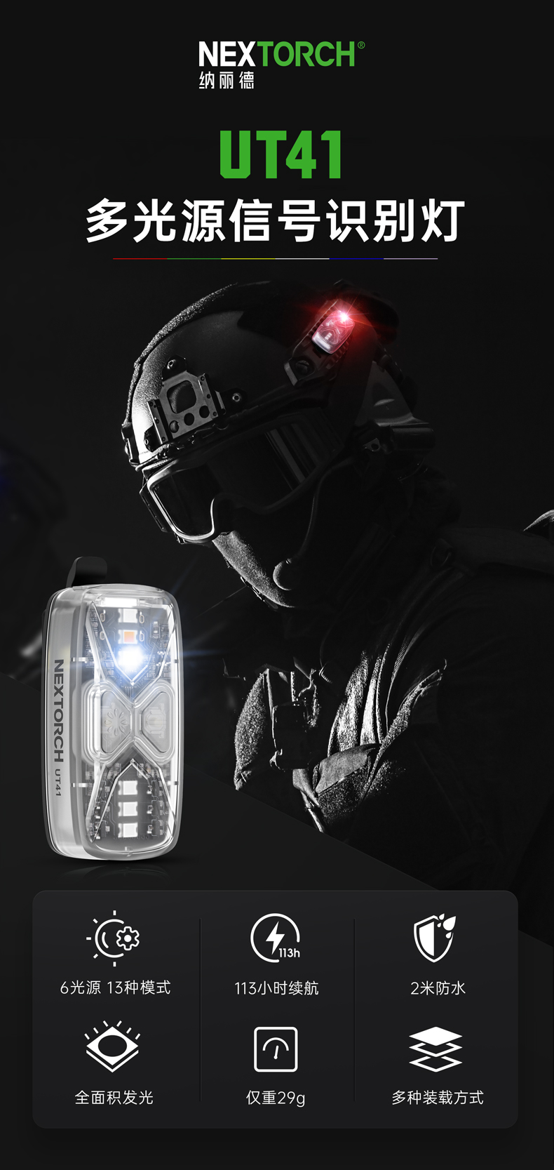 UT41多光源分组识别灯,6色光源与13种发光模式,拥有身份识别、训练分组、搜索定位,安全警示等作用,满足军警训练、实战行动、户外徒步骑行,夜间跑步等多场景使用需求;不同配件实现ARC头盔导轨、Molle织带、肩章等多种挂载方式。