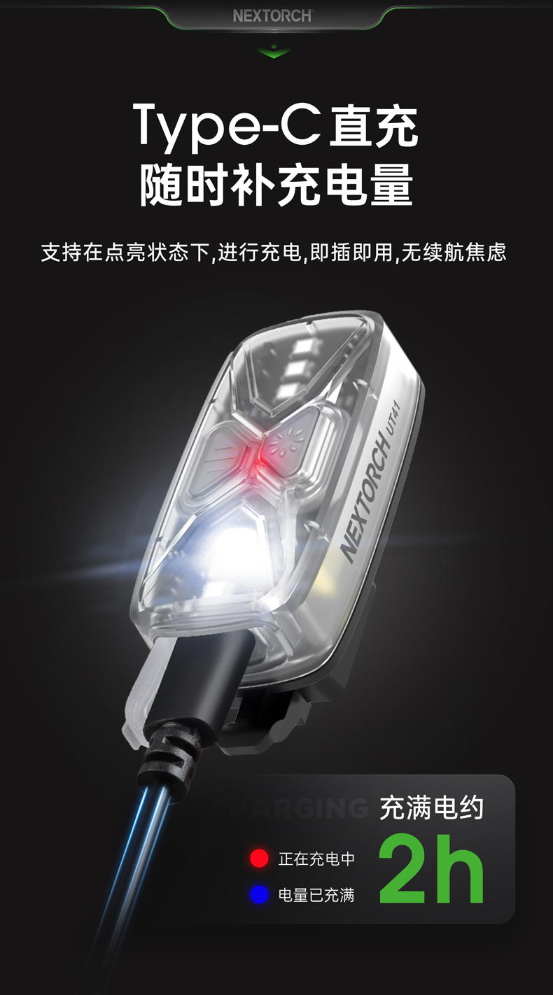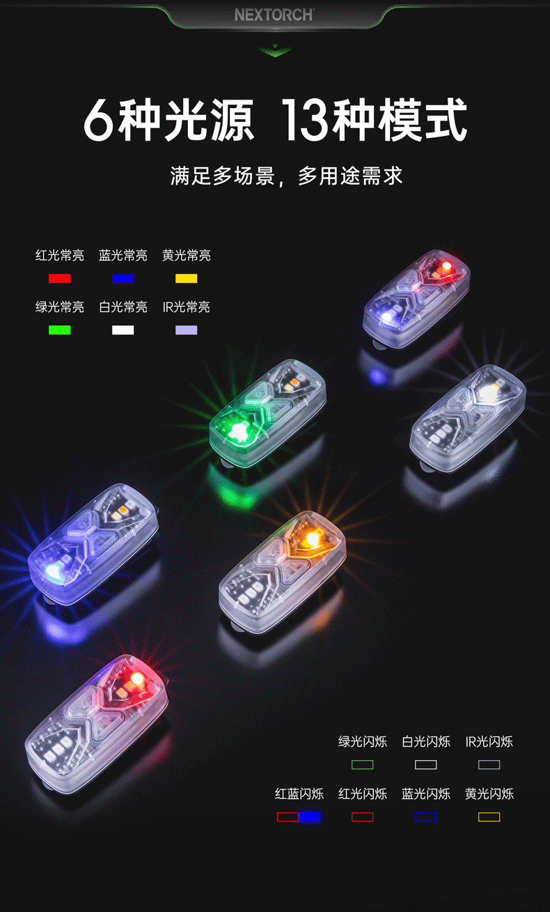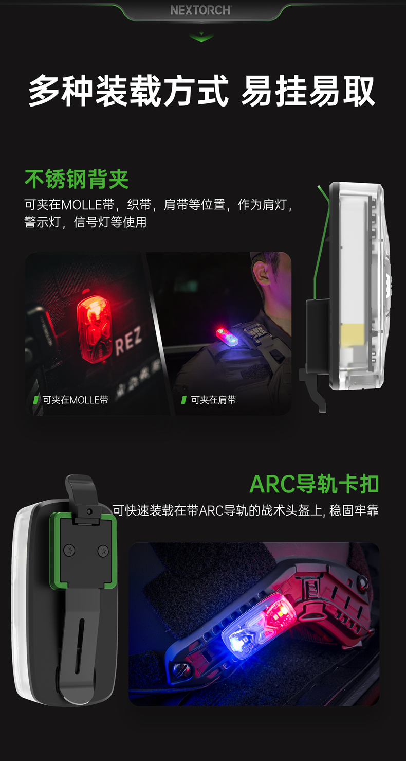 UT41多光源分组识别灯,6色光源与13种发光模式,拥有身份识别、训练分组、搜索定位,安全警示等作用,满足军警训练、实战行动、户外徒步骑行,夜间跑步等多场景使用需求;不同配件实现ARC头盔导轨、Molle织带、肩章等多种挂载方式。