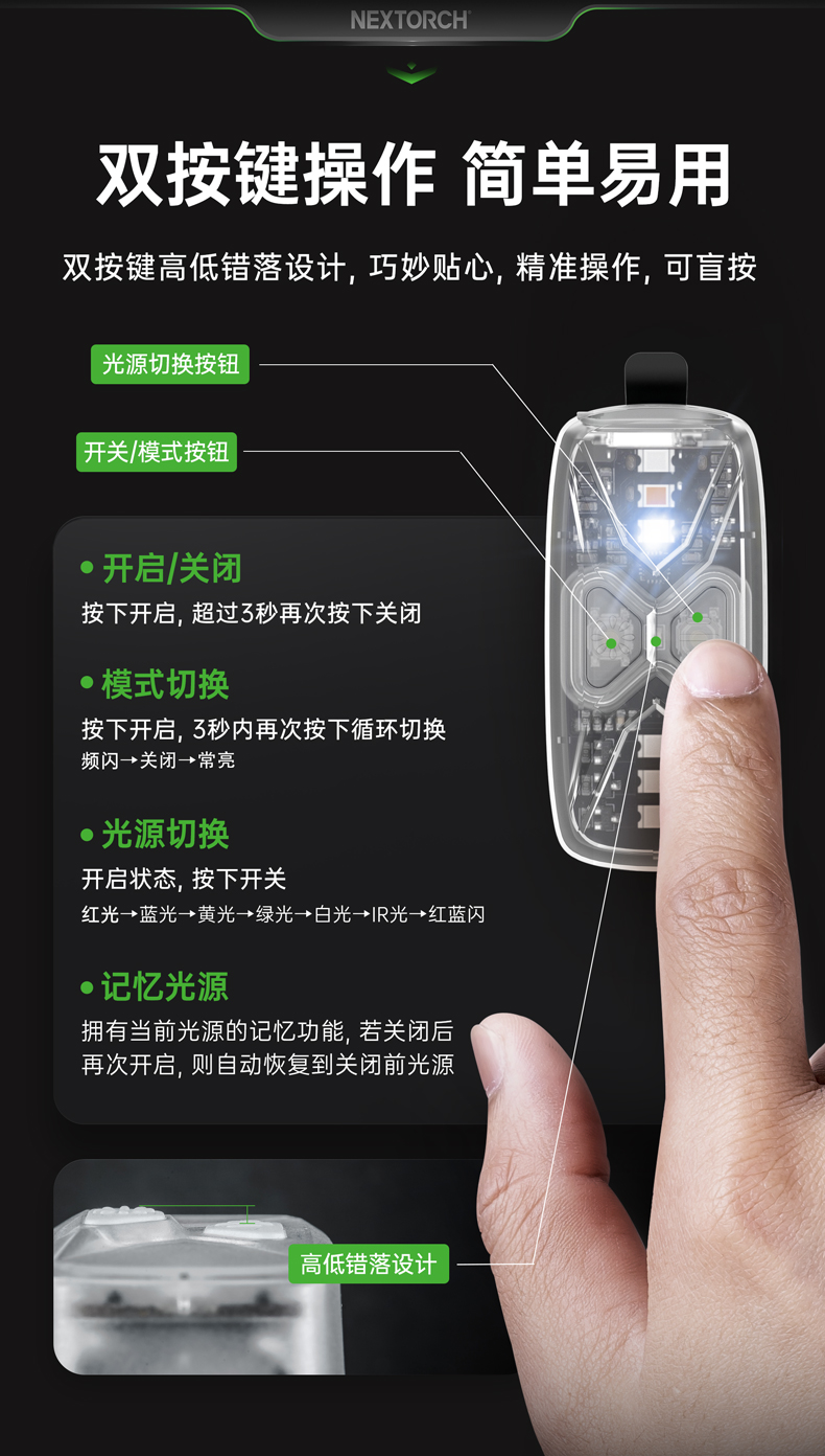 ·金属双阶按压开关 + 磁控旋转开关,单手切换
