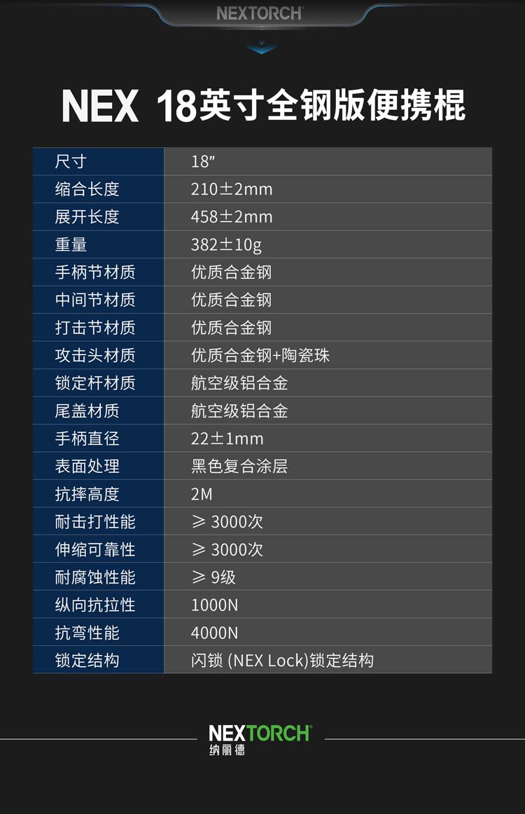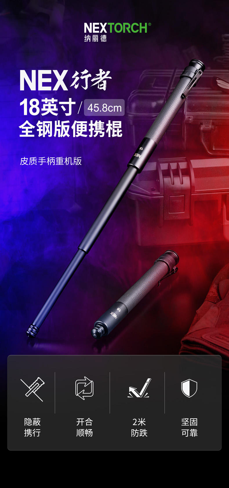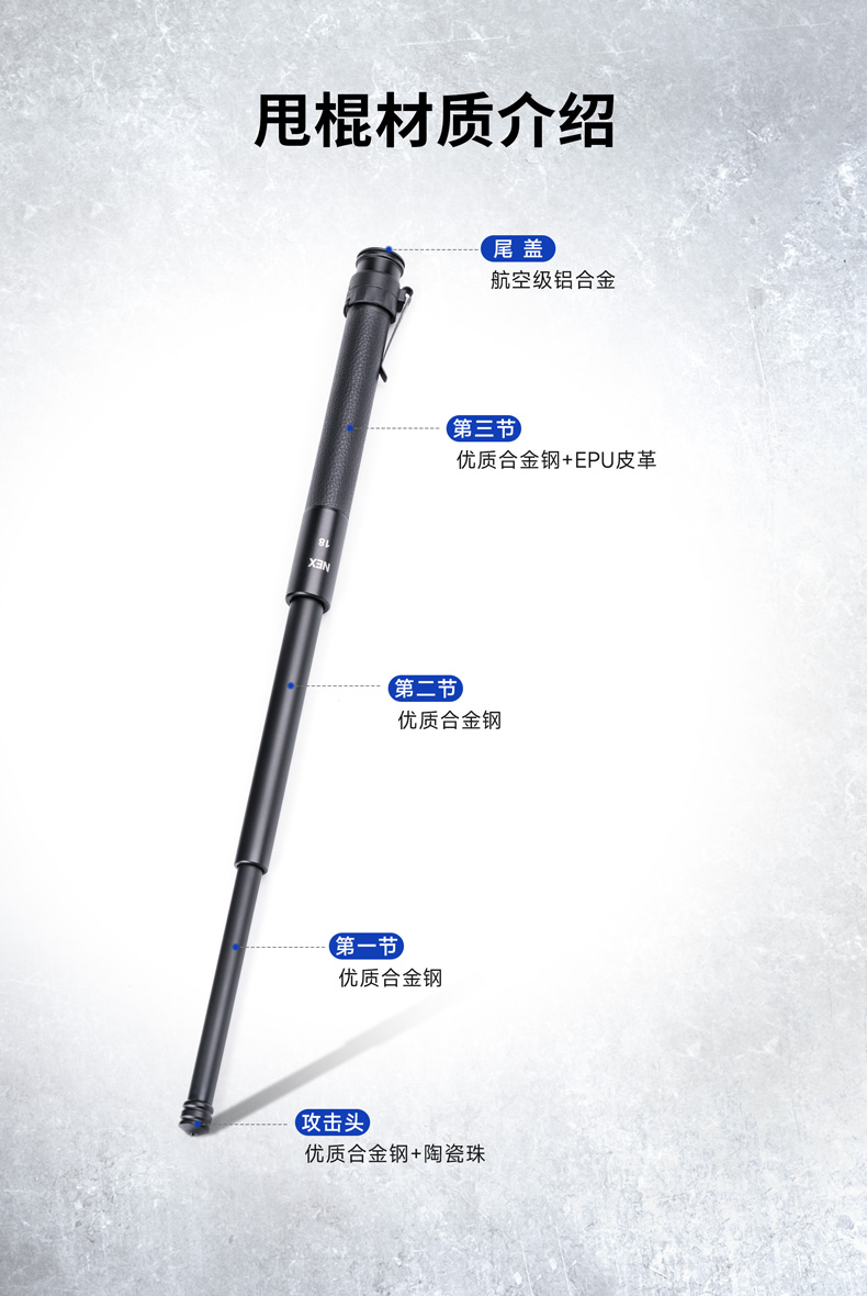 NEX行者18"皮质手柄全钢版便携棍小巧强悍,隐蔽携行。自主研发的专利“闪锁”锁定结构,攻克机械甩棍跌落易解锁、易损坏的难题,实现了机械甩棍稳定性的创新性突破。2米跌落牢不可破,开合顺畅,操控感佳。精选42CrMo增强型合金钢锻造,耐抗耐造。手柄甄选优质EPU皮革,柔韧耐磨、握持舒适,减震防滑。尾部大面积按压式解锁省时省力,防误触设计,大力戳击不收棍。便携棍标配可拆卸抱夹,便于甩棍随身隐藏携行,随时出击。