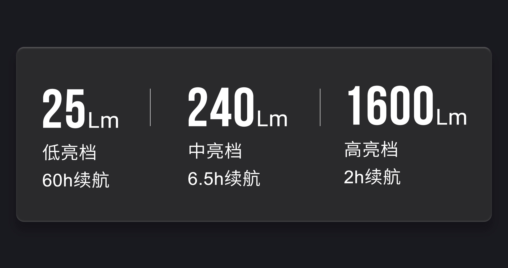 • • 亮度:点射1600流明\中亮240流明\低亮25流明\高亮1600流明