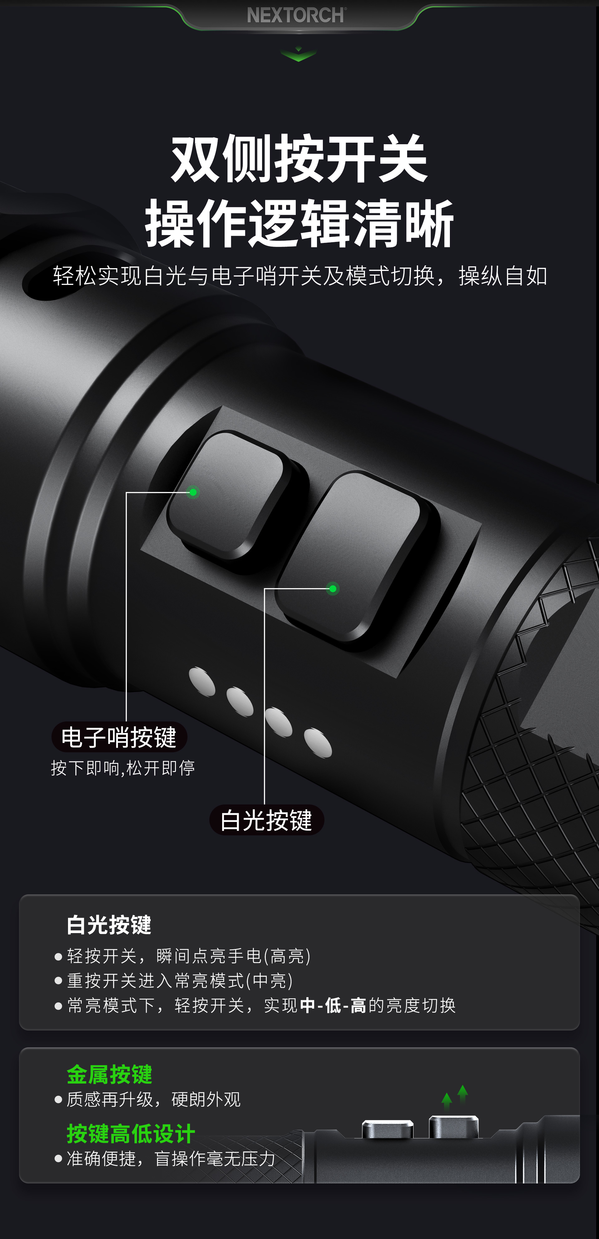·金属双阶按压开关 + 磁控旋转开关,单手切换