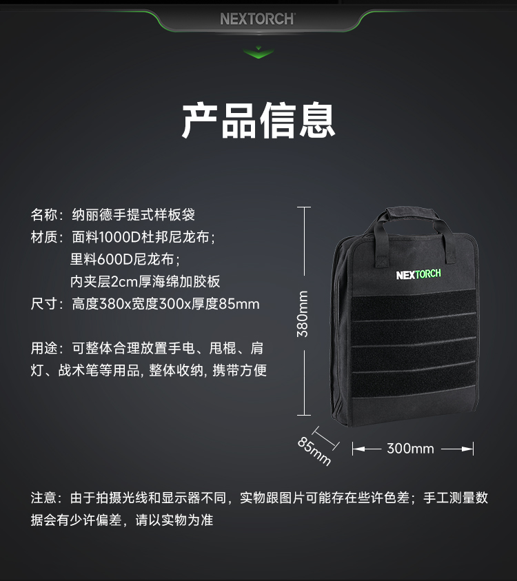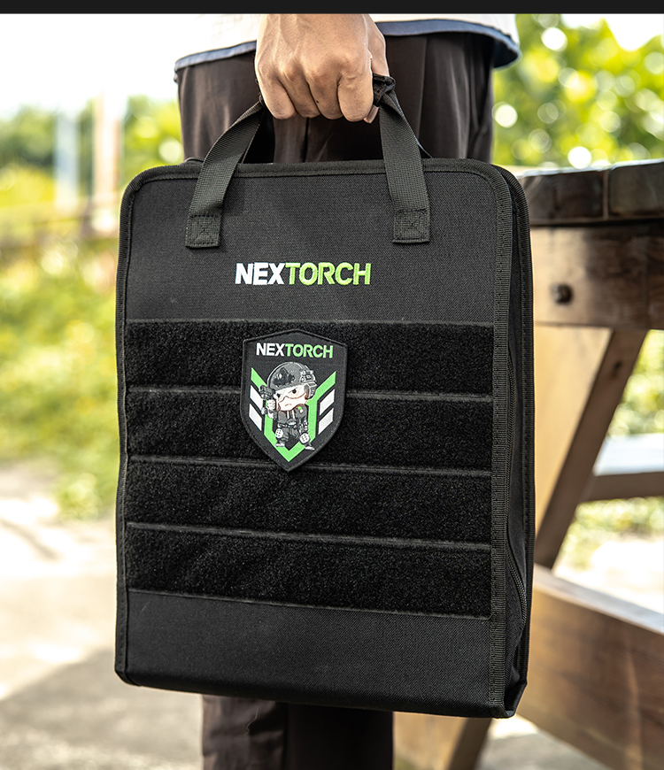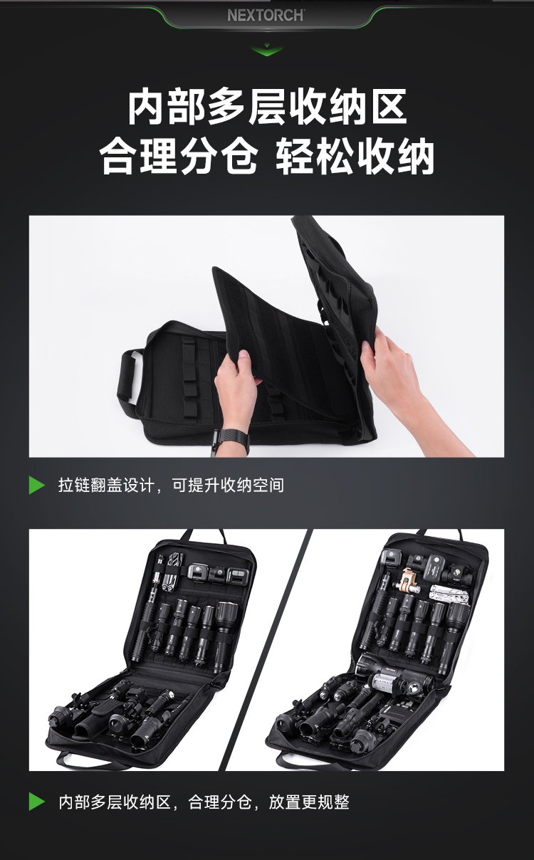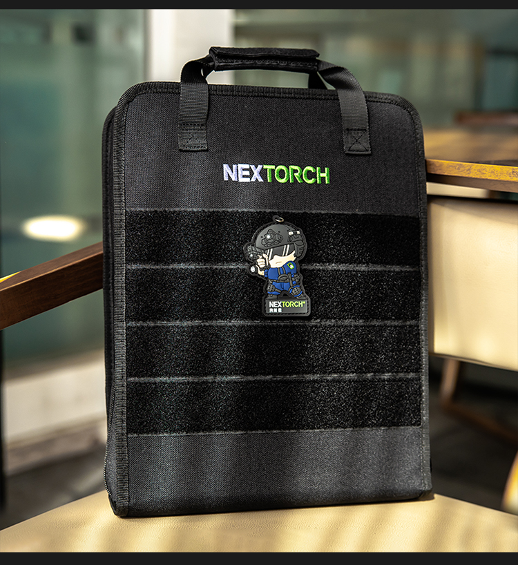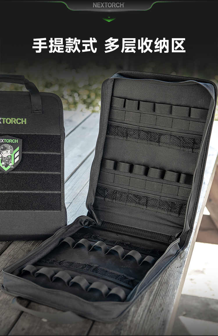 纳丽德手提式样板袋,内部设有多层收纳区,拉链翻盖,合理分仓,各类用品均可轻松放置、规整收纳,取用一目了然;人性化手提提手,携带方便;样板袋外部,魔术章反光标可自由组合粘贴;整体合理放置手电、甩棍、肩灯、战术笔等装备。