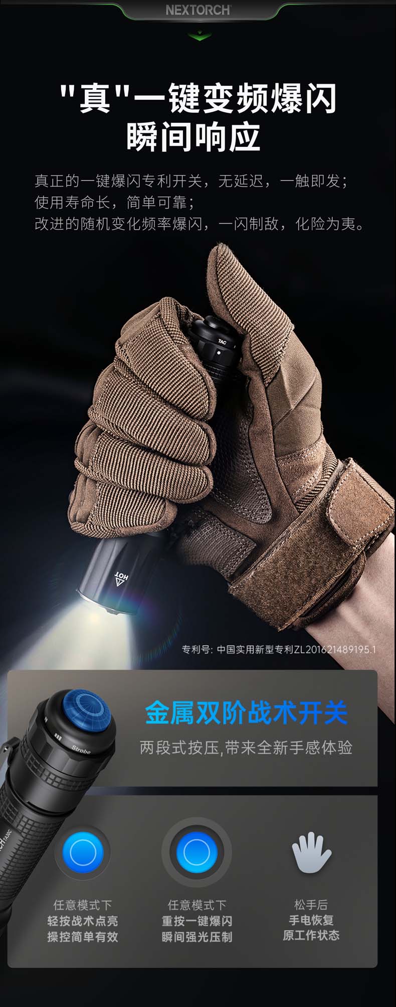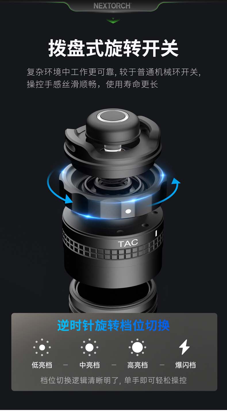 ·金属双阶按压开关 + 磁控旋转开关,单手切换