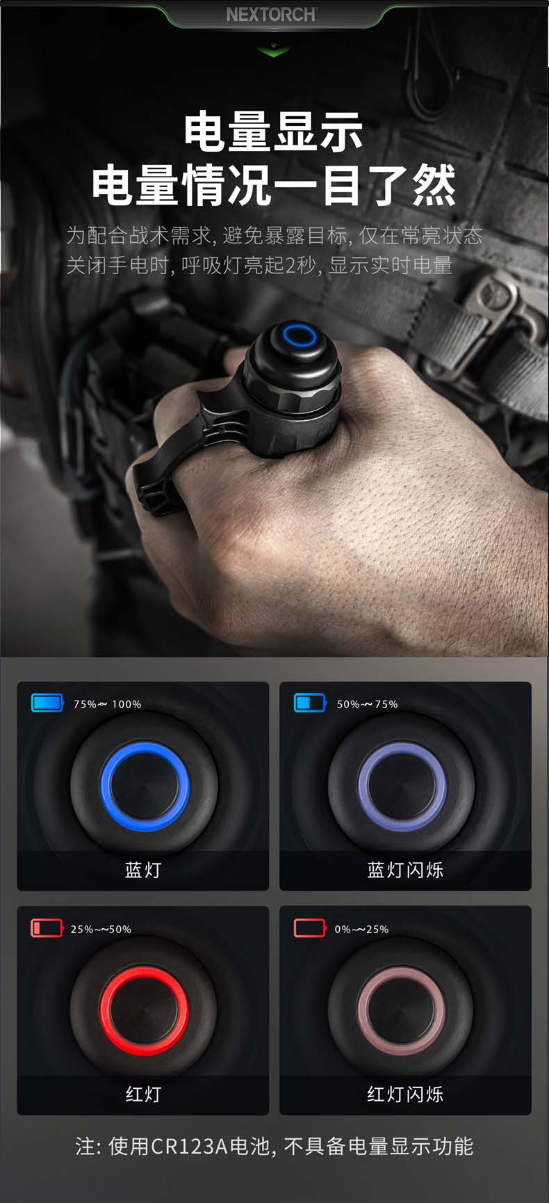 • • 电池:1节18650(标配)/2节CR123A