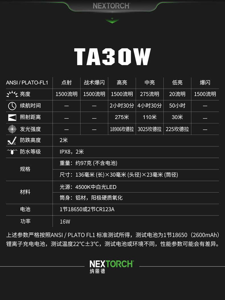 • • 亮度:点射1500流明/战术爆闪1500流明/高亮1500流明/中亮275流明/低亮20流明/爆闪1500流明