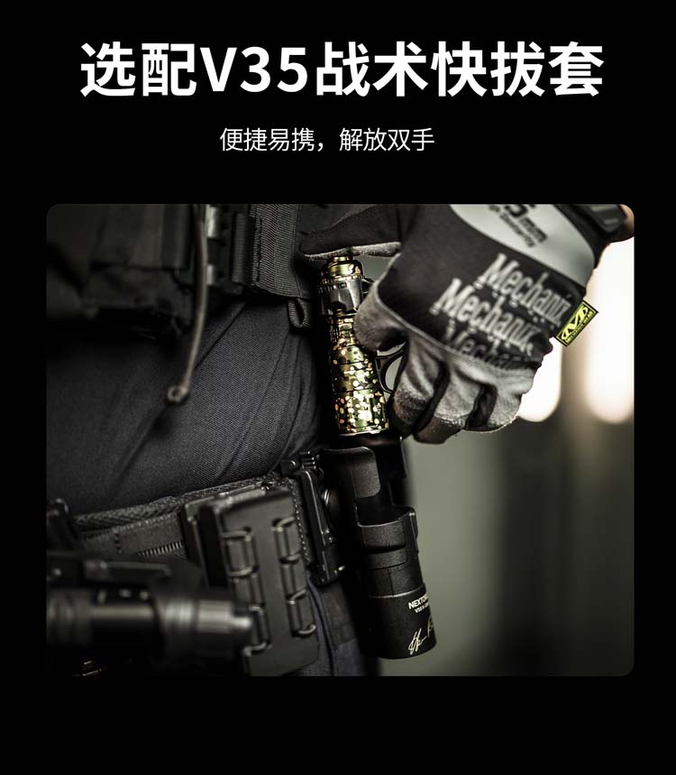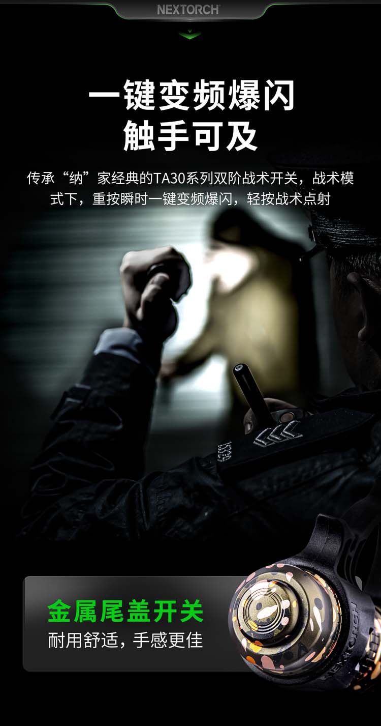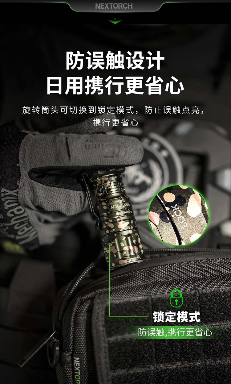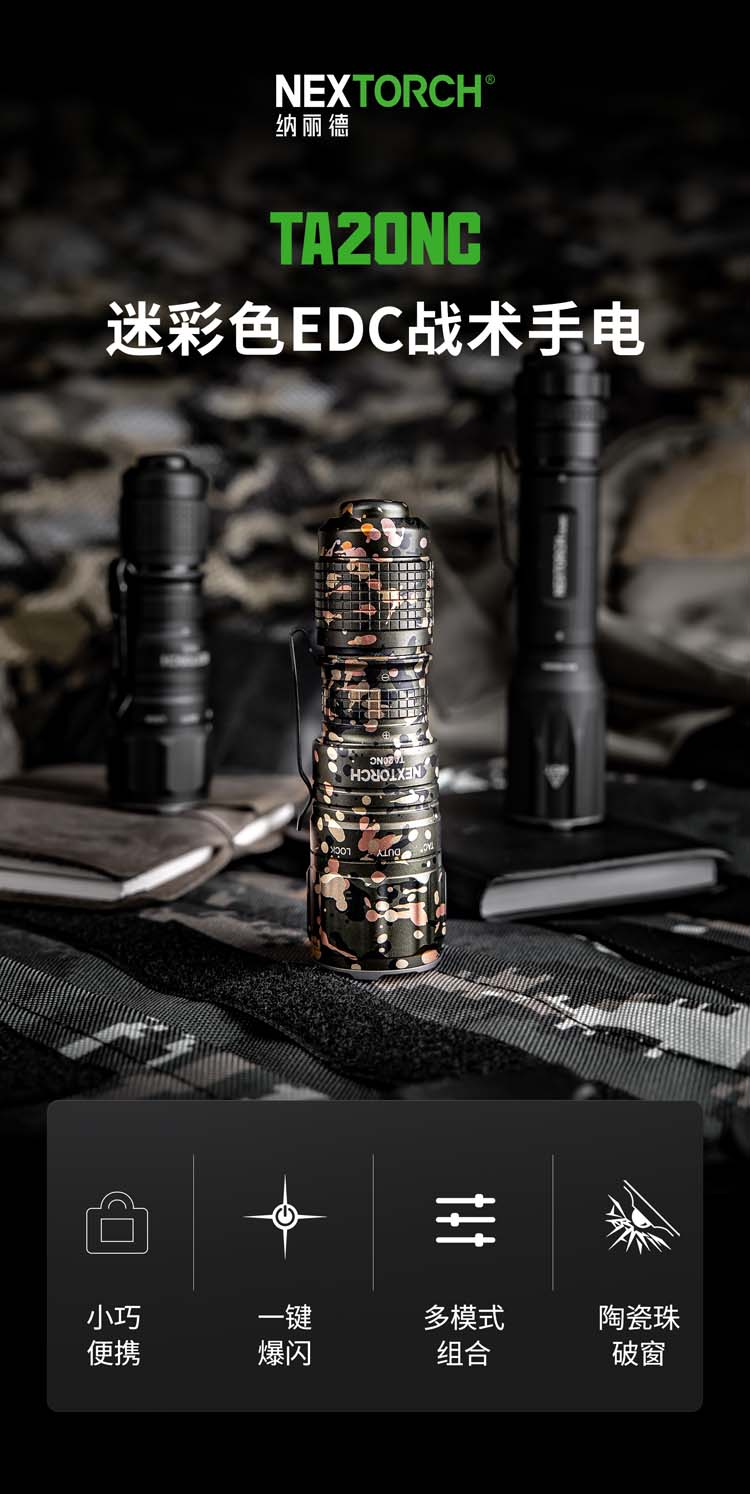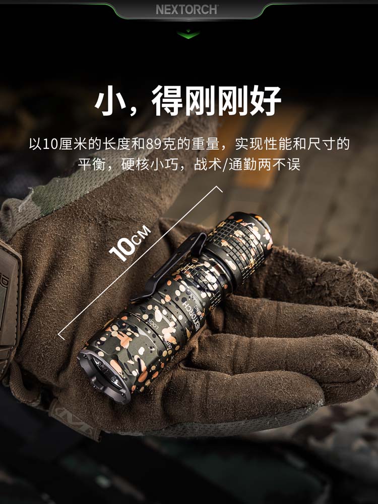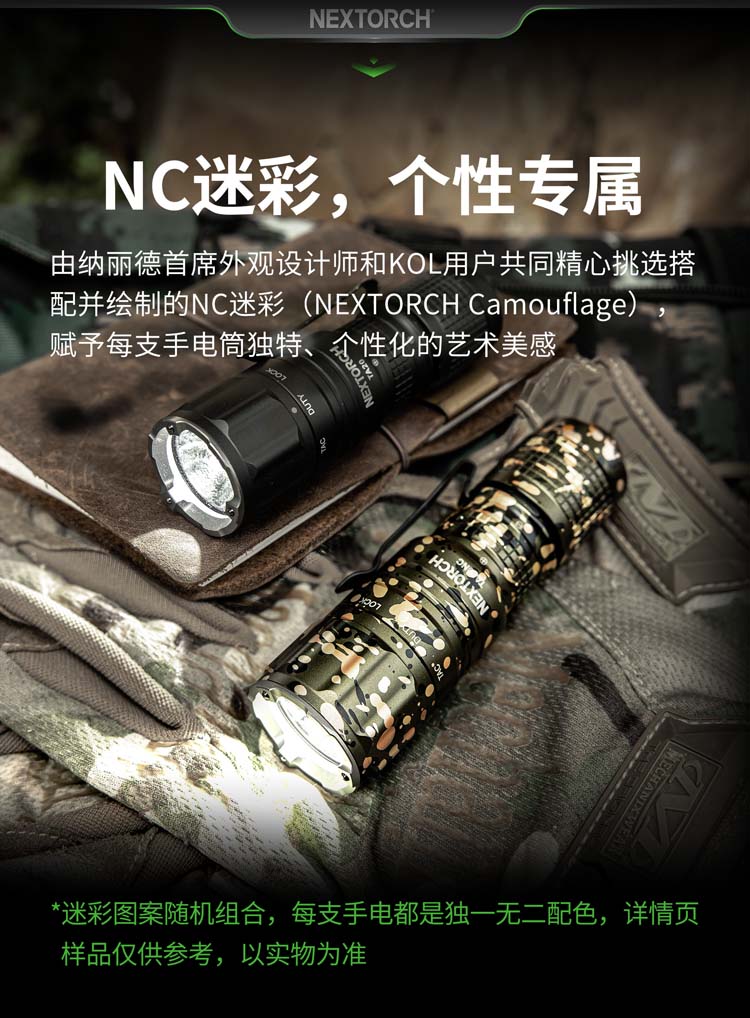 由纳丽德首席外观设计师和KOL用户共同精心挑选搭配并绘制的NC迷彩(NEXTORCH Camouflage),赋予每支手电筒独特、个性化的艺术美感。 专业的随身战术手电,小巧便携,不含电池情况下仅重89克,尺寸不超一掌,轻松掌控;多模式组设计,旋转筒头进行战术-勤务-锁定三模式的切换,全能应对不同环境所需;筒头内嵌高硬度陶瓷珠攻击头,IPX8级,2米防水防跌,坚固耐用;配套战术解决方案,与FR-1战术指环、V35快拔套结合成性能更佳的战术装备。
