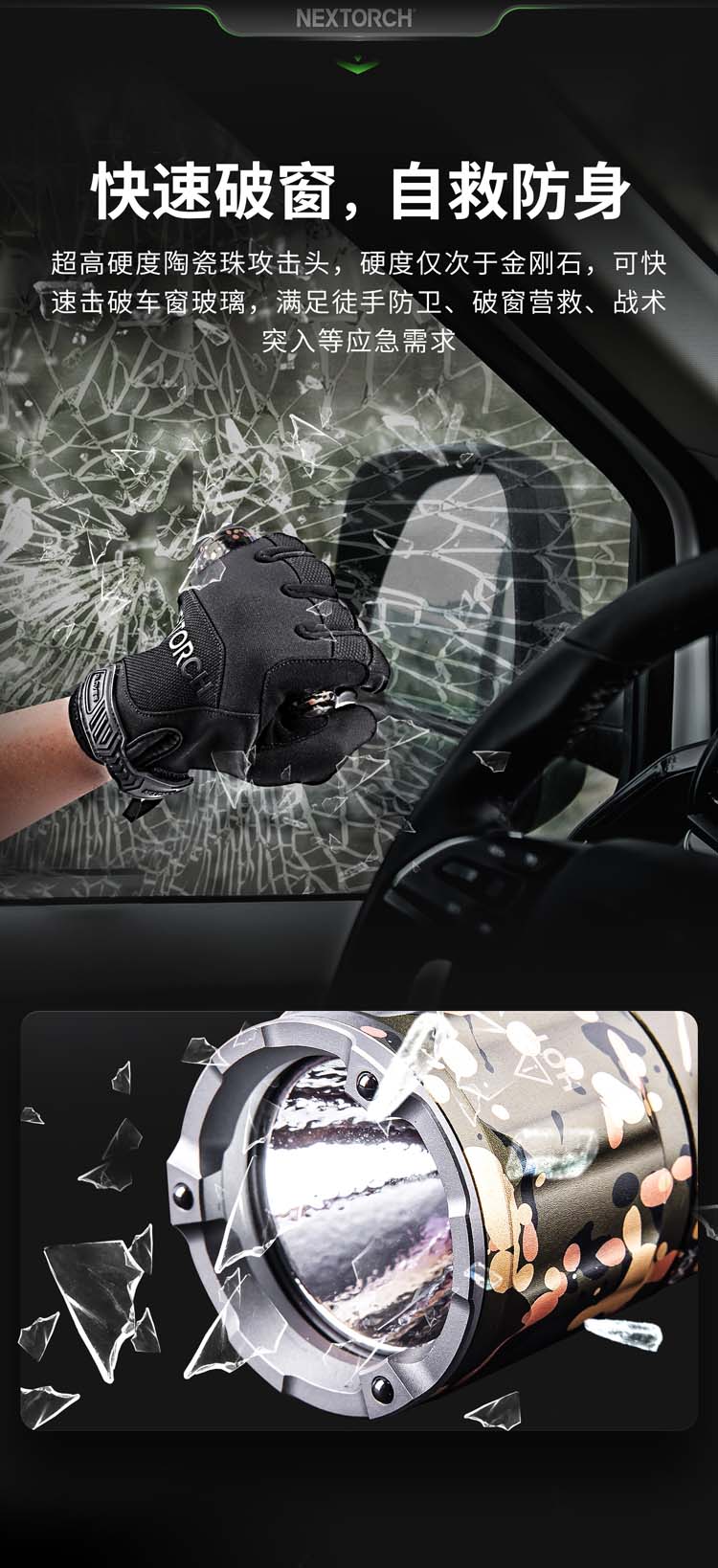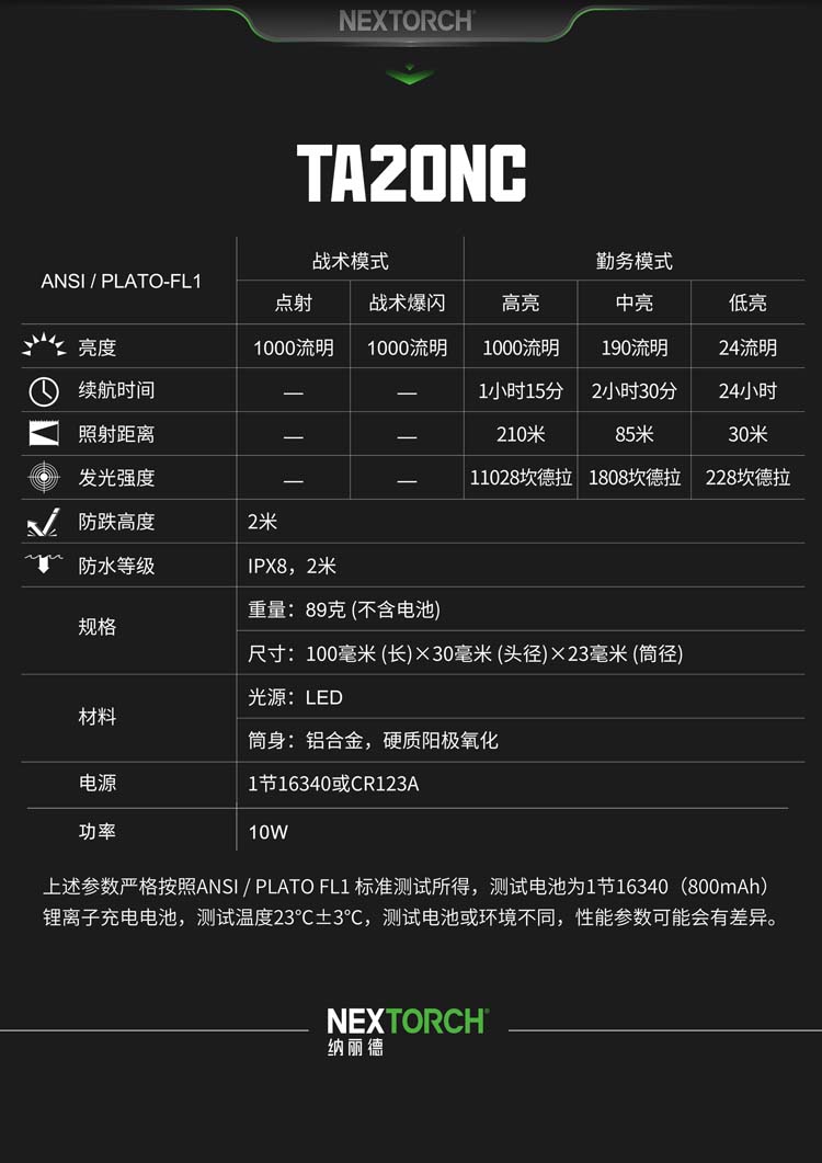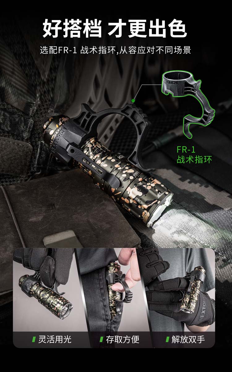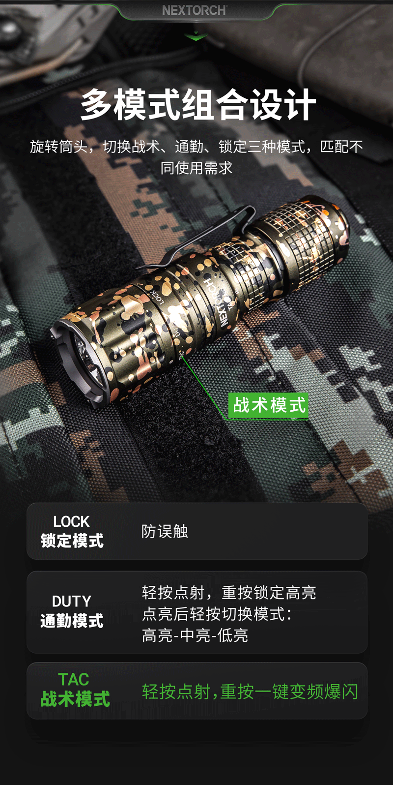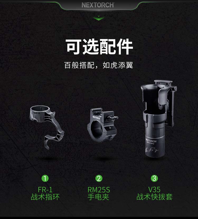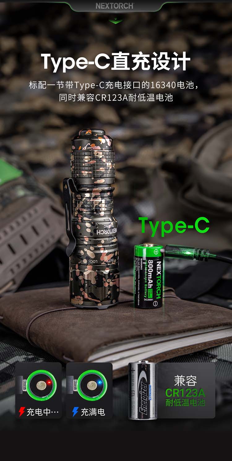 由纳丽德首席外观设计师和KOL用户共同精心挑选搭配并绘制的NC迷彩(NEXTORCH Camouflage),赋予每支手电筒独特、个性化的艺术美感。 专业的随身战术手电,小巧便携,不含电池情况下仅重89克,尺寸不超一掌,轻松掌控;多模式组设计,旋转筒头进行战术-勤务-锁定三模式的切换,全能应对不同环境所需;筒头内嵌高硬度陶瓷珠攻击头,IPX8级,2米防水防跌,坚固耐用;配套战术解决方案,与FR-1战术指环、V35快拔套结合成性能更佳的战术装备。