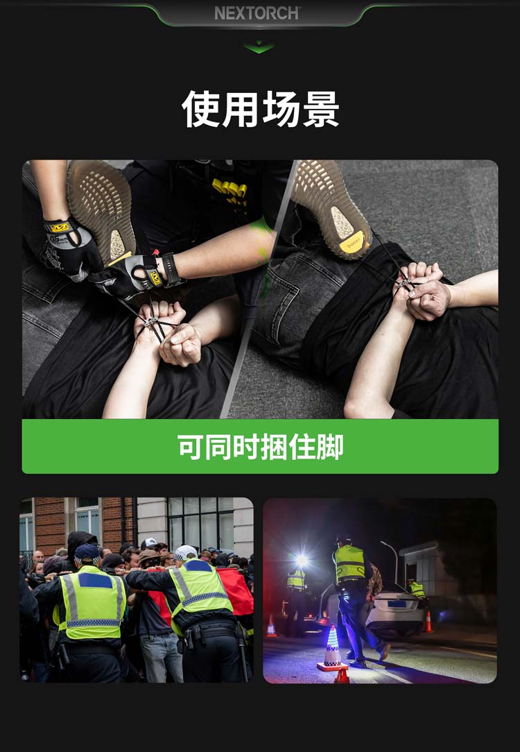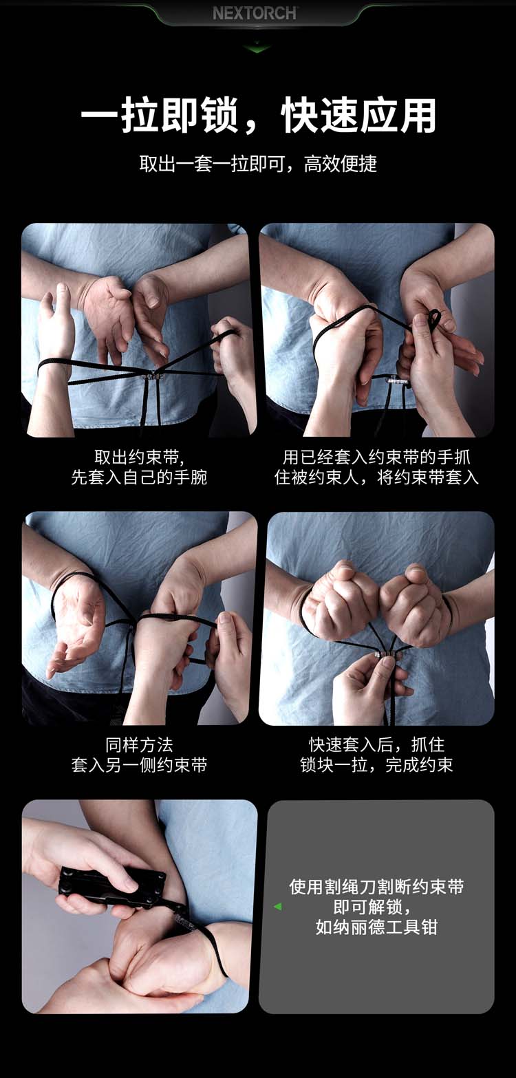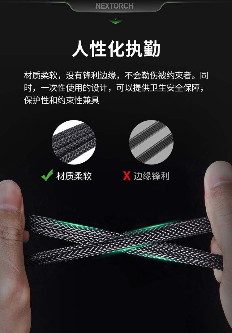 一次性尼龙约束带是目前市面上便携性和隐蔽性最强的临时性约束装备。旨在提供更优的选择,弥补金属手铐的不足之处,并且替代笨重危险、安全性低的一次性塑料手铐。采用强韧耐磨的尼龙编制而成,是一种重量很轻且非常简单的装备,能有效限制被约束人双手的活动。特别适合便衣、基层民警和特警部队使用,主要用于执行隐蔽抓捕活动或对犯罪嫌疑人临时约束,大量金属手铐携带不便时使用。同时使用约束带对醉酒、吸毒人员控制时,可以防伤人、防自伤。