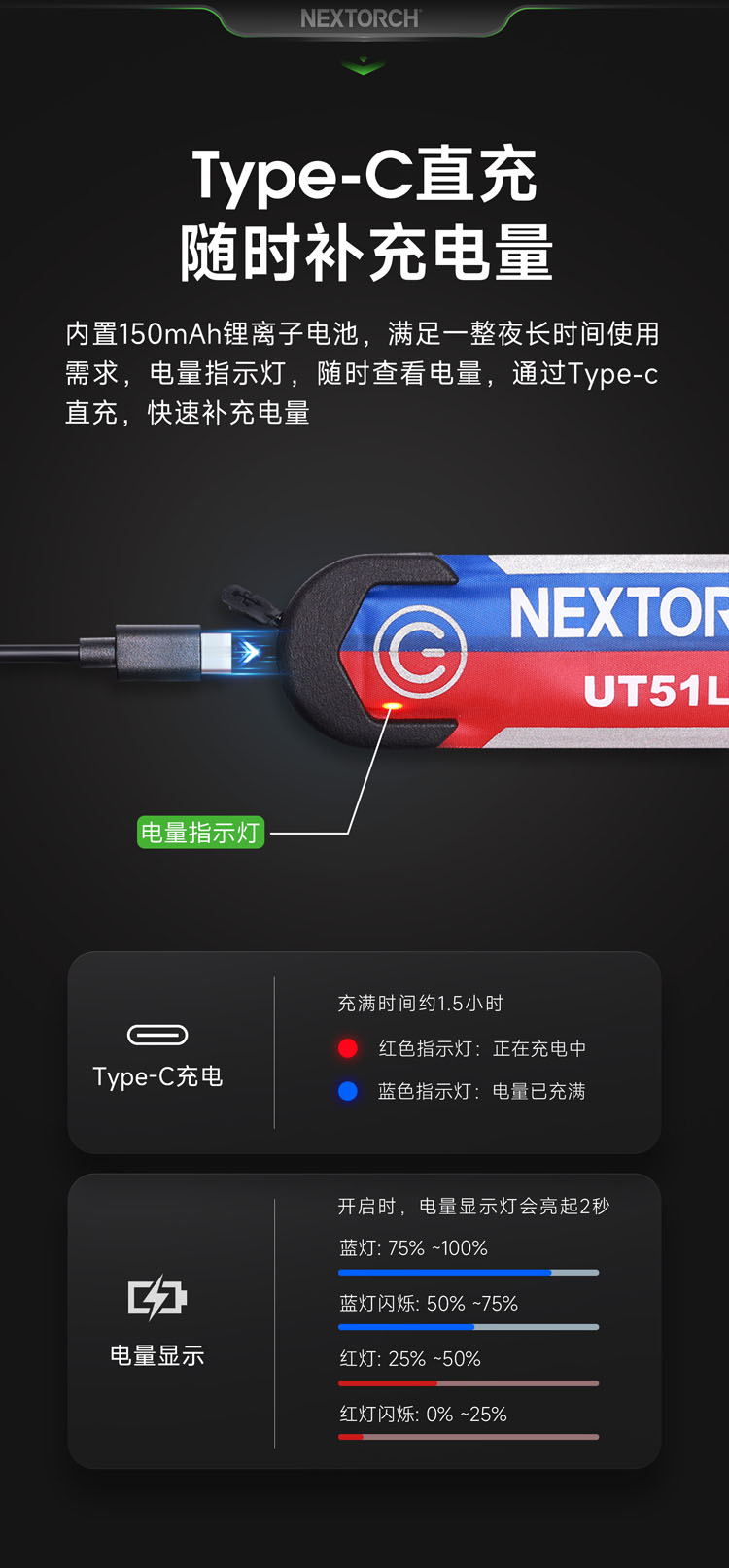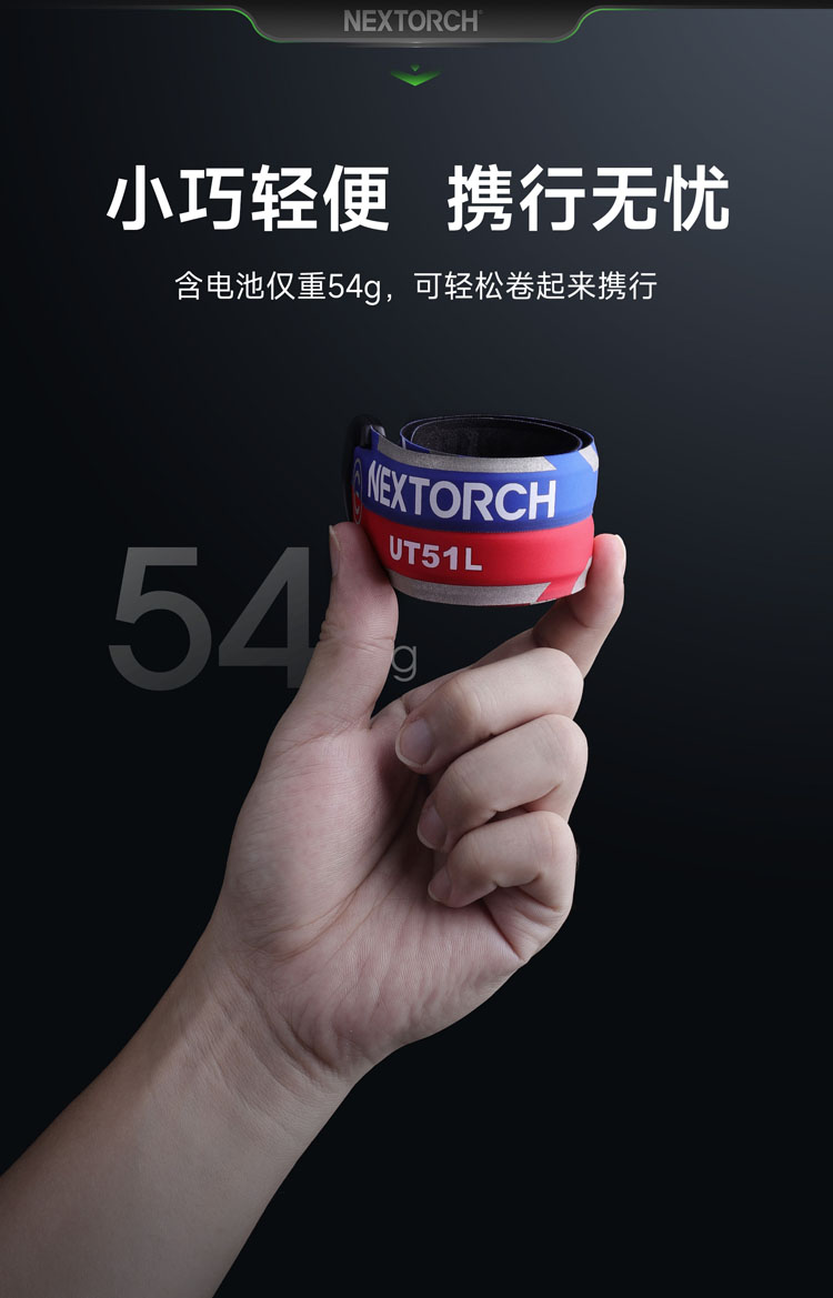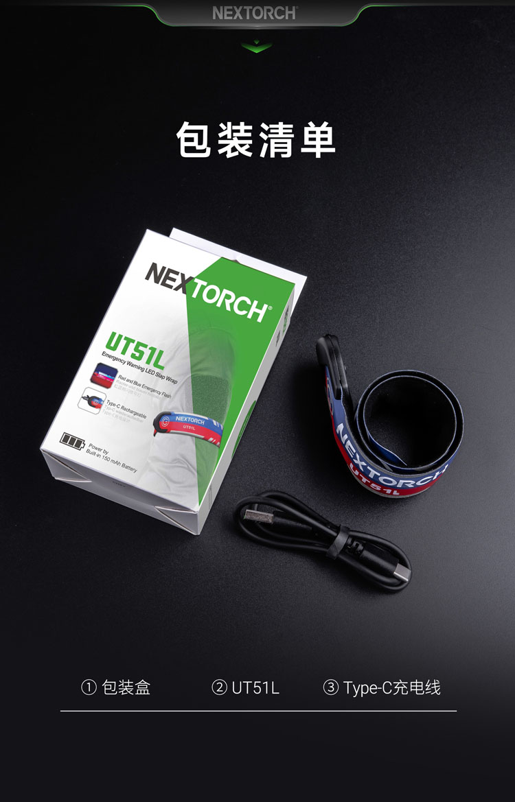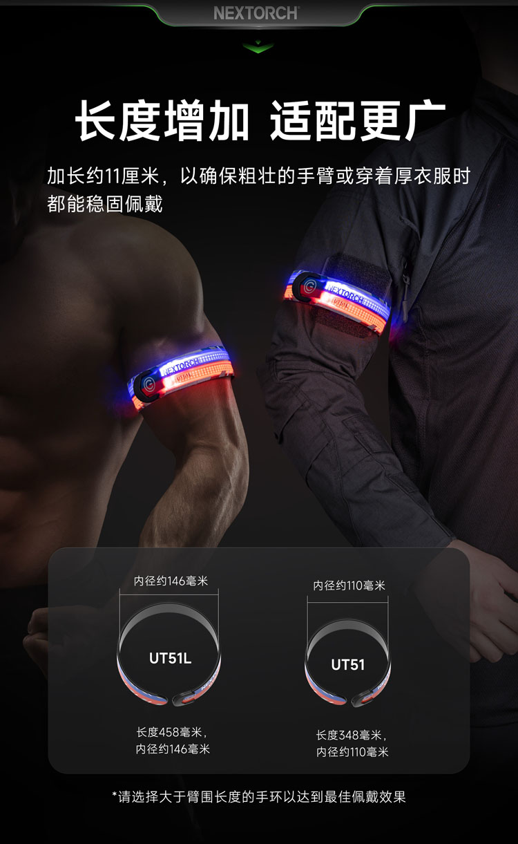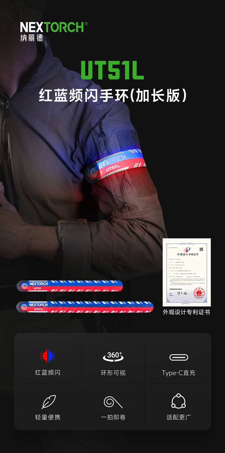 UT51L加长款红蓝警示手环,整体长度增长约11厘米以及新增了一组LED光源,以增强导光性。这一改进确保了即使是粗壮手臂或者在穿着厚衣服的情况下,手环依然能够稳固地佩戴,同时灯光警示效果更好,相信可以带来更舒适和实用的使用体验。 专利红蓝双色手环,外观有趣、功能有用,东方红+保卫蓝双色结合,分色双闪;一拍即卷,迅捷利落,不易脱离,可佩戴于人体与物体上;五种模式一键切换:红闪-蓝闪-红蓝频闪-红光常亮-蓝光常亮,360°环形发光,Type-C直充,被动反光条增加可见度,满足夜间执勤、信号警示、日常轻户外和分组识别等需求。