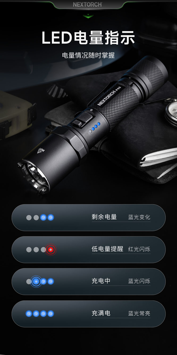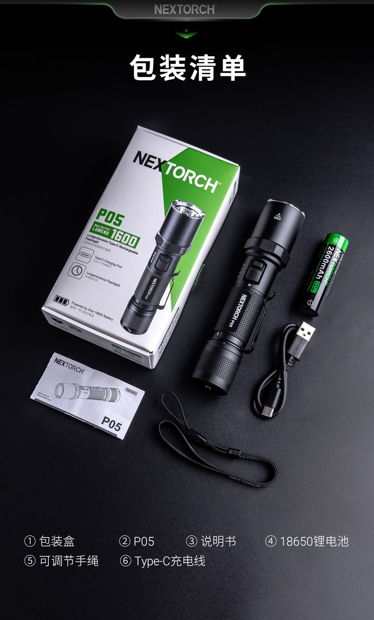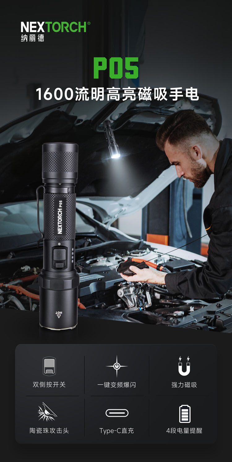 P05,为工业检修、应急救援、夜间巡逻、汽车维修等场景而来,是一支专业可靠的高性能强光手电。延续纳丽德经典P系列的皮实耐操和突出性能,P05还增加了贴心的档位记忆功能。自带强力磁吸尾盖,可解放双手,提升效率。侧按双开关操控便利,一键变频爆闪快速响应,高硬度陶瓷珠破窗头攻防有度,还有大容量的18650锂电池、Type-C直充、电量显示等功能打消您的电量焦虑。量身打造的配件,让您的装备更加如虎添翼手。无论是工业作业,还是日常生活,P05都会是你可靠且值得信赖的好搭档。