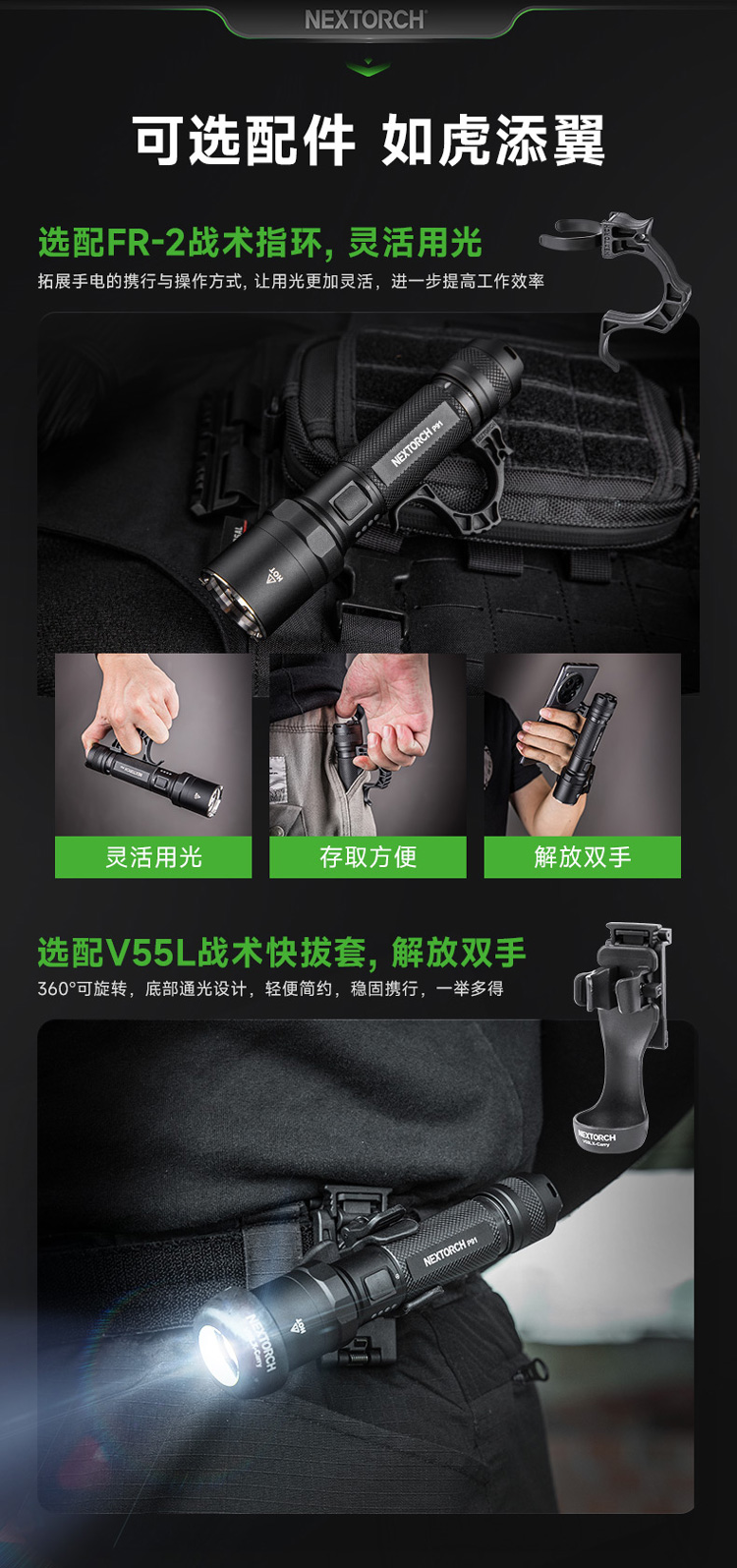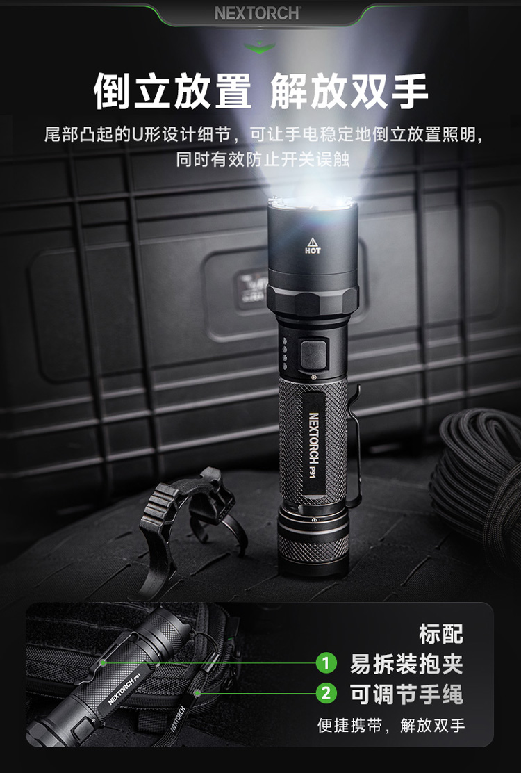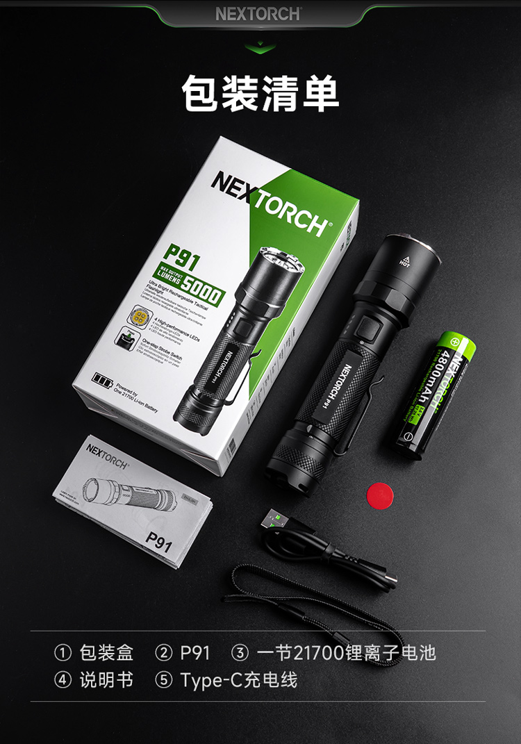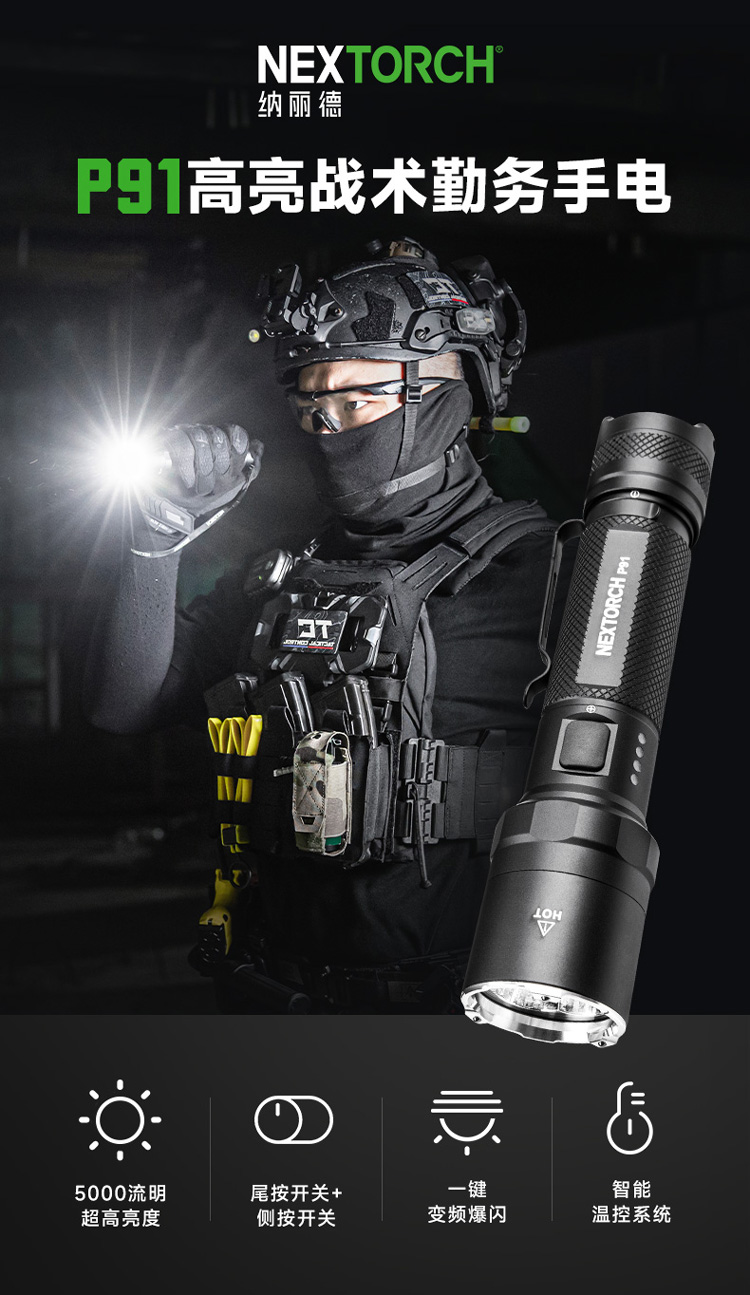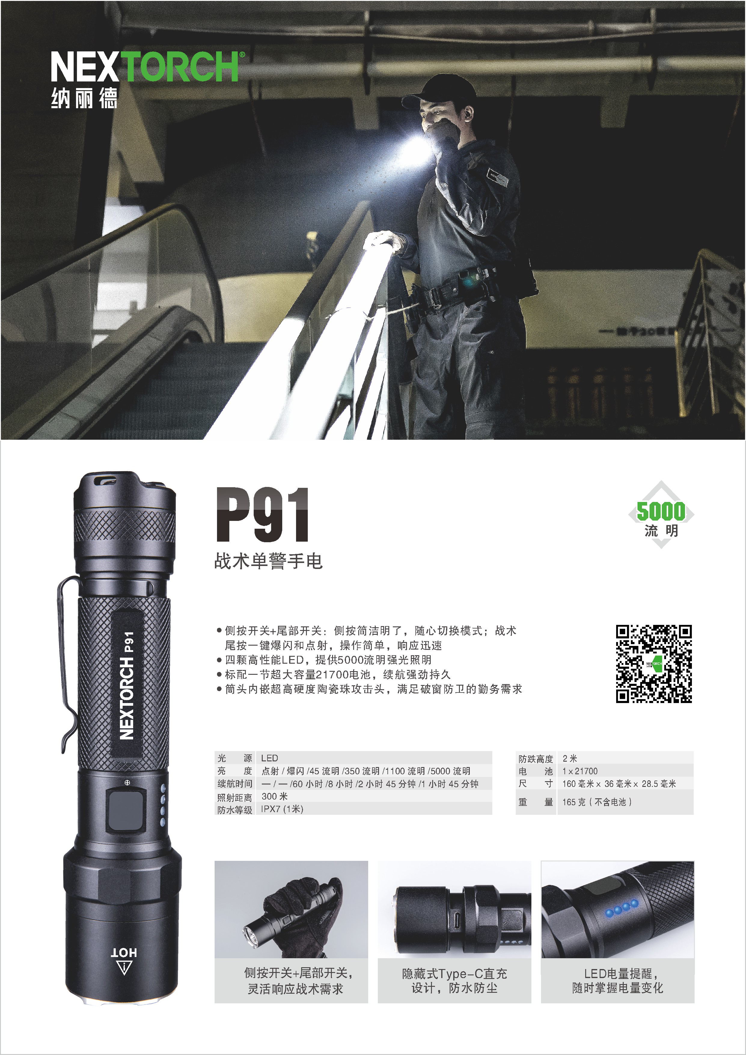 P91是一款融合勤务与战术属性的高亮手电。4颗高性能LED,最高迸发5000流明高亮度,轻松胜任勤务工作、突围行动、战术训练、搜索救援等各种场景。灵活的双开关设计:侧按简洁明了,随心切换模式,长时间握持也舒适;战术尾按一键爆闪和点射,操作简单,响应迅速,掌控战术先机;隐藏式Type-C充电口,续电方便;内置温控系统,安全稳定;IPX7防水,2m防跌,周全防护;可搭配FR-2战术指环/V55L战术快拔套等配件,拓展手电的携行与操作方式,让用光更加灵活,进一步提高工作效率。