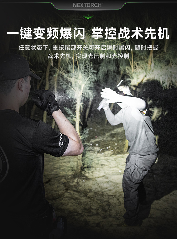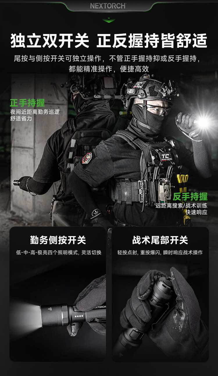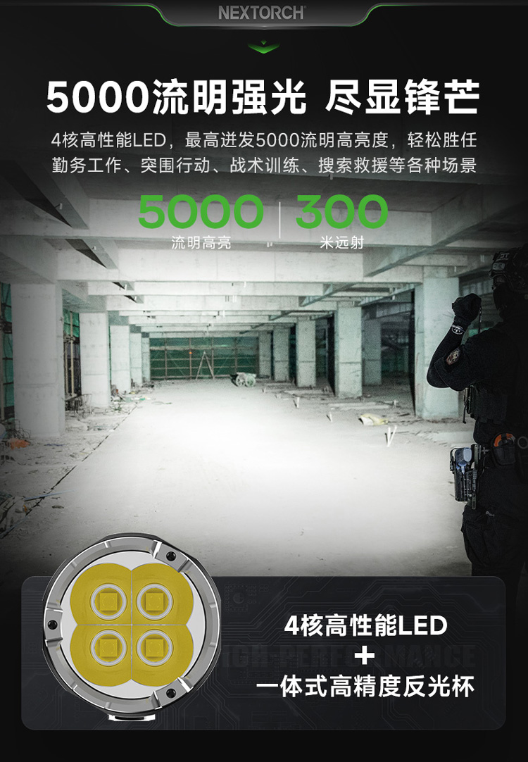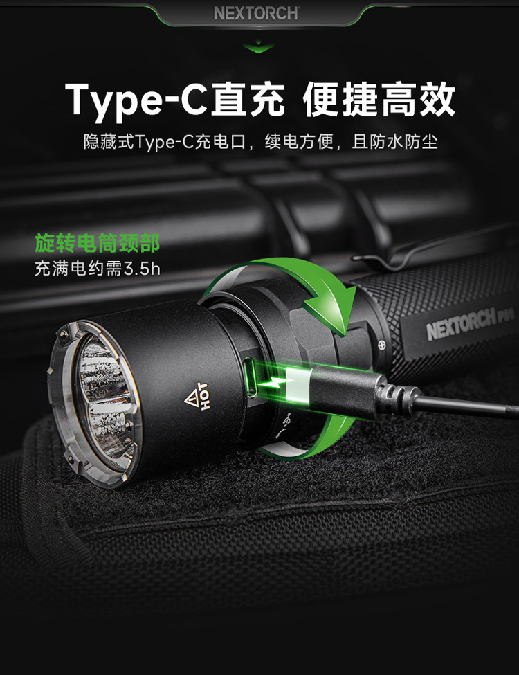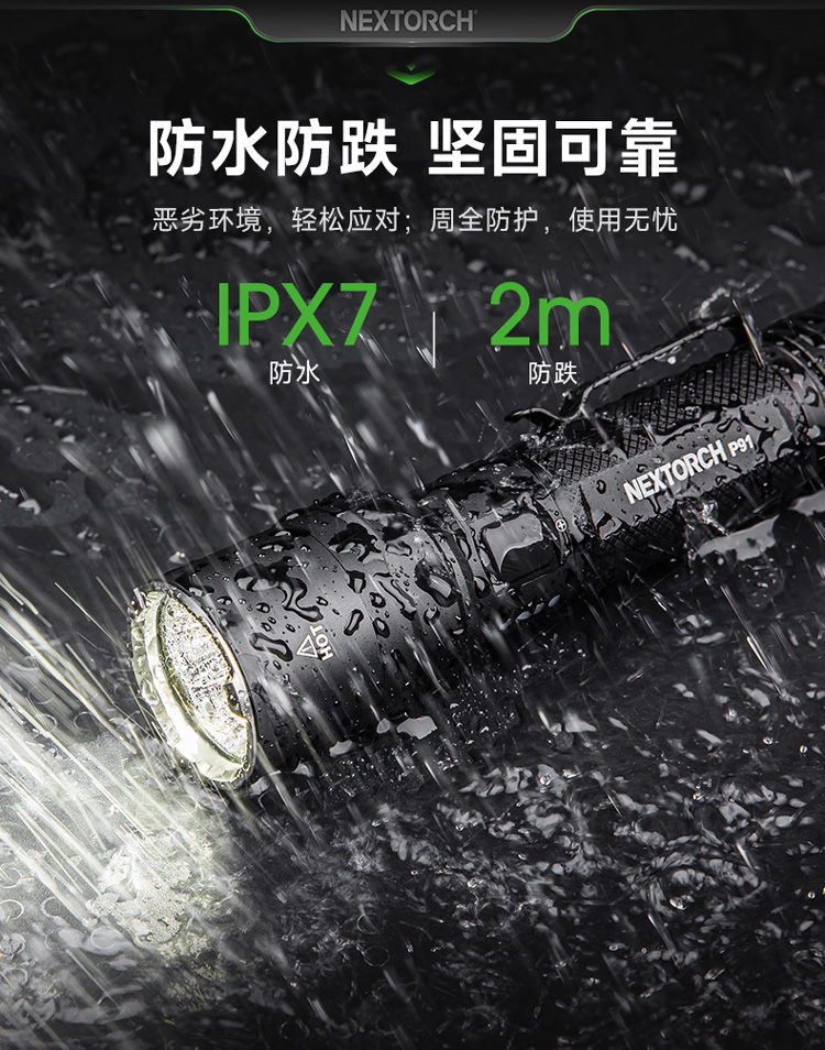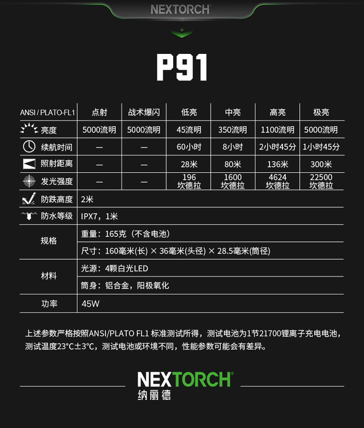 P91是一款融合勤务与战术属性的高亮手电。4颗高性能LED,最高迸发5000流明高亮度,轻松胜任勤务工作、突围行动、战术训练、搜索救援等各种场景。灵活的双开关设计:侧按简洁明了,随心切换模式,长时间握持也舒适;战术尾按一键爆闪和点射,操作简单,响应迅速,掌控战术先机;隐藏式Type-C充电口,续电方便;内置温控系统,安全稳定;IPX7防水,2m防跌,周全防护;可搭配FR-2战术指环/V55L战术快拔套等配件,拓展手电的携行与操作方式,让用光更加灵活,进一步提高工作效率。