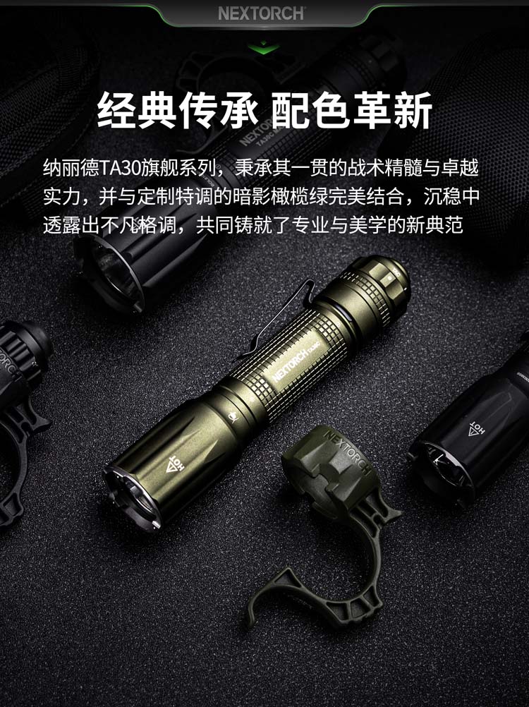 在战术装备的世界里,配色不仅是视觉的呈现,更是理念与精神的表达。纳丽德作为战术手电的先锋,再度引领潮流,携TA30旗舰系列以全新的橄榄绿配色亮相。这一配色不仅延续了品牌的经典传承,更是一次大胆的革新,展现出沉稳中蕴含的不凡格调,让专业与美学在光影交错中相遇。