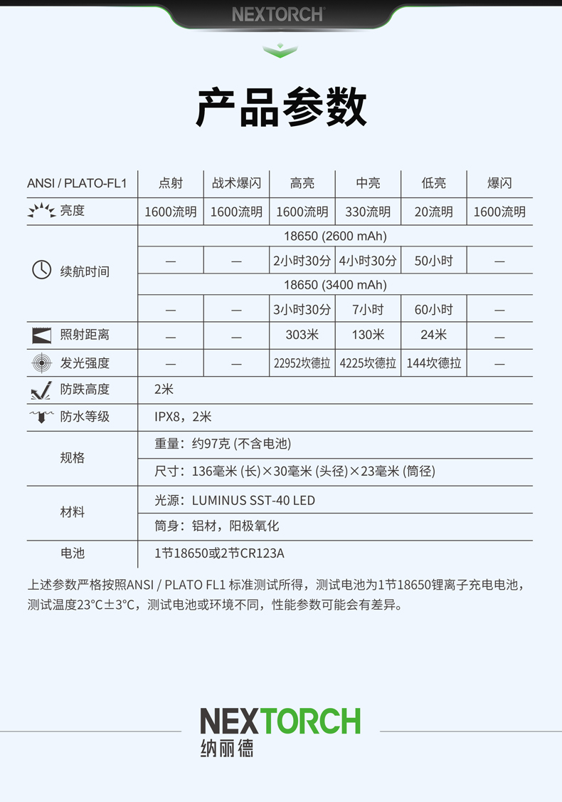 • • 亮度:点射/一键变频爆闪/20流明/330流明/1600流明/战术爆闪