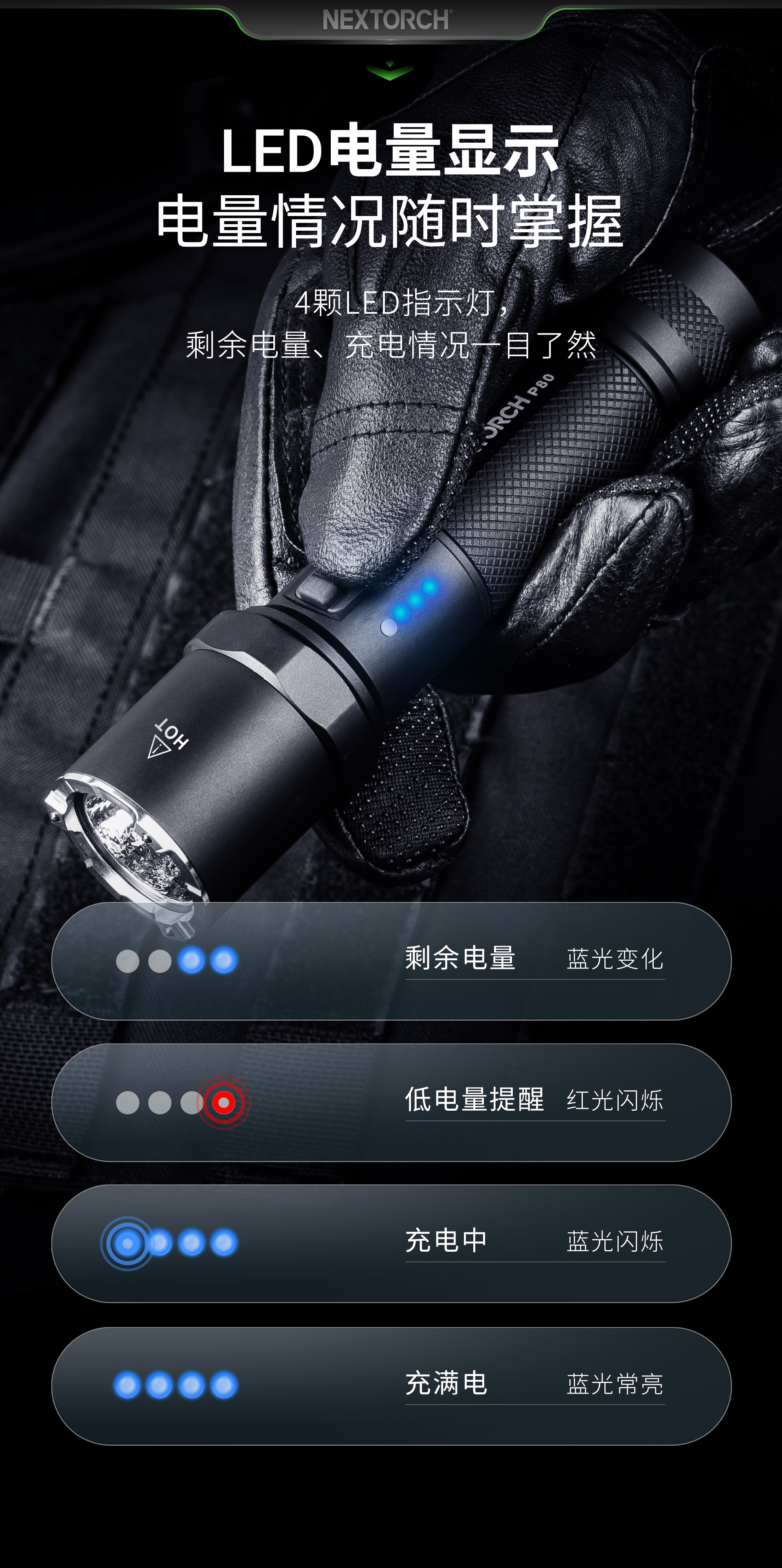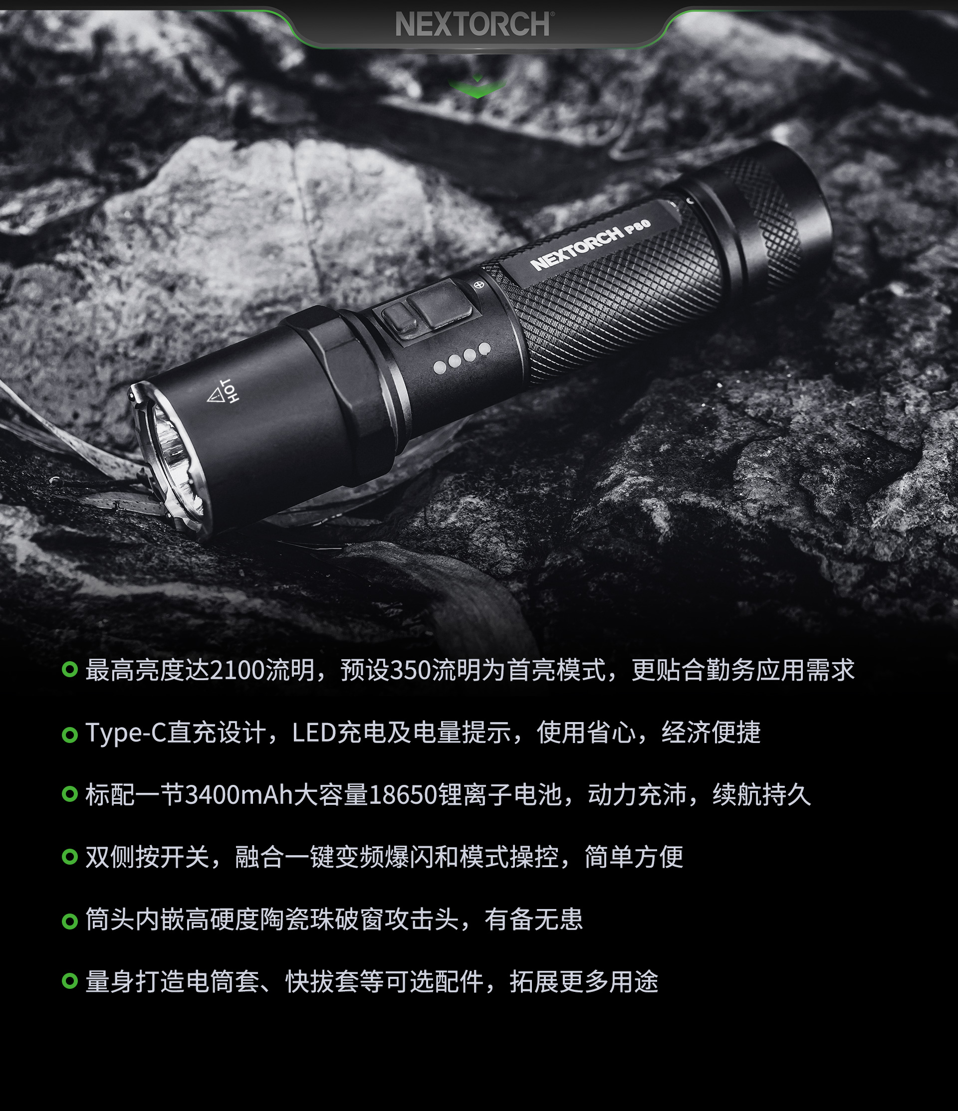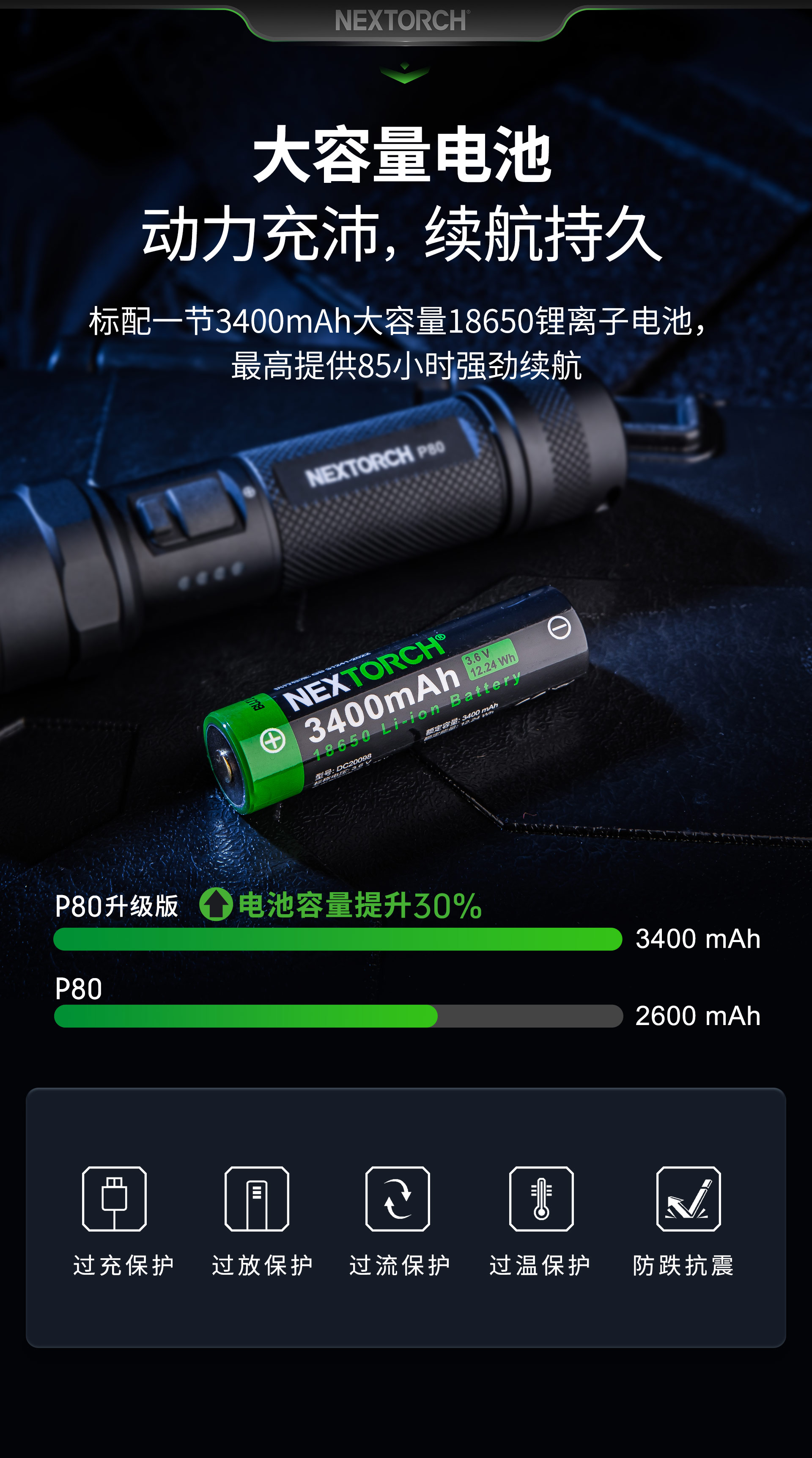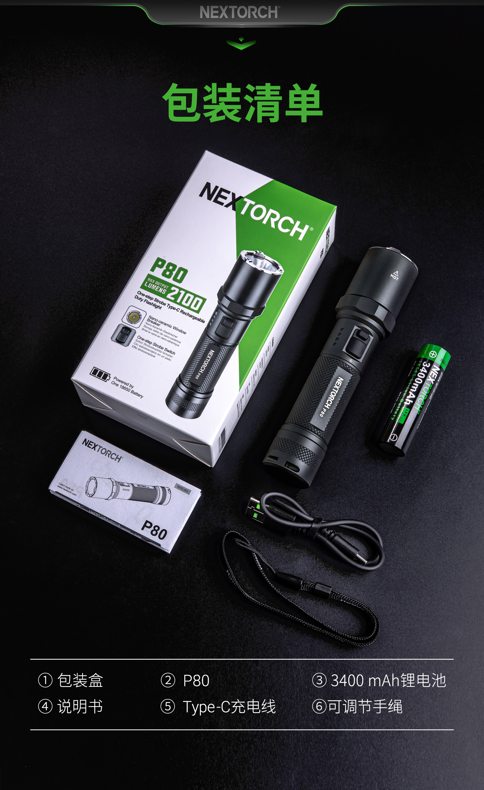 P80焕新而来,携2100流明超高亮度、380米远射以及3400mAh大容量锂离子电池,实现性能的华丽升级。纳丽德P80,全能型高亮强光手电,仅它便可解决勤务战术、户外探险、生活日用等场景的照明需求;勤务执法人员需要从警戒巡逻、设卡检查等勤务状态,切换到侦查搜索、对峙抓捕等战术行动,一支专业可靠的勤务手电让他们如虎添翼;逃离城市的喧嚣去野外露营探险,面对大自然伸手不见五指的漆黑夜晚,一支明亮的手电给你的户外之旅增趣添亮和安全保护;出于对黑暗天生的恐惧,我们下意识地去寻找光明所在,将一支多功能的手电带在身边,让光明与安全随行。