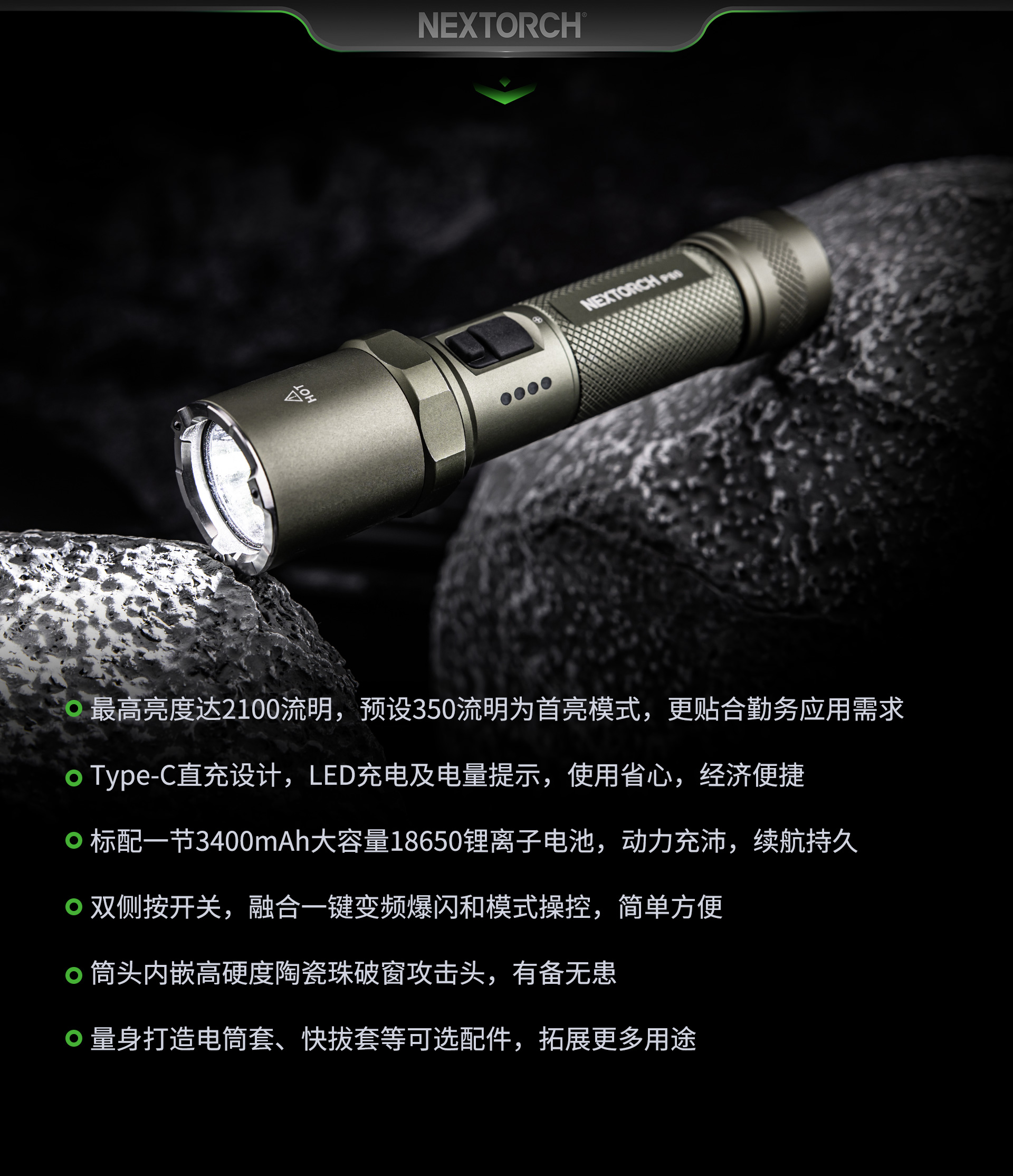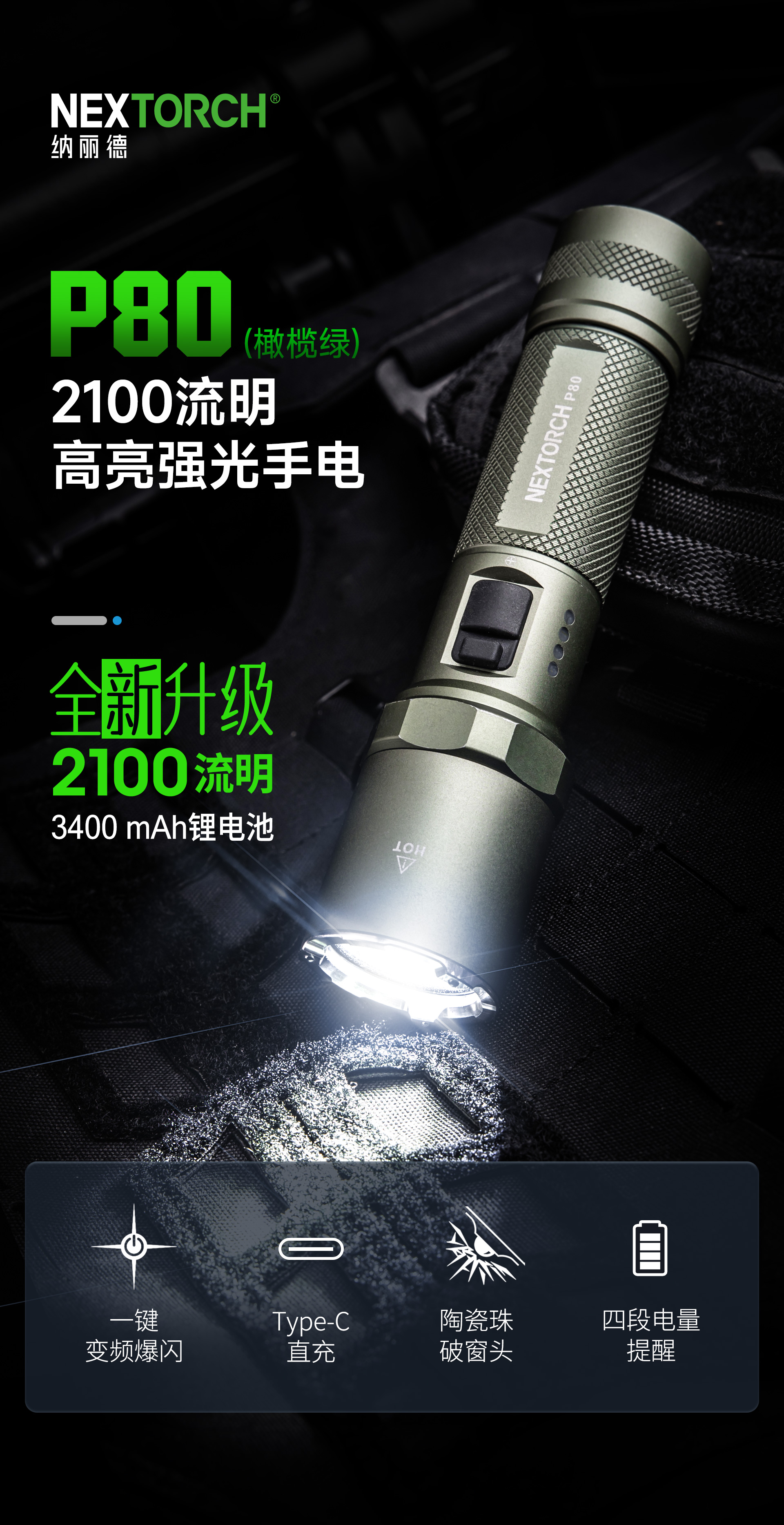 纳丽德–全球专业的移动照明装备品牌-橄榄绿·P80高亮强光手电·2100流明3400mAh电池升级版