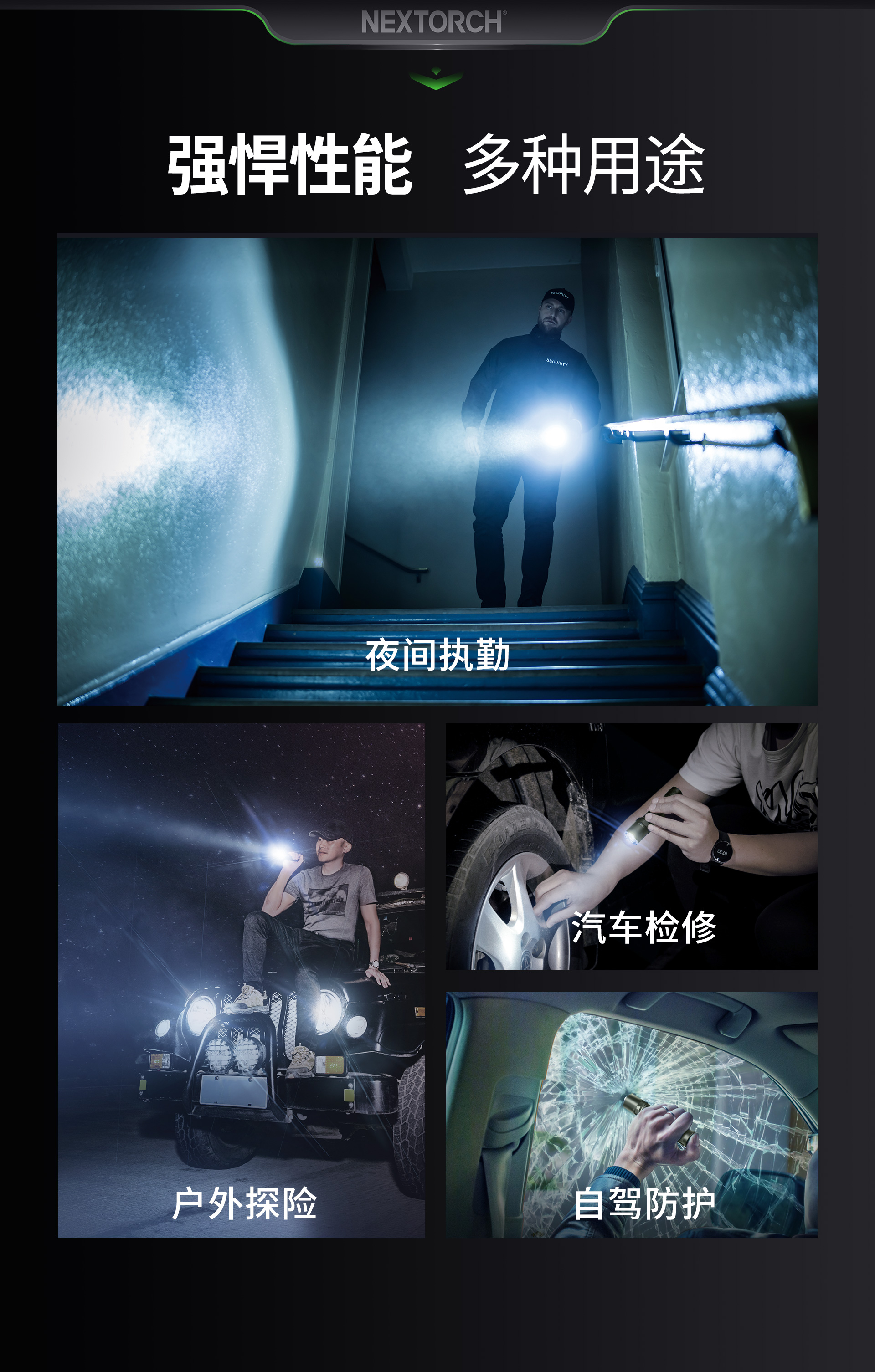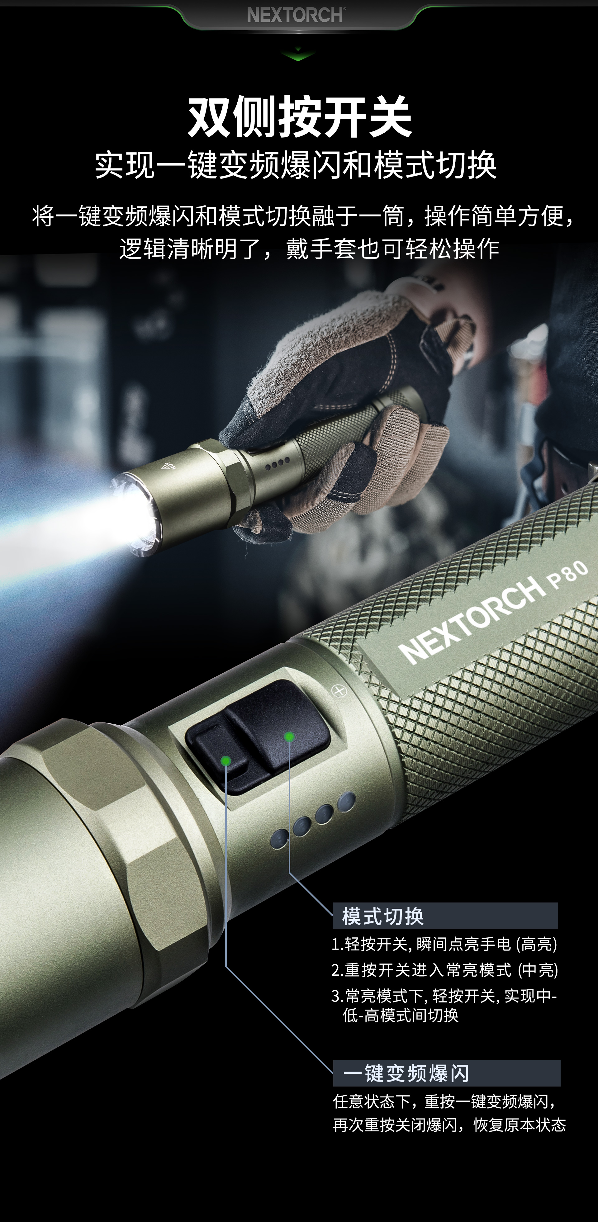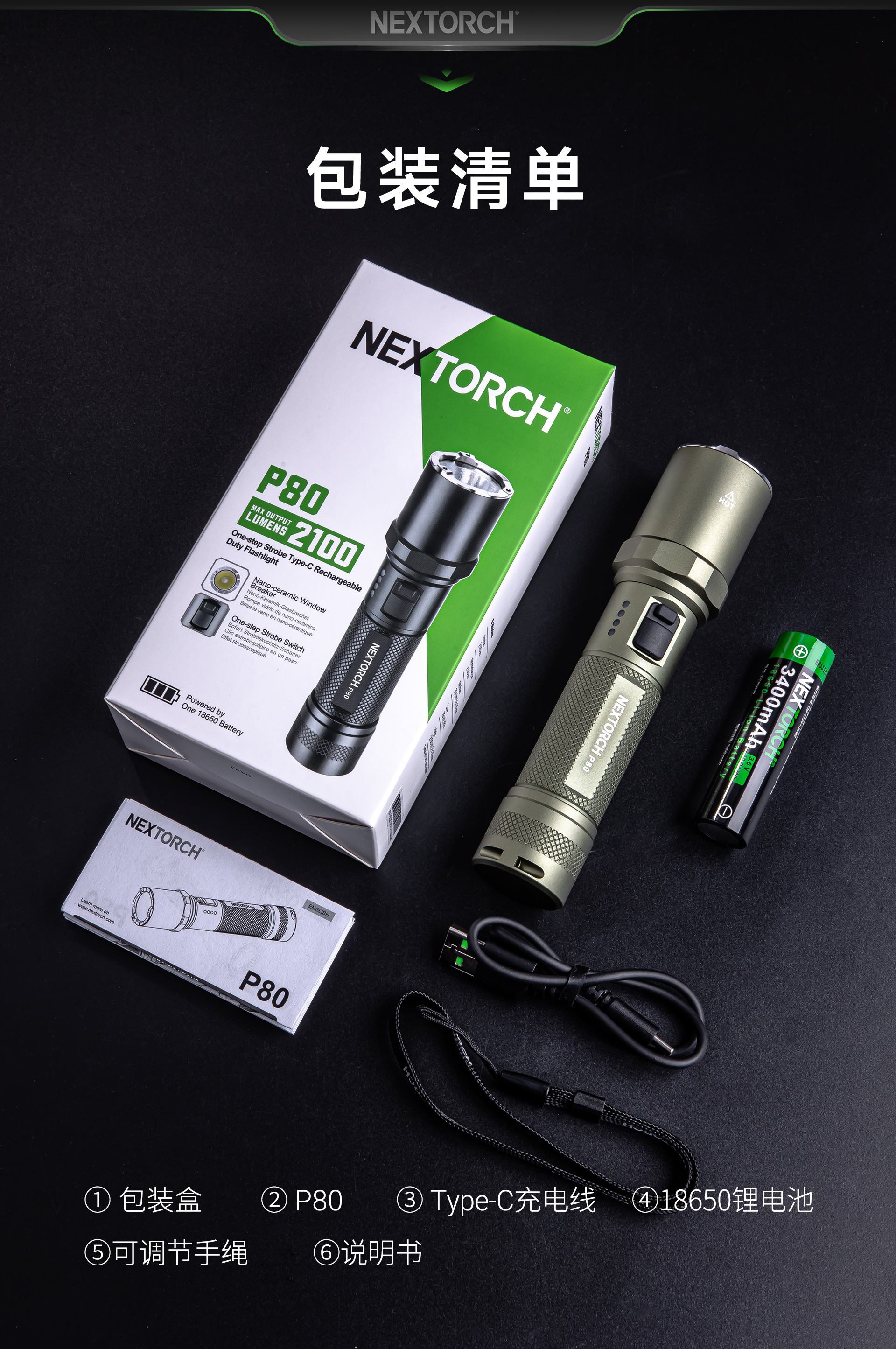 P80焕新而来,携2100流明超高亮度、380米远射和3400mAh大容量锂离子电池,实现性能的华丽升级。纳丽德P80,全能型高亮强光手电,仅它便可解决勤务战术、户外探险、生活日用等场景的照明需求;勤务执法人员需要从警戒巡逻、设卡检查等勤务状态,切换到侦查搜索、对峙抓捕等战术行动,一支专业可靠的勤务手电让他们如虎添翼;逃离城市的喧嚣去野外露营探险,面对大自然伸手不见五指的漆黑夜晚,一支明亮的手电给你的户外之旅增趣添亮和安全保护;出于对黑暗天生的恐惧,我们下意识地去寻找光明所在,将一支多功能的手电带在身边,让光明与安全随行。