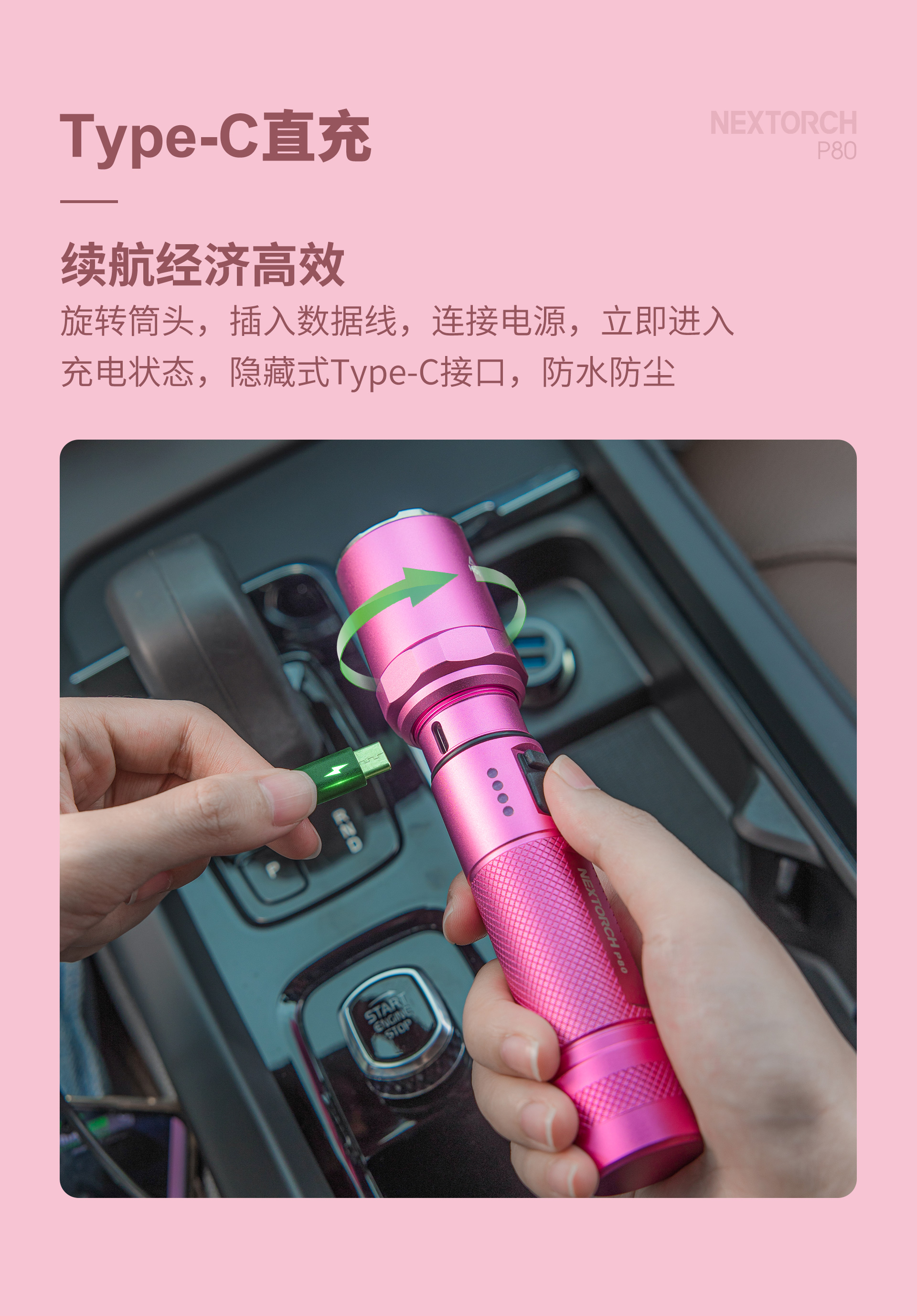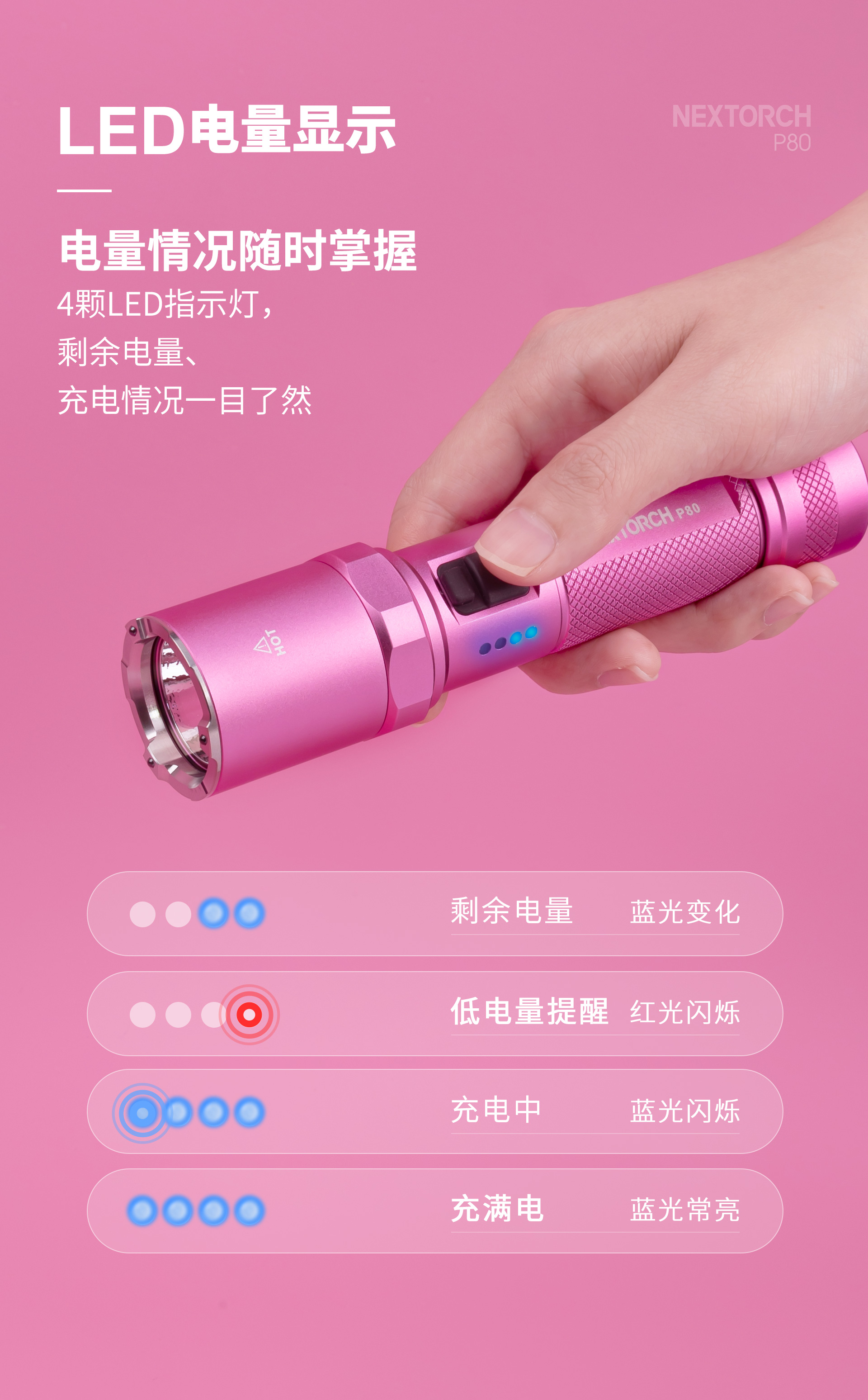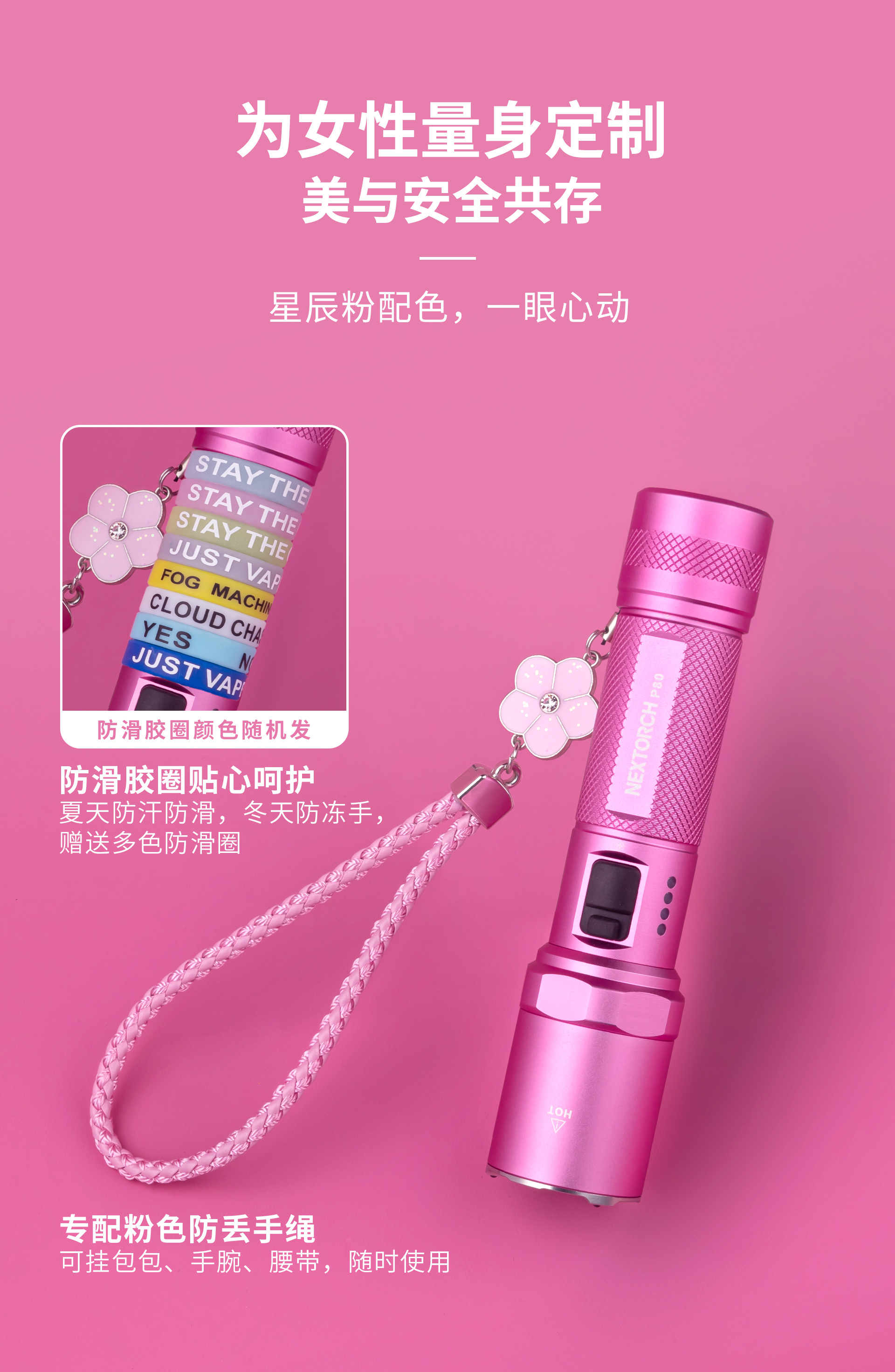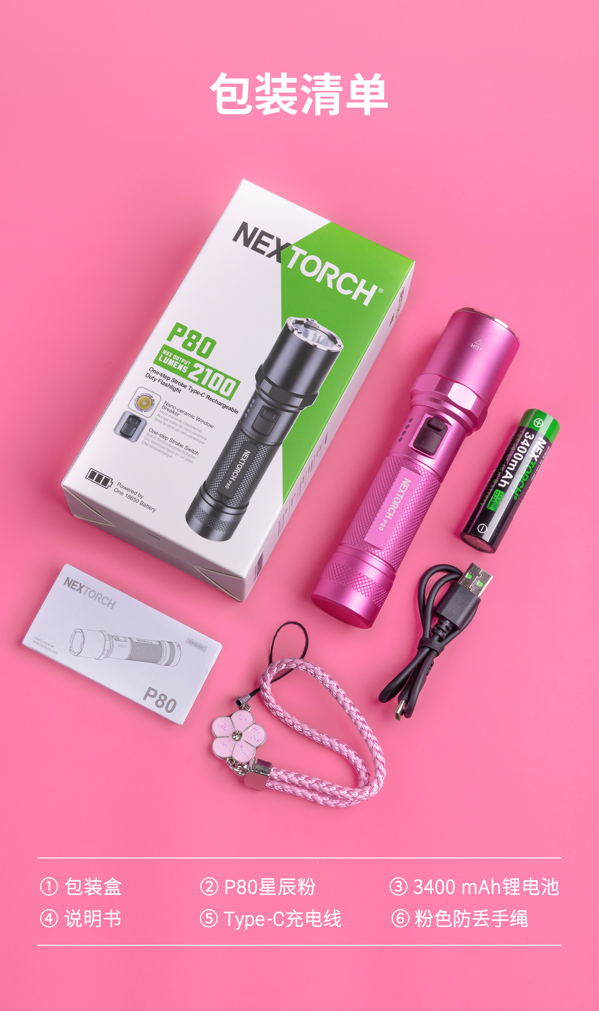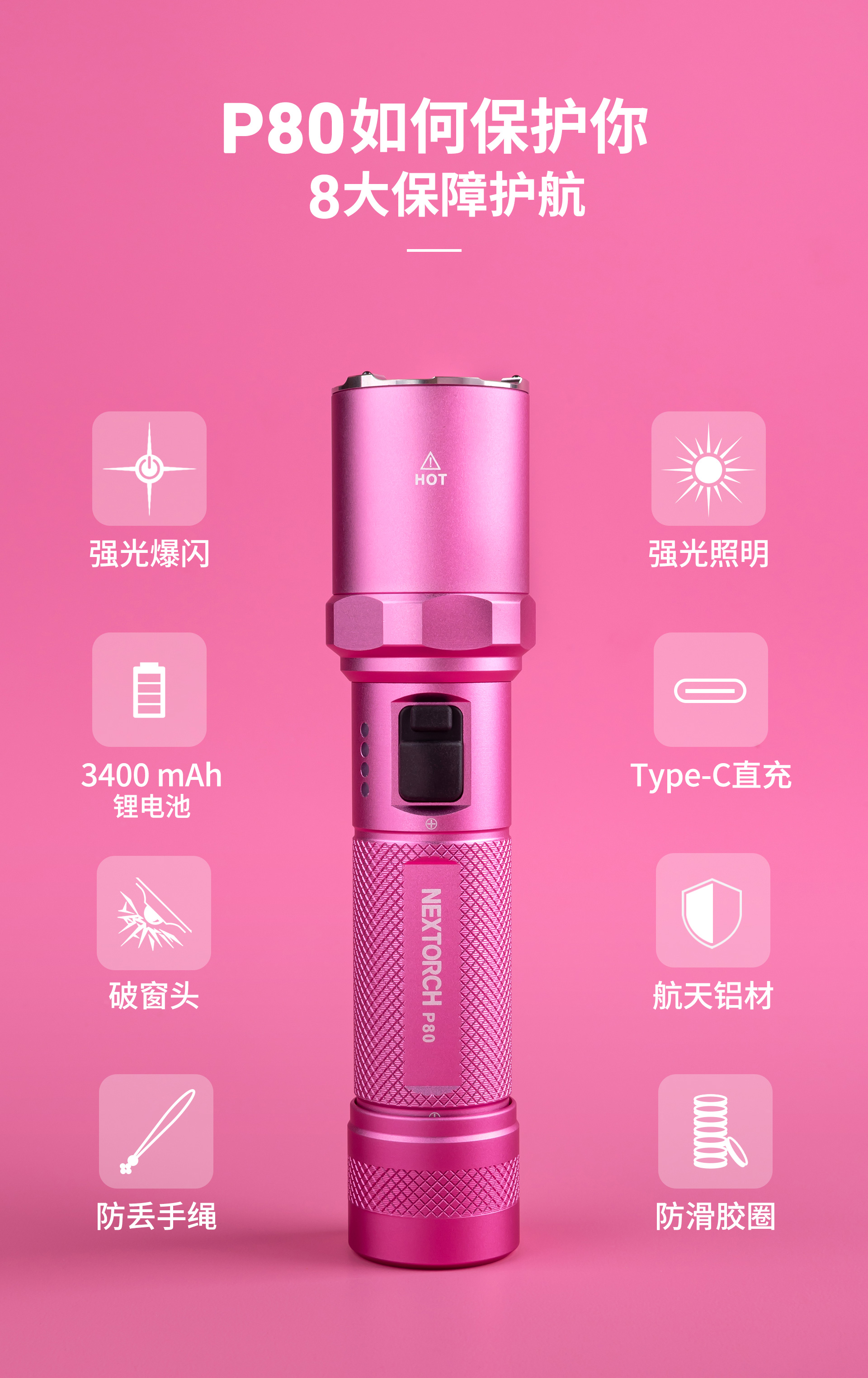 打破传统的黑与灰,我们为独立、自信、热爱生活的你,打造专属光芒;源自专业,安全、可靠、美感,缺一不可,P80携全新星辰粉配色焕新而来。一支明亮的手电给你的户外之旅增趣添亮和安全保护;出于对黑暗天生的恐惧,我们下意识地去寻找光明所在,将一支多功能的手电带在身边,让光明与安全随行。