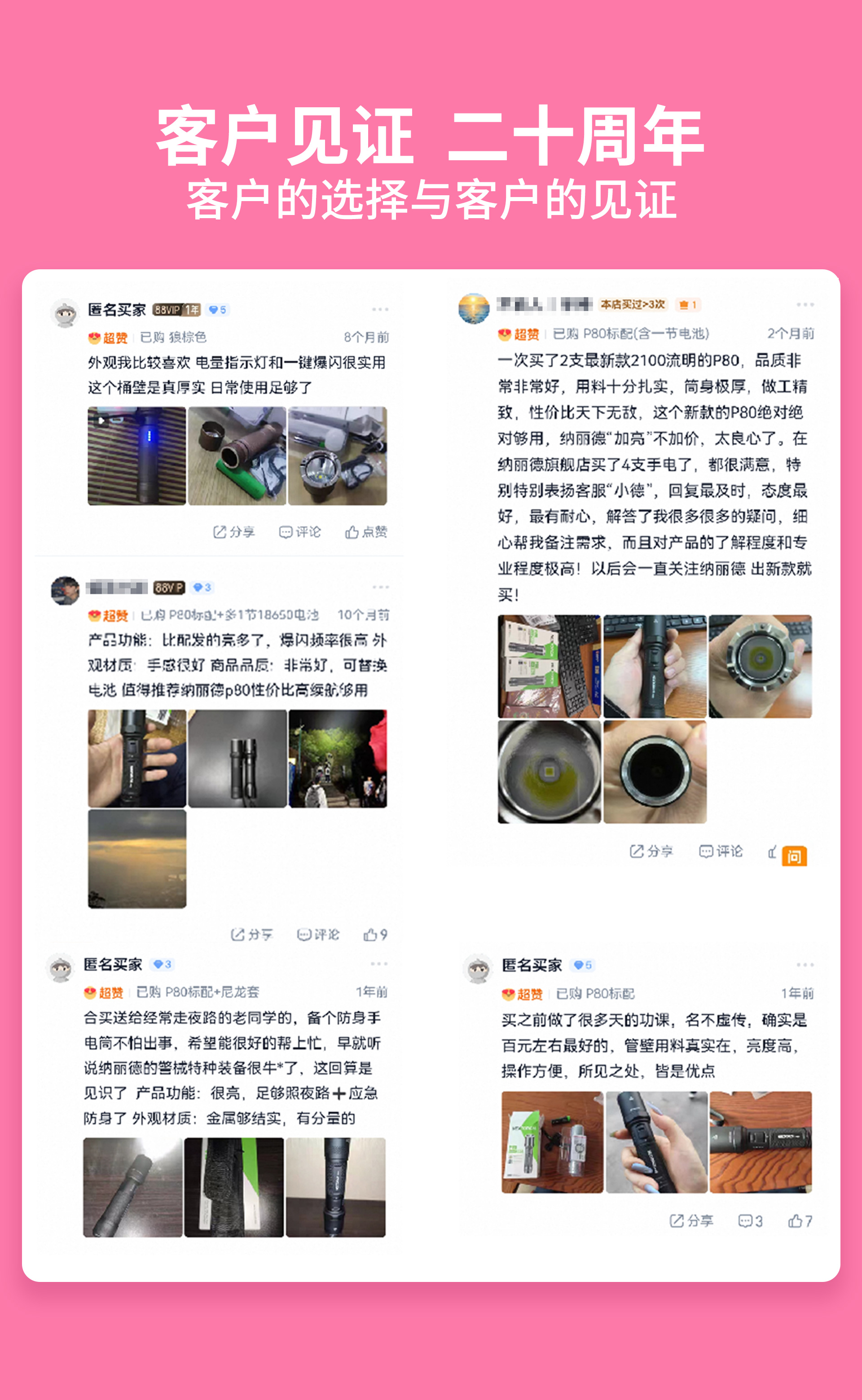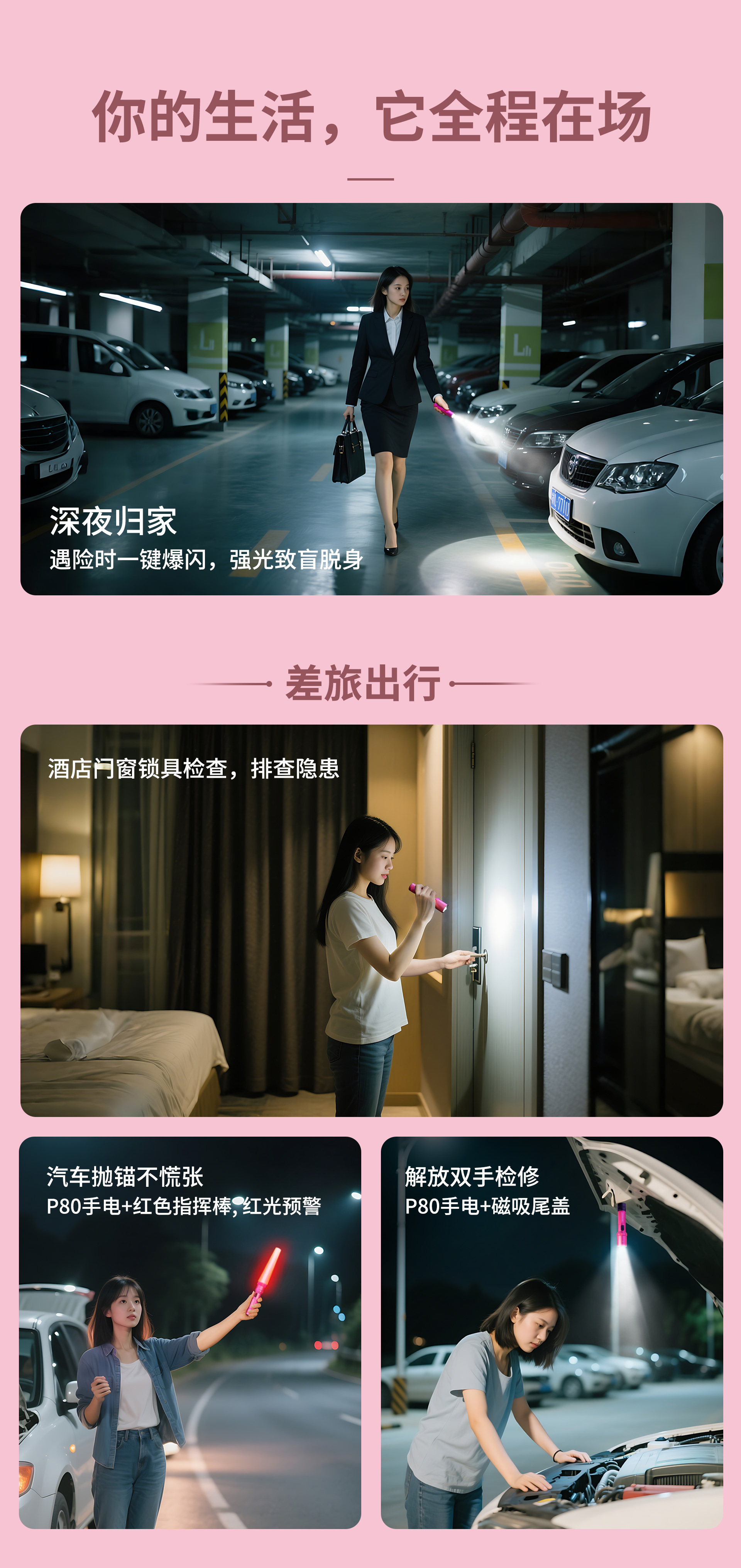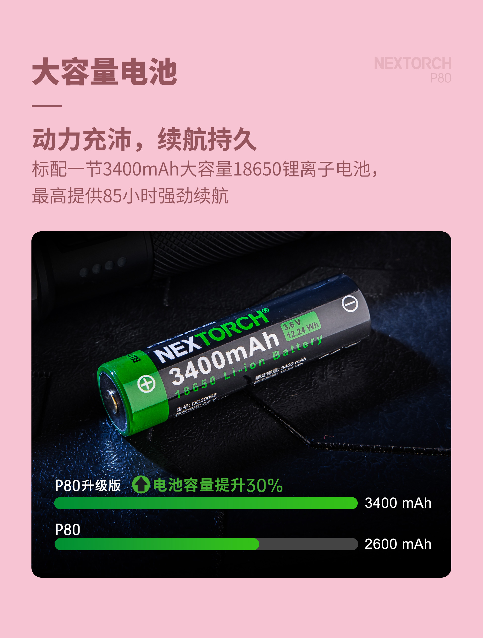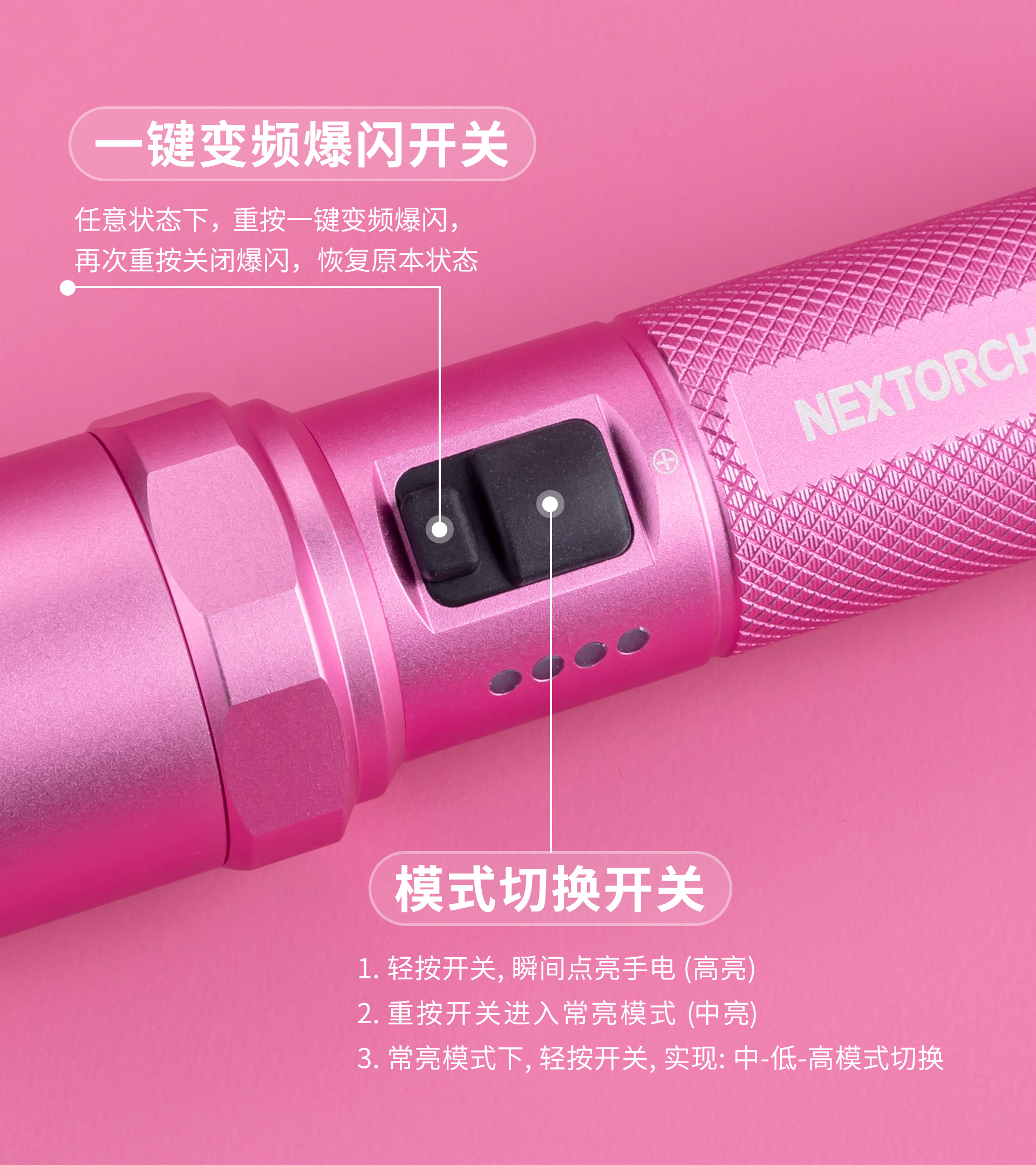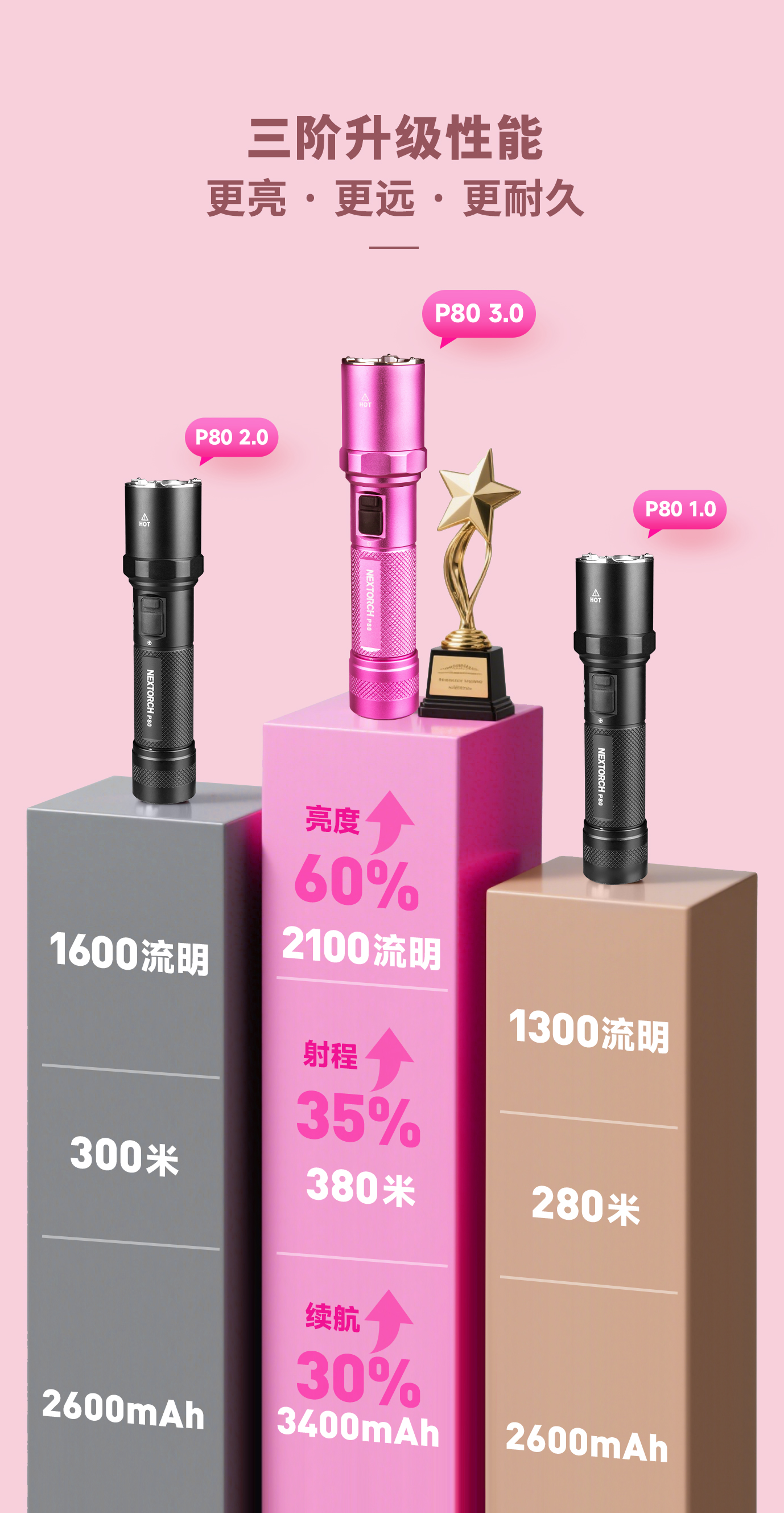 打破传统的黑与灰,我们为独立、自信、热爱生活的你,打造专属光芒;源自专业,安全、可靠、美感,缺一不可,P80携全新星辰粉配色焕新而来。一支明亮的手电给你的户外之旅增趣添亮和安全保护;出于对黑暗天生的恐惧,我们下意识地去寻找光明所在,将一支多功能的手电带在身边,让光明与安全随行。