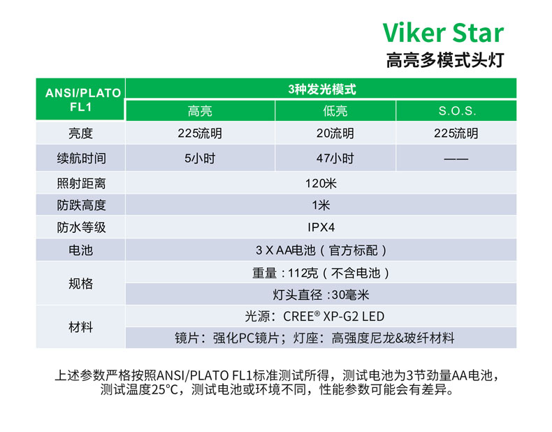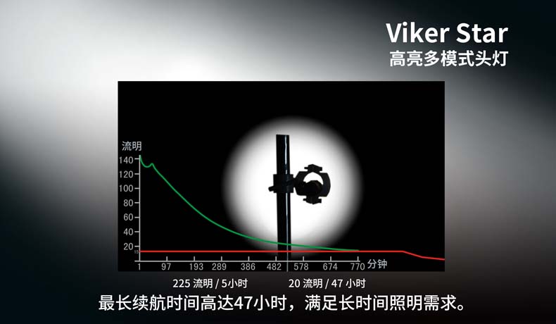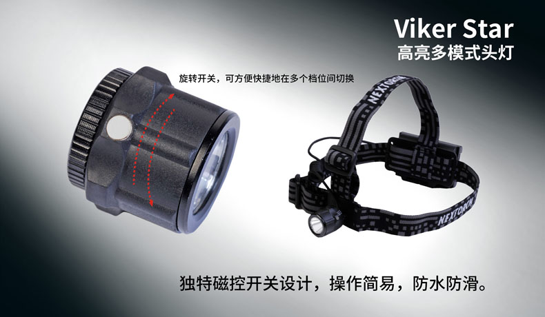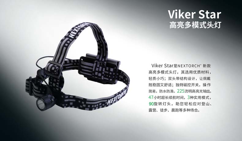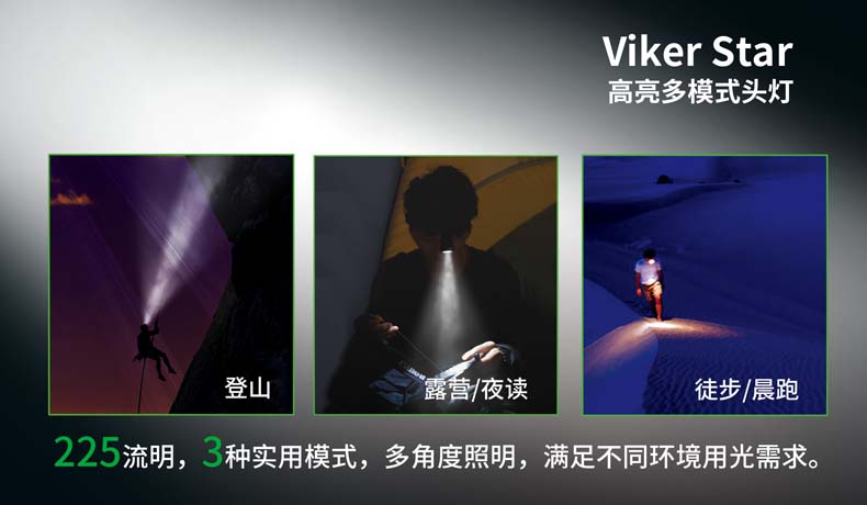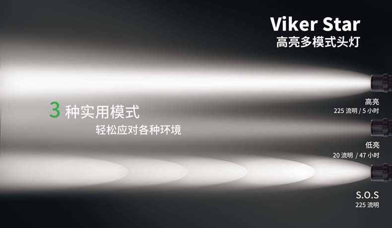 Viker Star是一款高亮多模式头灯,其选用优质材料,轻质小巧;双头带结构设计,让佩戴既稳固又舒适;磁控开关,操作简易,防水防滑。225流明高亮光输出,47小时超长续航时间,3种实用模式,旋转灯头,助您轻松应对登山、露营、徒步、晨跑等多种场合。
