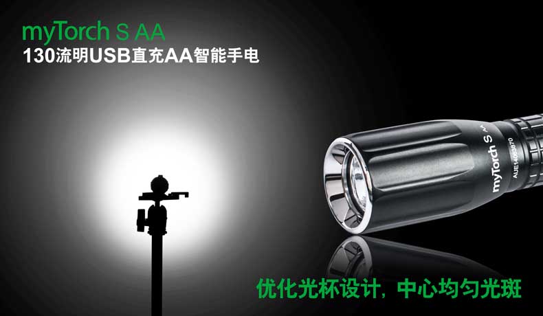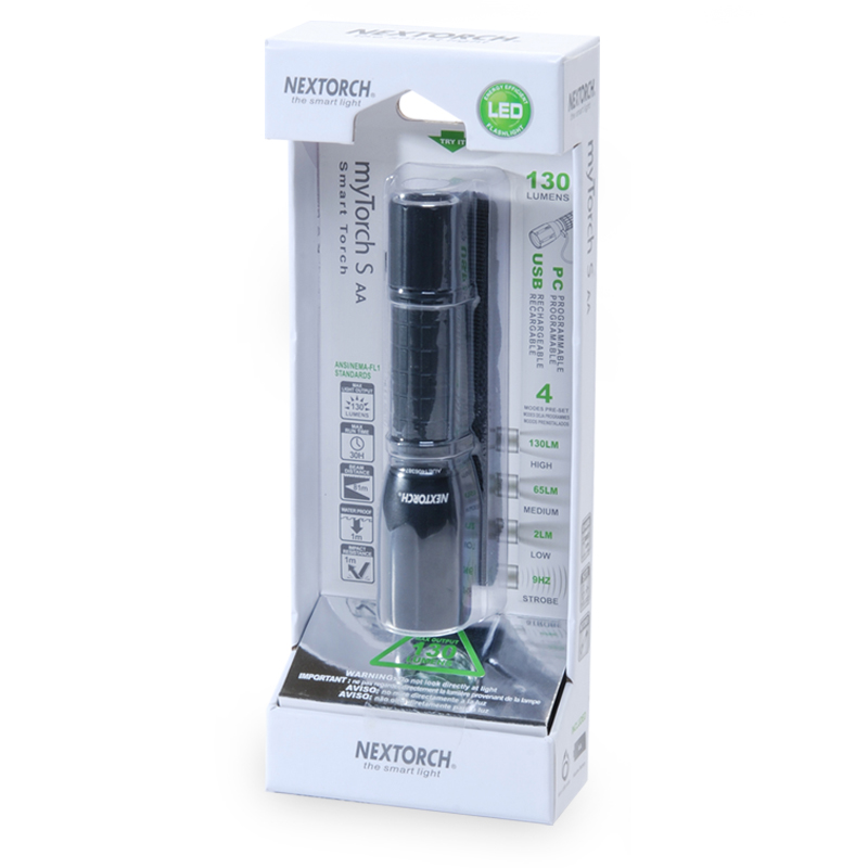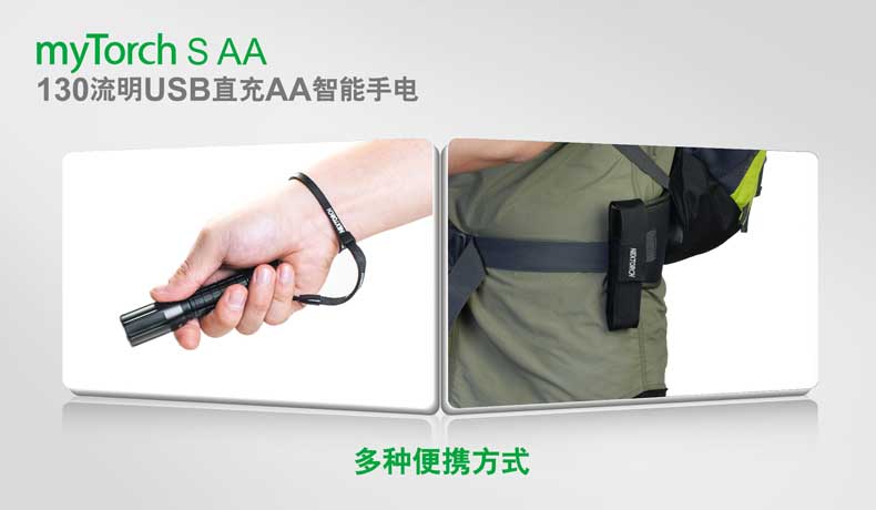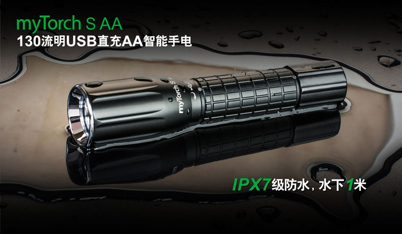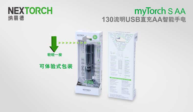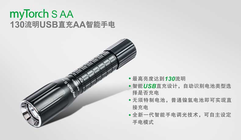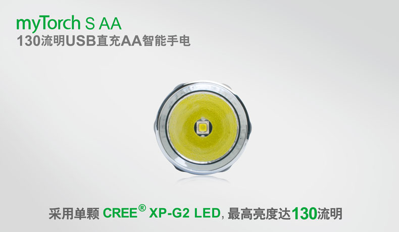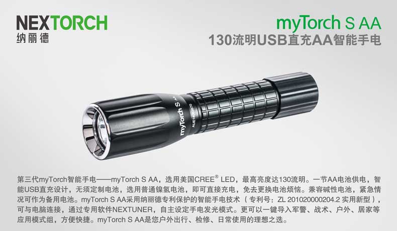 第三代myTorch智能手电——myTorch S AA,选用美国CREE® LED,最高亮度达130流明。一节AA电池供电,智能USB直充设计,无须定制电池,选用普通镍氢电池,即可直接充电,免去更换电池烦恼。兼容碱性电池,紧急情况可作为备用电池。myTorch S AA采用纳丽德专利保护的智能手电技术(专利号:ZL 201020000204.2 实用新型),可与电脑连接,通过专用软件NEXTUNER,自主设定手电发光模式。更可以一键导入军警、战术、户外、居家等应用模式组,方便快捷。myTorch S AA是您户外出行、检修、日常使用的理想之选。