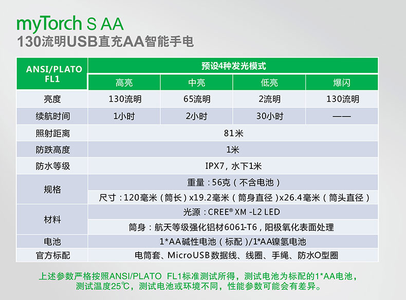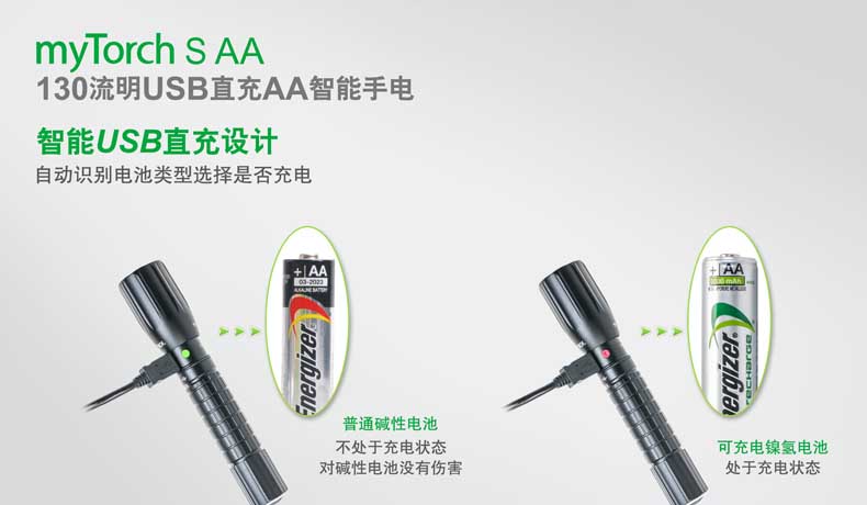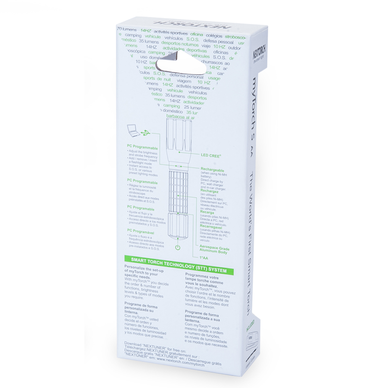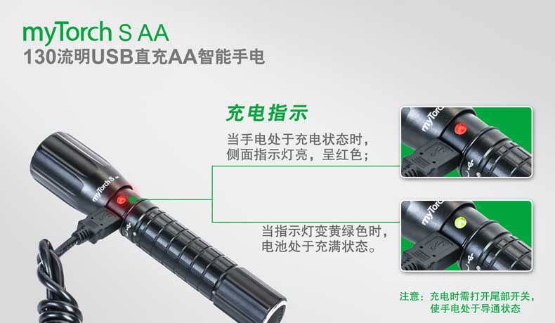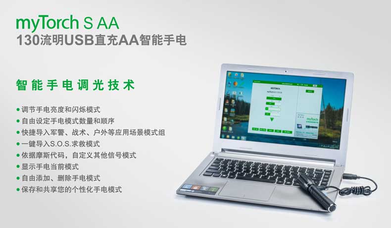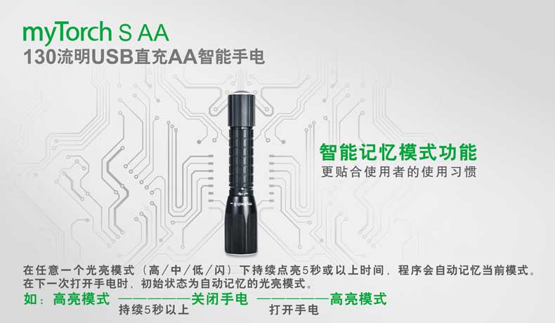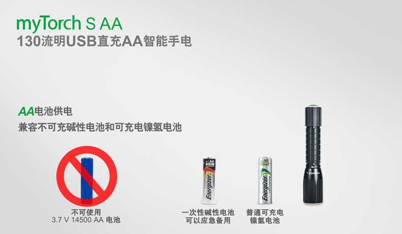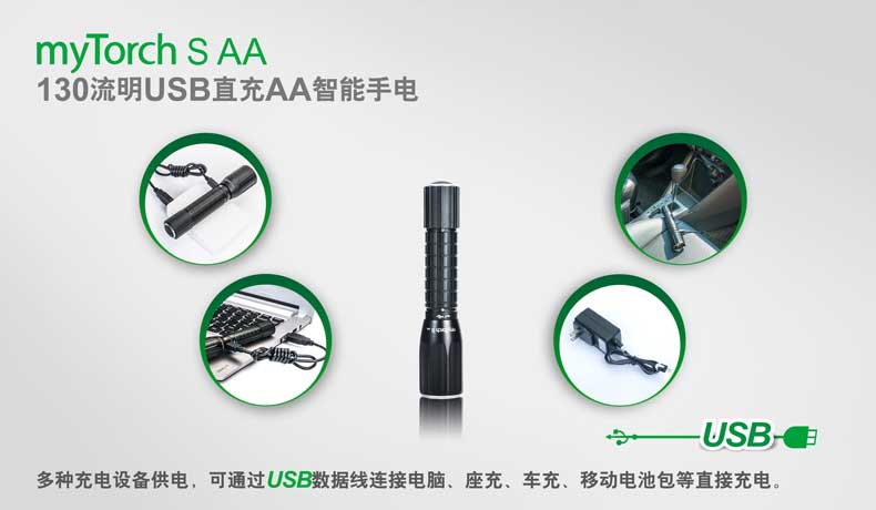 第三代myTorch智能手电——myTorch S AA,选用美国CREE® LED,最高亮度达130流明。一节AA电池供电,智能USB直充设计,无须定制电池,选用普通镍氢电池,即可直接充电,免去更换电池烦恼。兼容碱性电池,紧急情况可作为备用电池。myTorch S AA采用纳丽德专利保护的智能手电技术(专利号:ZL 201020000204.2 实用新型),可与电脑连接,通过专用软件NEXTUNER,自主设定手电发光模式。更可以一键导入军警、战术、户外、居家等应用模式组,方便快捷。myTorch S AA是您户外出行、检修、日常使用的理想之选。