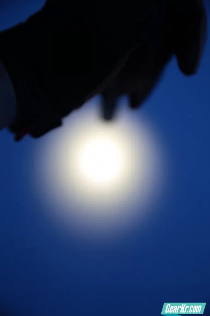通过旋转头部可切换高亮档位和低亮档位,低亮档位适合近距离照明,光线柔和并不刺眼。高亮档位相对于目前大多数手电将光斑分为中心聚光和四周泛光的设计,这款手电的聚光并不明显,远射能力并不强劲,但是2米—8米内的照明却因为没有中心部分的刺眼光斑而更适合日常照明,肉眼观看更为舒适。