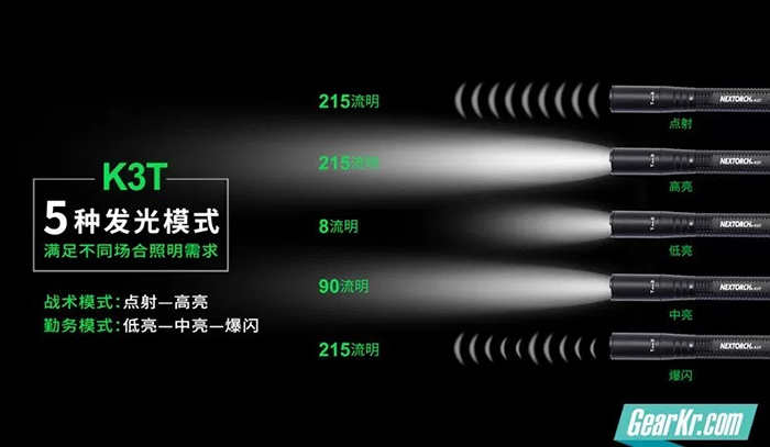 引用官方介绍来说明下关于5种模式的切换方式。将灯头向D字母方向旋转,按压尾按,可以切换低亮-中亮—爆闪三种模式,将灯头向T字母方向转动,可将模式切换为点射—高亮模式。以上几种模式,不管是对于战术使用还是日常使用,都是绰绰有余了。