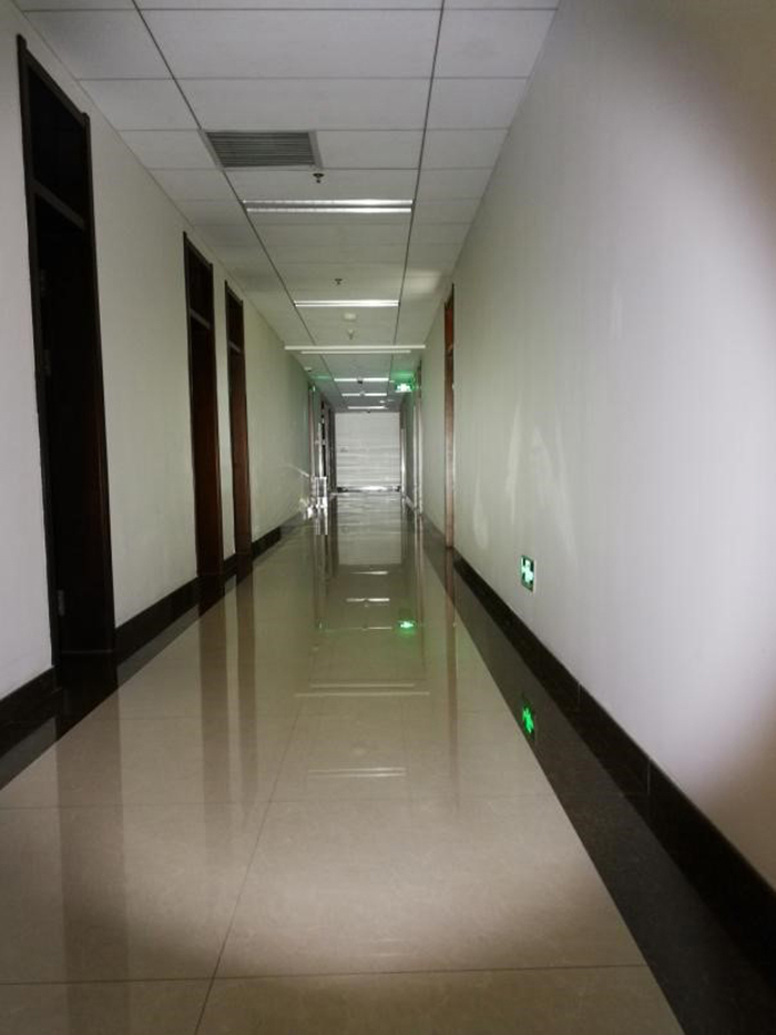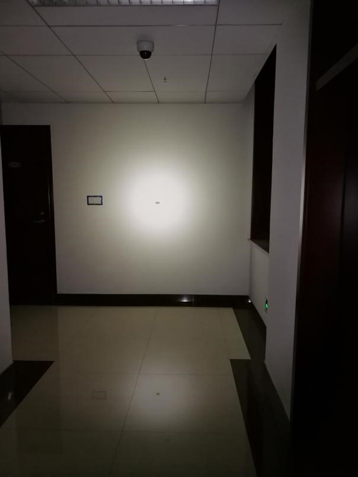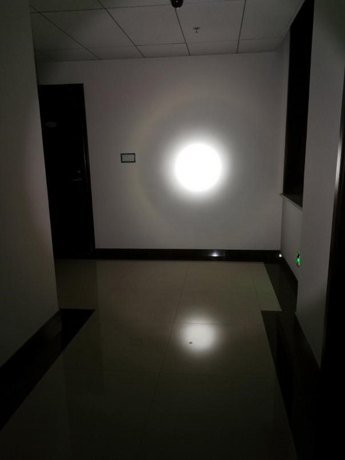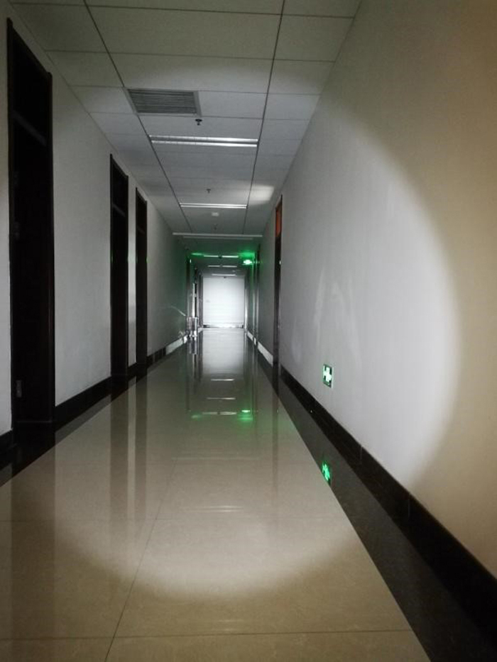 特别是距离稍远时,纳丽德P60用弱光档即可照亮整个30米走道。而公发手电远处光斑较亮,从走道的应急灯相对亮度即可予以鉴别,公发手电用强光档照明下,走道应急灯看起来还是亮些。