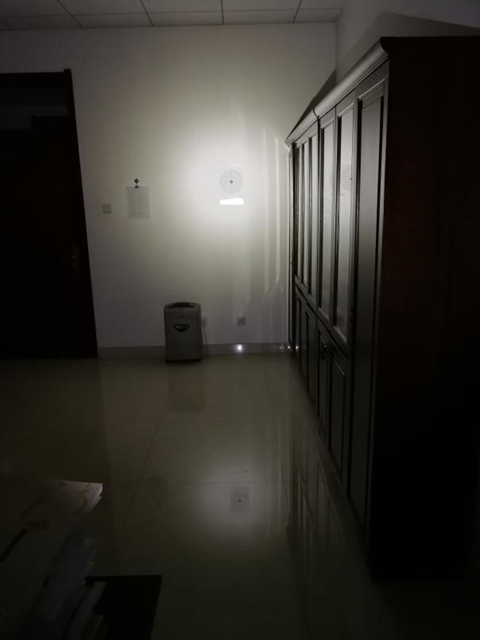 公发手电对着靶纸照,用手机拍摄根本分辨不出靶纸位置,而纳丽德P60同样是对着靶纸照明,同一部手机却可以清晰拍出靶纸。