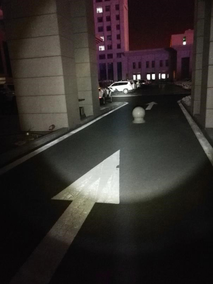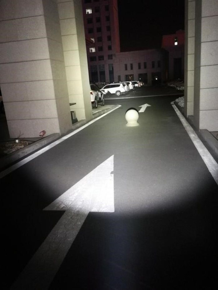 为了对比两支手电的照亮范围,笔者有意把光照起始处放在了路标箭头处,纳丽德P60(上图)明显比公发手电(下图)照亮的范围更大、更远,也更亮,这一点最直接的证据就是远处的第二个路标箭头。