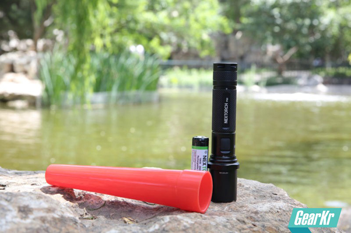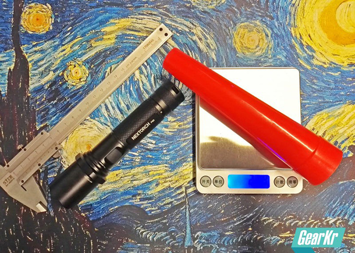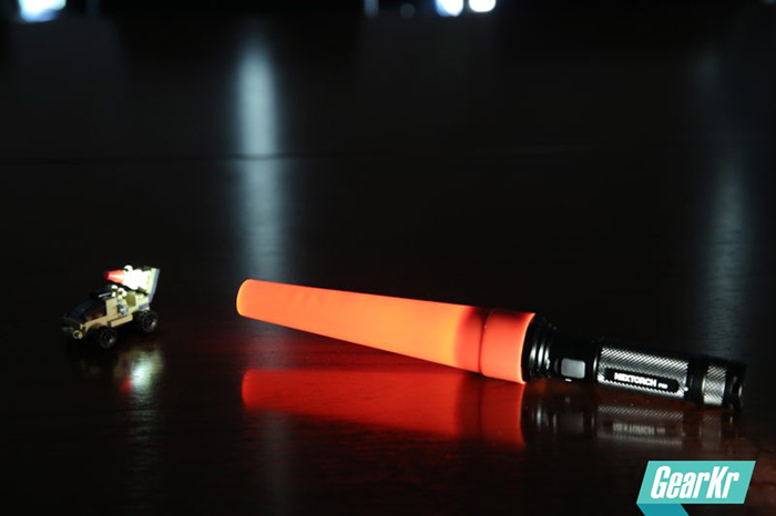 这次测试厂家配了一只红色指挥棒,比P60电筒本身略长,卡在头部,能把灯头完全罩住很紧。指挥棒前端开口,可以投射出光线,仍然可作为手电正向使用,而侧面则是大面积的红色醒目光线。