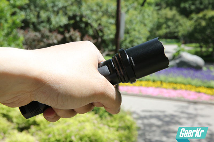 又大又粗的好处就是握感饱满扎实,这与勤务使用的定位比较相符,握住筒身时,开关和灯头能够完全暴露出来,方便操作。