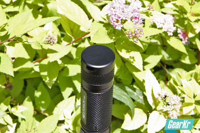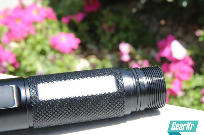 筒身可以根据商标的位置分为正面和反面。正面靠近灯头部位铣出了一个平面,装配有长方形的大面积开关按键,外部是与筒身一体颜色的硅胶帽,按键兼有战术点射功能,键程适中,触感柔软,可以实现战术点射无声,按下有咔哒的声响。反面则是铣了一个平面,但并没有配饰,可以后期自己找人刻个名字。