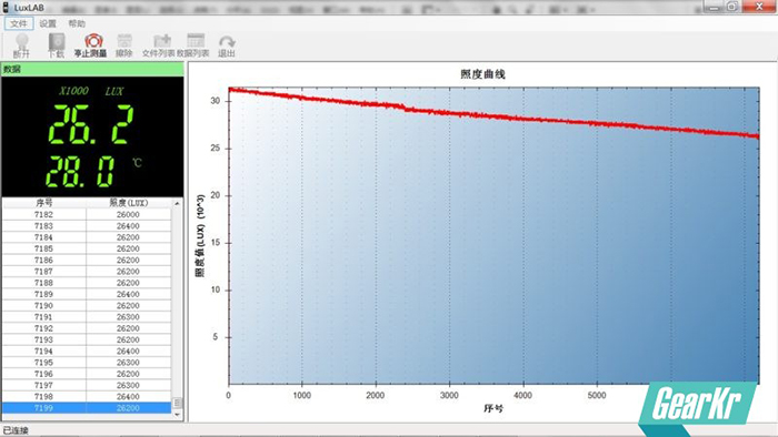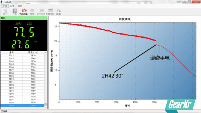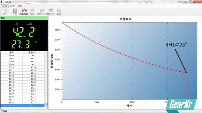 使用专业照度计,每0.5秒记录一个数据,共记录约200分钟,由于照度计只能记录7200组数据(1小时左右),所以测试分为多图,按顺序排列,不影响总体测试。用2600mAh原电充满开始做测试,距离感光部件约40cm。